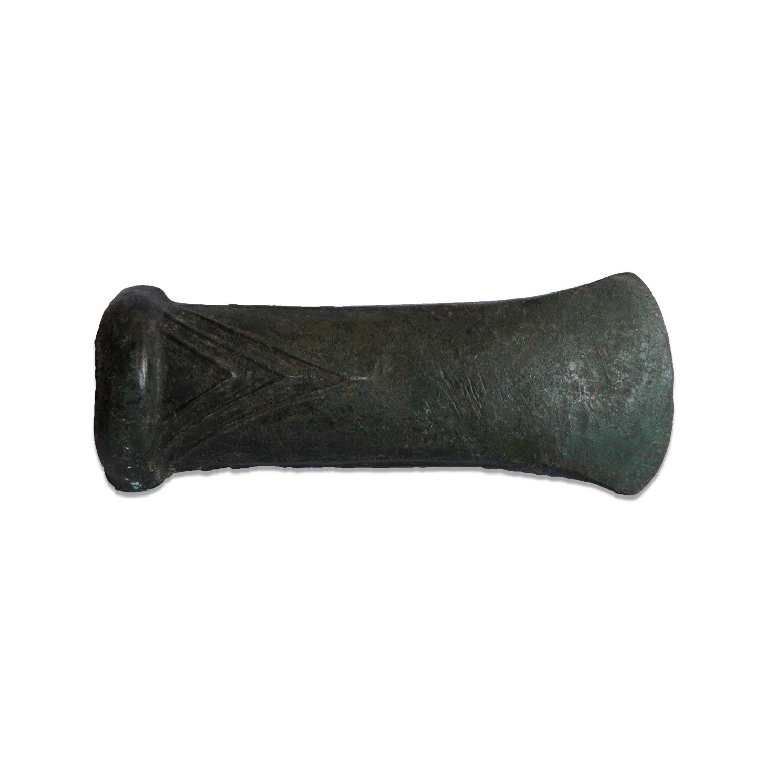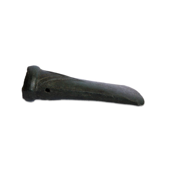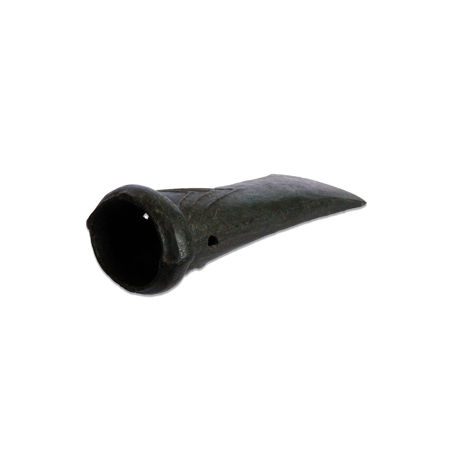 DESCRIPTIONSocketed axe with slightly concave sides, circular mouth with raised collar and lateral holes for cross-pin, cutting edge slightly curved. Nervature forming a V’s on both sides, below the collar.