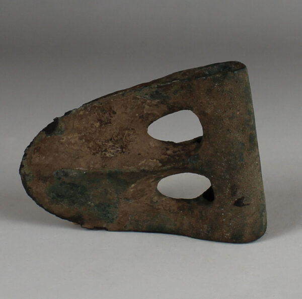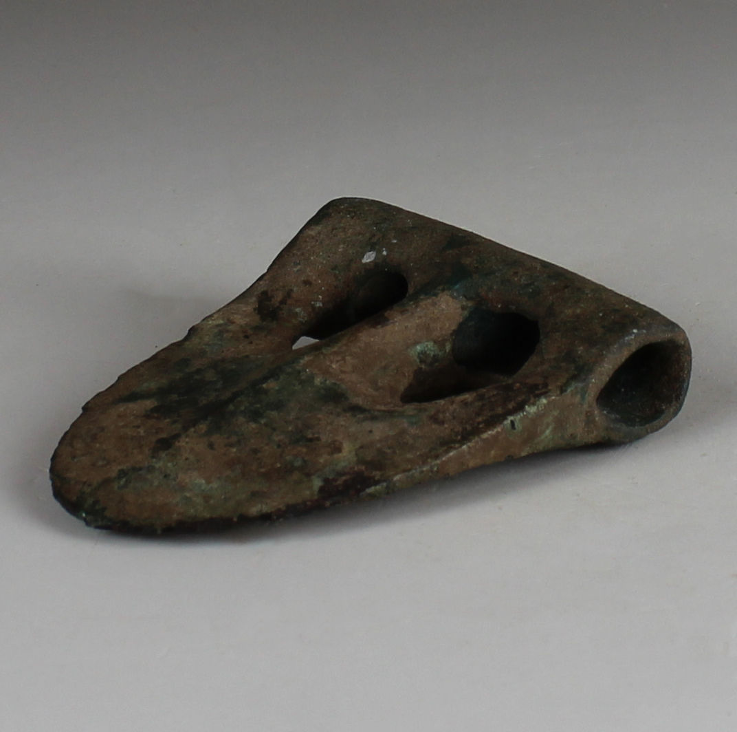 The battle axe of transitional type between the wider “Eyeglasses” and the narrower “Duck Bill” types, with oblong rounded blade with central ridge, fenestrated with two oblong openings, and a socket at the back.