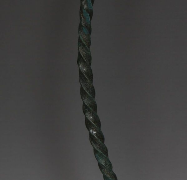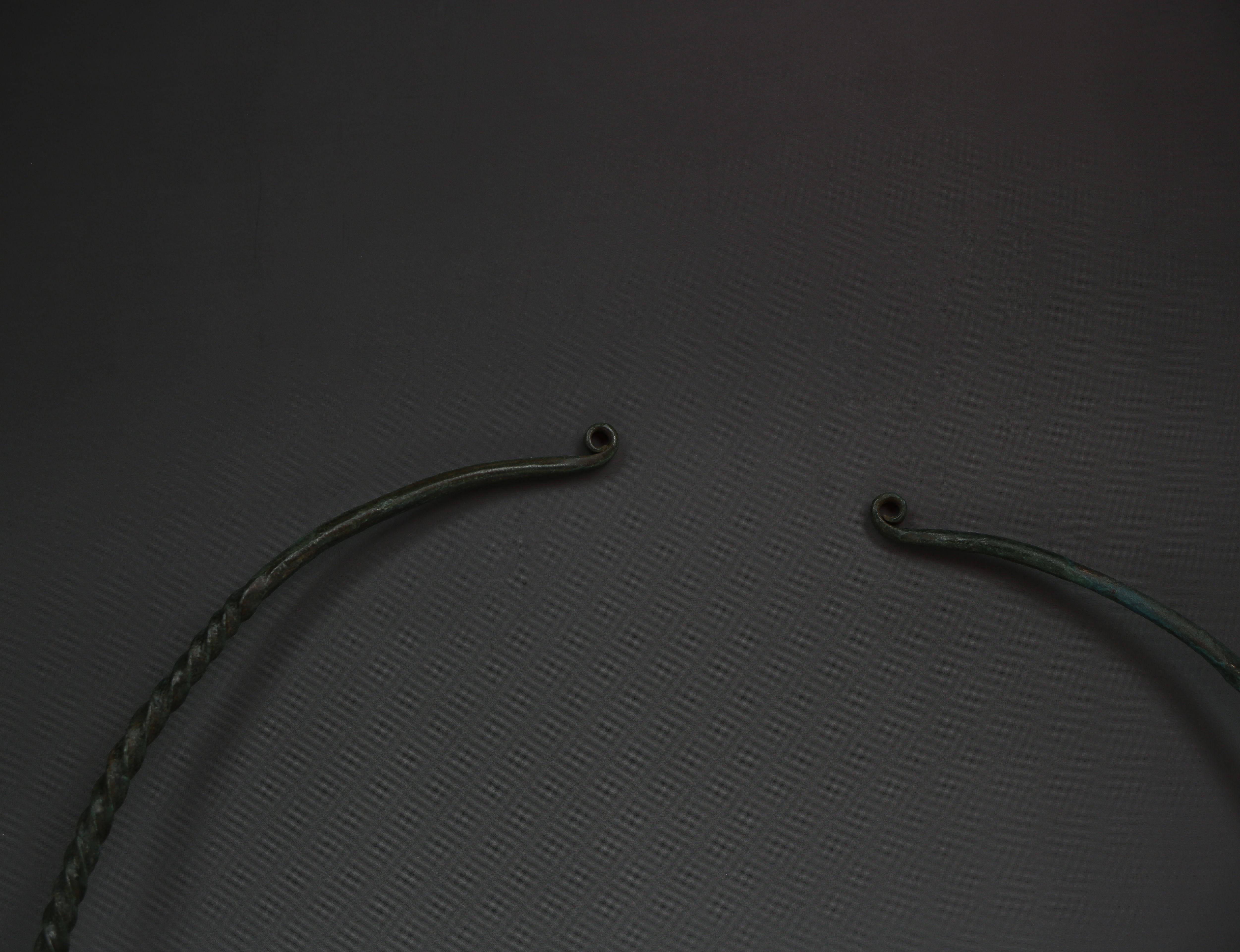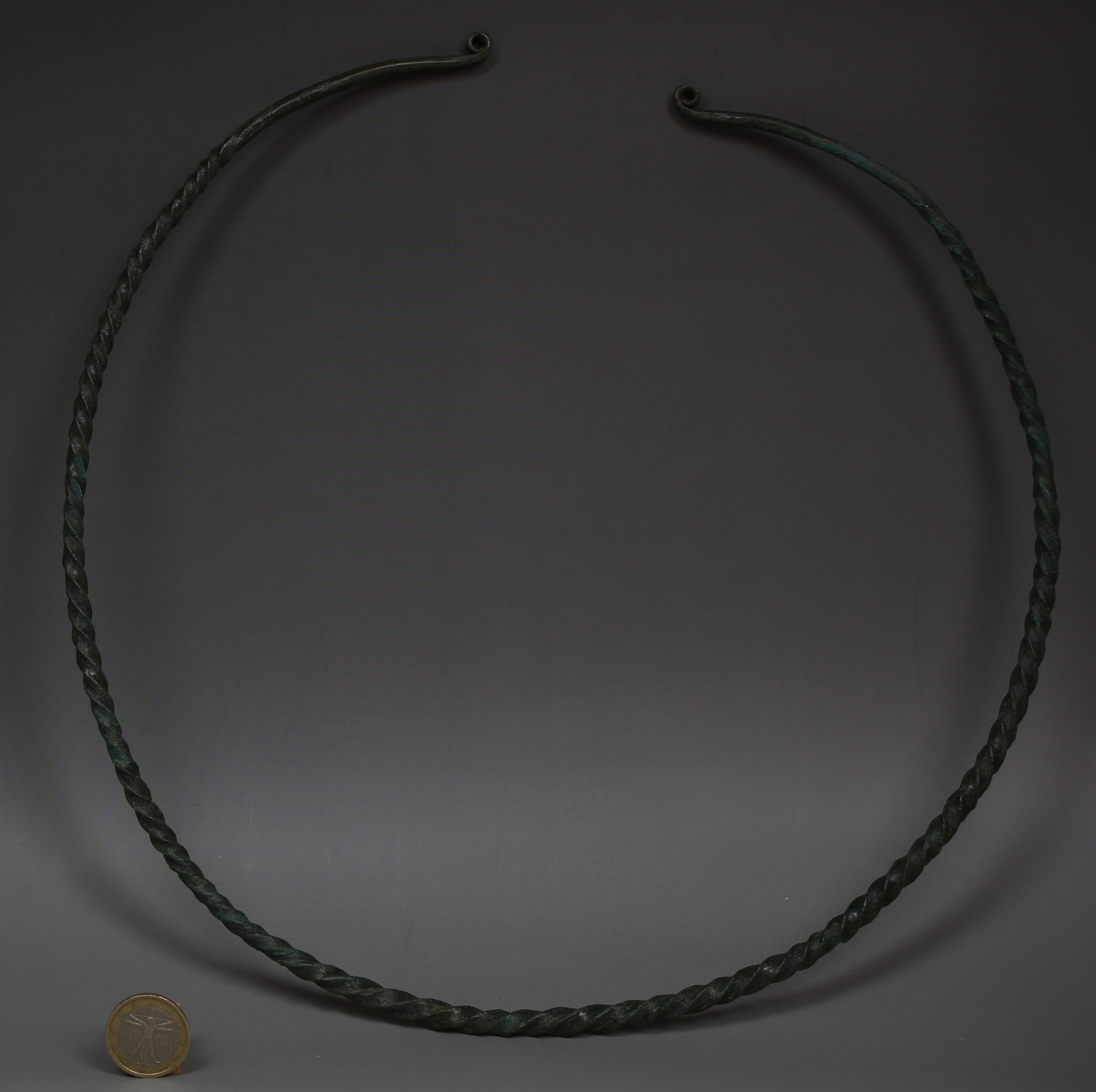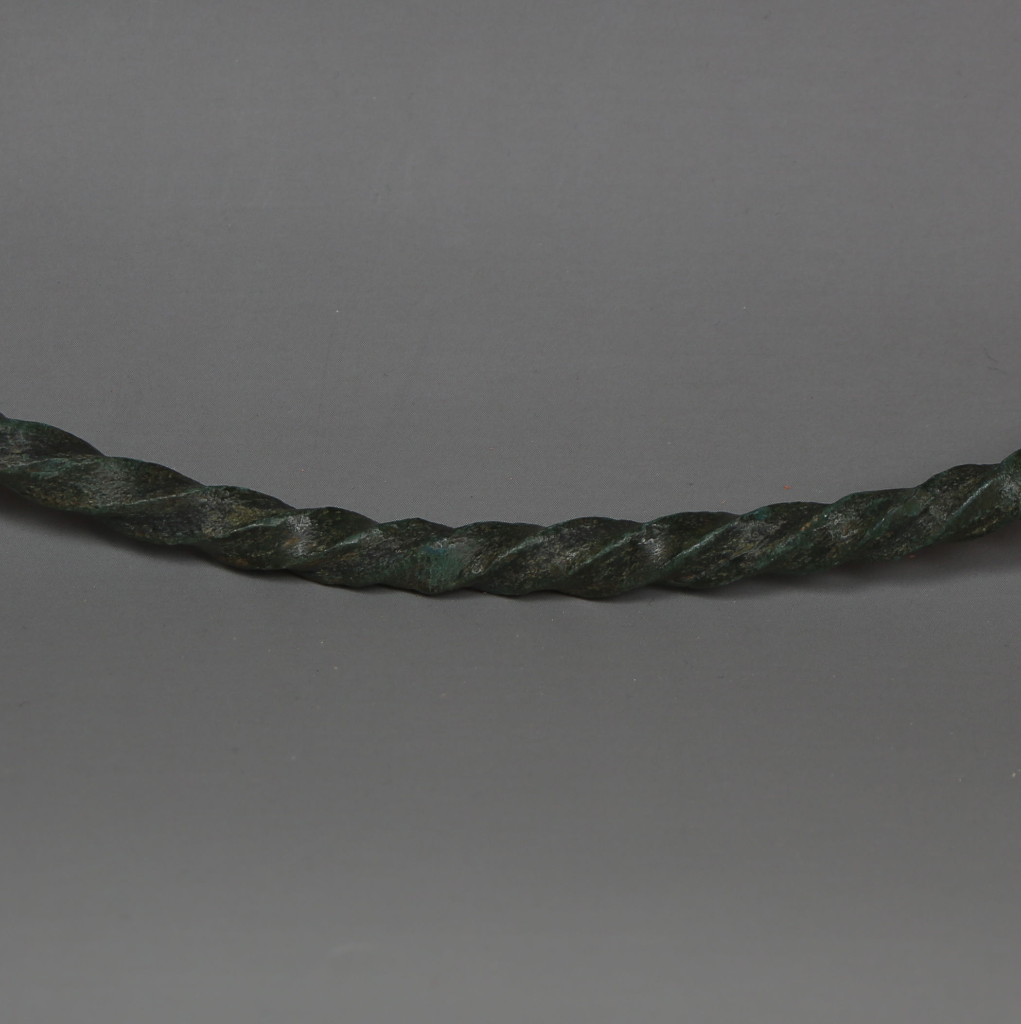 Twisted bronze torques are elaborate neck ornaments made from twisted or braided strands of bronze wire, typically fashioned into a circular or spiral-shaped band. These torques were prestigious symbols of wealth, power, and social status in Bronze Age societies, worn by elite individuals such as chieftains, warriors, or religious leaders. The craftsmanship and intricate designs of bronze torques vary across different regions and time periods within the Urnfield culture, reflecting local artistic styles and cultural preferences.