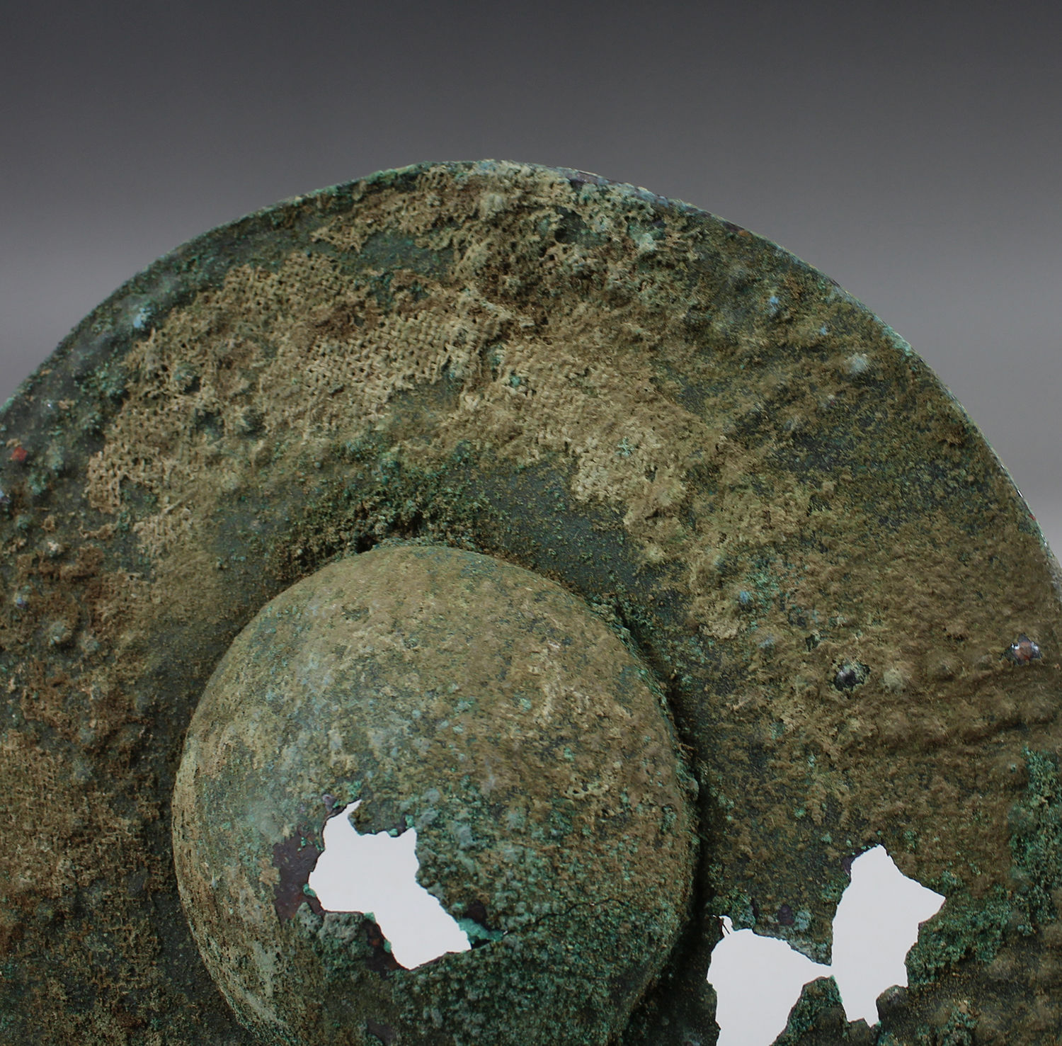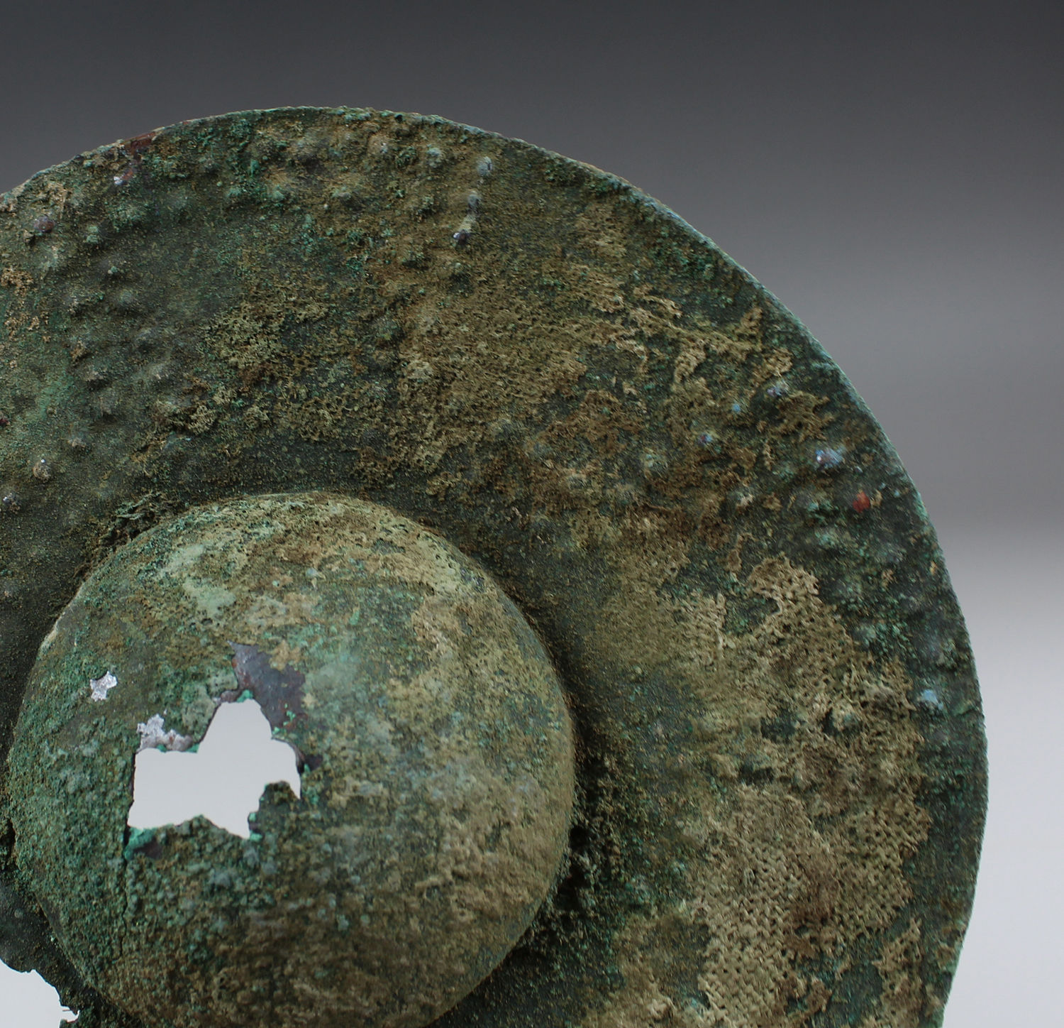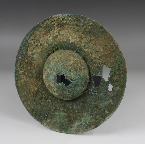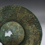 A shield boss, or umbo, is a round, convex or conical piece of material at the centre of a shield. Shield bosses (or sometimes, just “bosses”) are usually made of thick metal but could also be made of wood. The boss was originally designed to deflect blows from the centre of round shields, though they also provided a place to mount the shield’s grip. As time went on and heater shields with curved bodies became more popular, and enarmes superseded the bar grip, the boss became more of an ornamental piece.