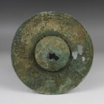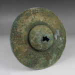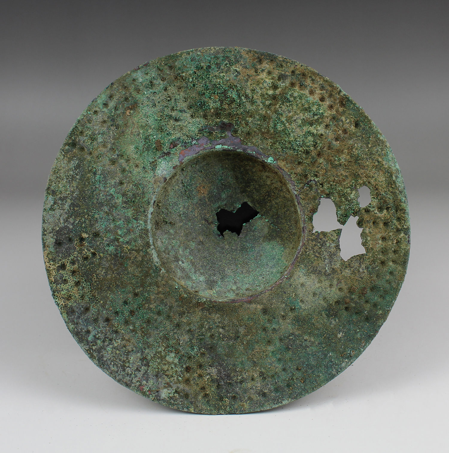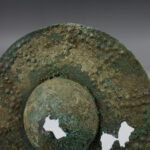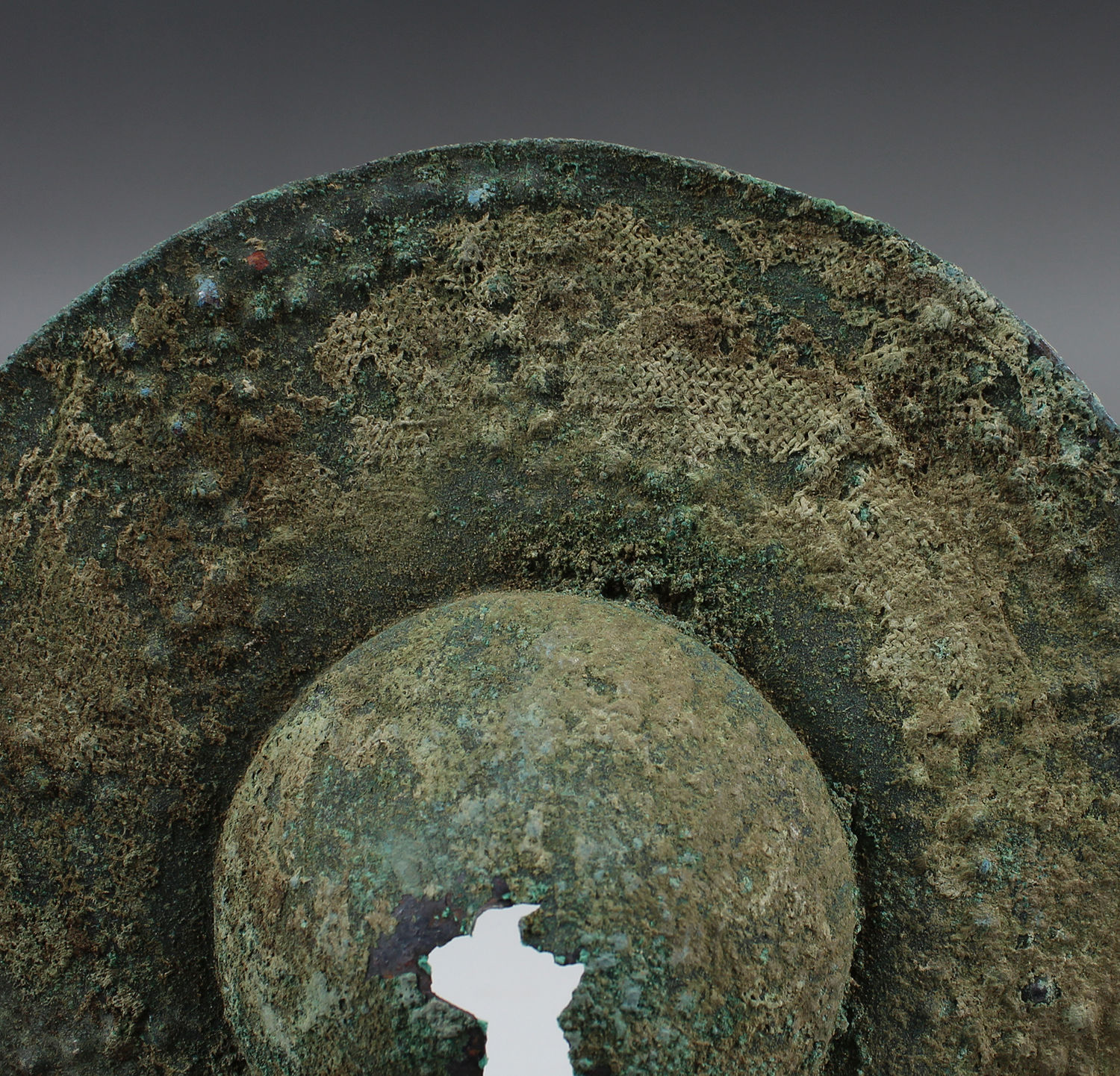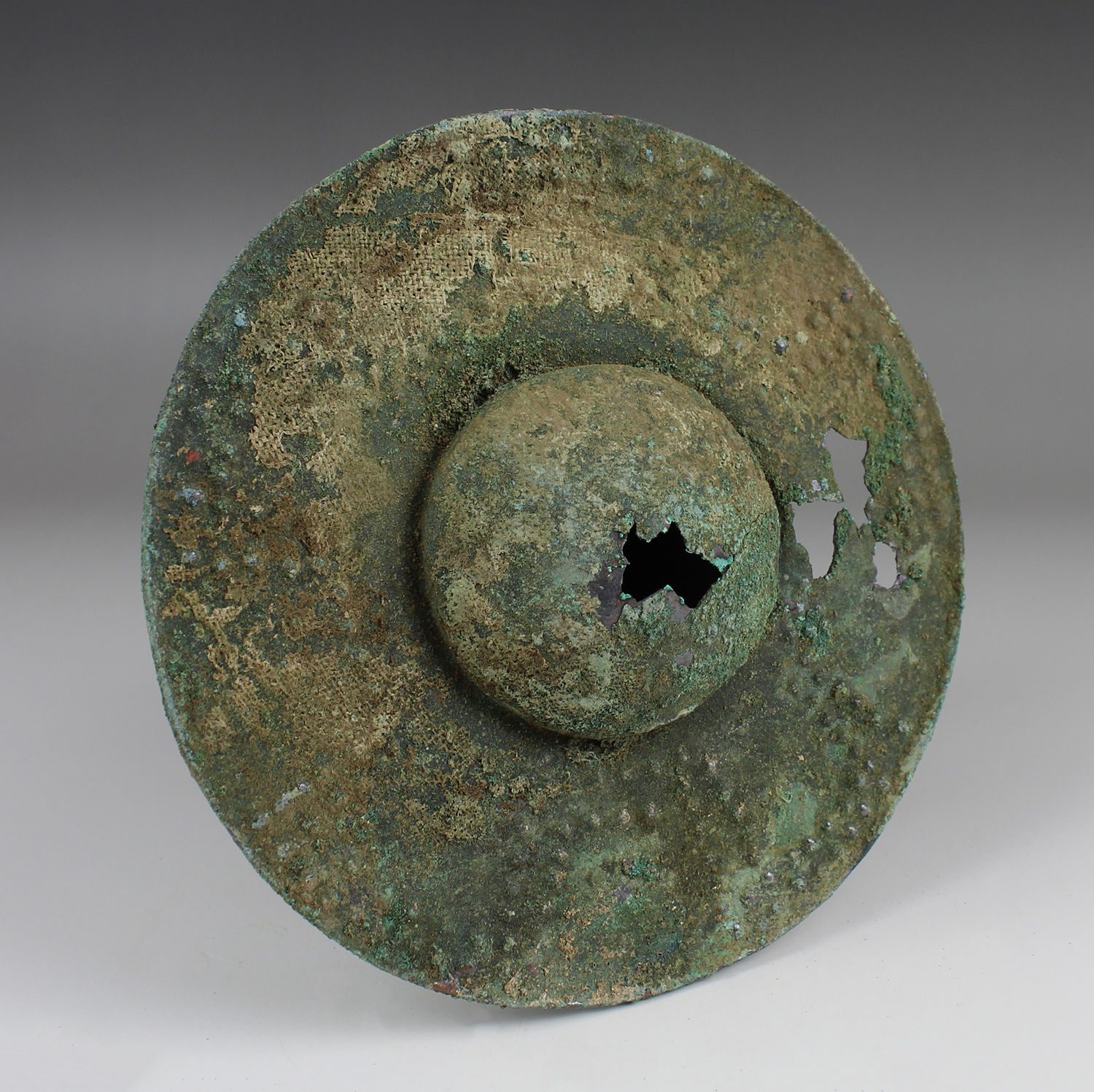 A shield boss, or umbo, is a round, convex or conical piece of material at the centre of a shield. Shield bosses (or sometimes, just “bosses”) are usually made of thick metal but could also be made of wood. The boss was originally designed to deflect blows from the centre of round shields, though they also provided a place to mount the shield’s grip. As time went on and heater shields with curved bodies became more popular, and enarmes superseded the bar grip, the boss became more of an ornamental piece.
