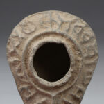 The design and craftsmanship of Byzantine oil lamps were highly refined, often made from materials such as clay, metal, or glass. These lamps frequently featured intricate decorations, including religious symbols, motifs, and inscriptions. The inclusion of the inscription “The light of Christ shines for all” on the lamp would have been achieved through engraving or molding, demonstrating the skill of Byzantine artisans. This inscription not only personalized the lamp but also reinforced the idea that light, both physical and spiritual, is a manifestation of Christ’s presence and guidance in the world. The lamp’s practical function as a source of light was thus imbued with deep religious significance.