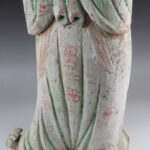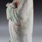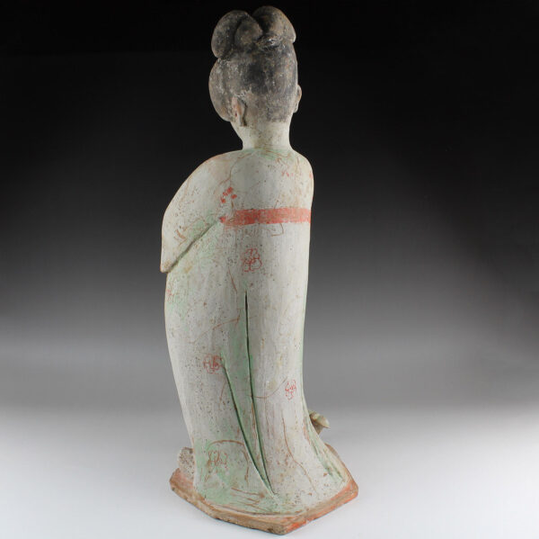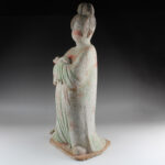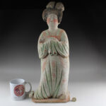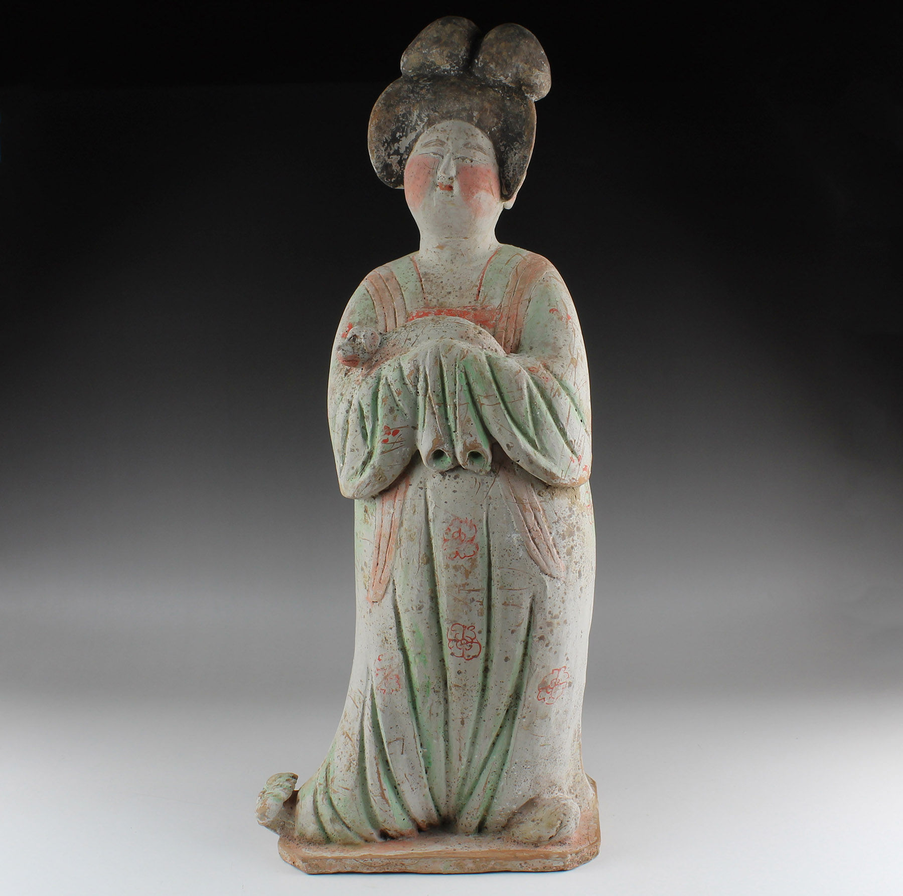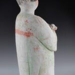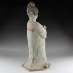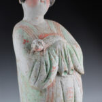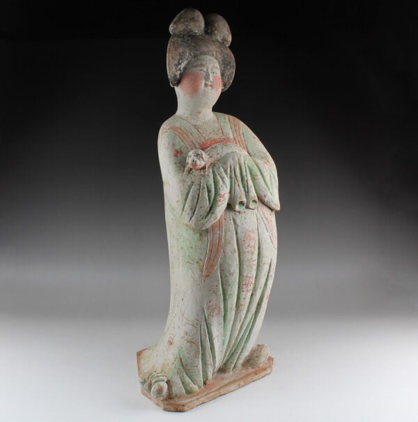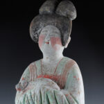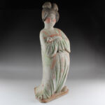 During the Tang Dynasty, restrictions were placed on the number of objects that could be included in tombs, an amount determined by an individual’s social rank. In spite of the limitations, a striking variety of tomb furnishings – known as mingqi – have been excavated. Entire retinues of ceramic figures – representing warriors, animals, entertainers, musicians, guardians and every other necessary category of assistant – were buried with the dead in order to provide for the afterlife. Warriors (lokapala) were put in place to defend the dead, while horses/ camels were provided for transport, and officials to run his estate in the hereafter. Of all the various types of mingqi, however, there are none more elegant or charming than the sculptures of sophisticated female courtiers, known – rather unfairly – as “fat ladies”. These wonderfully expressionistic sculptures represent the idealised beauty of Tang Dynasty China, while also demonstrating sculptural mastery in exaggerating characteristics for effect, and for sheer elegance of execution.