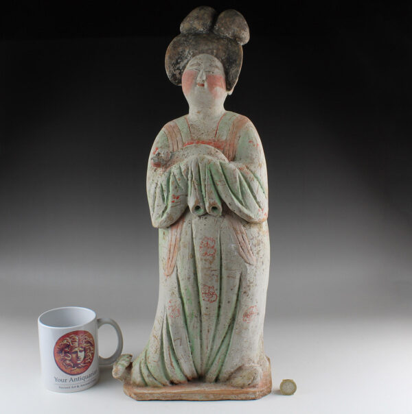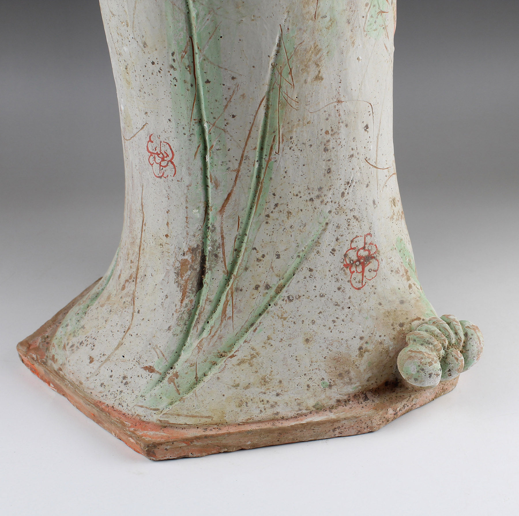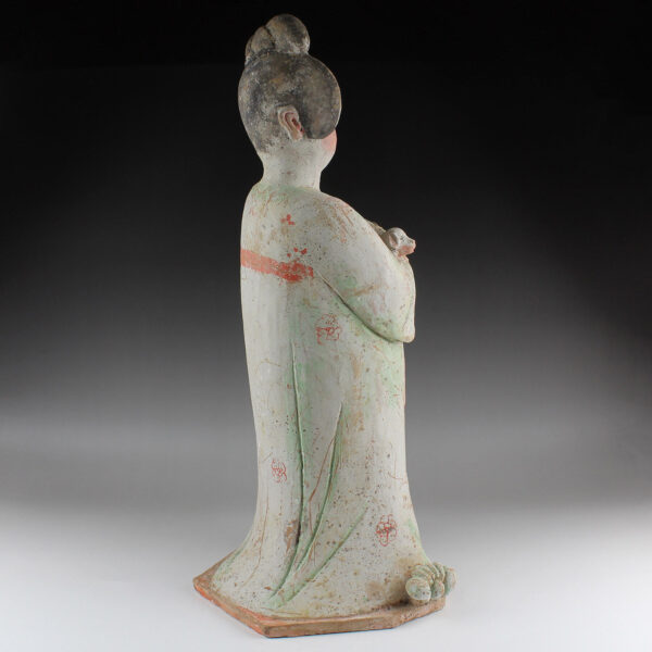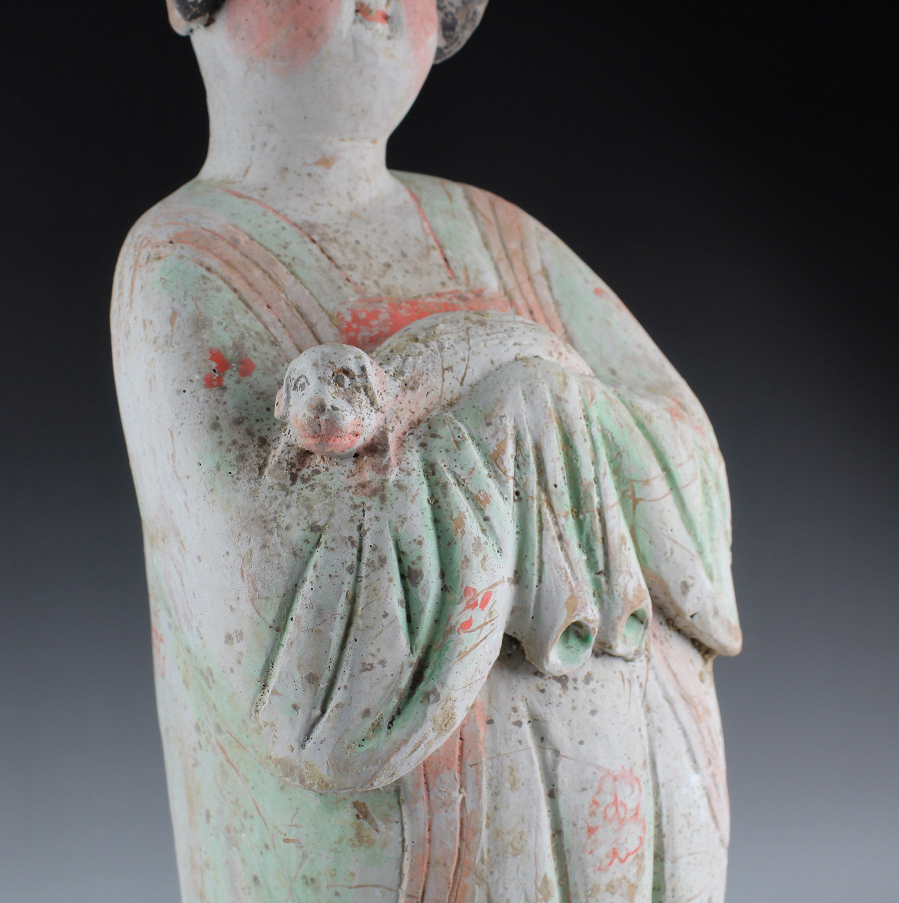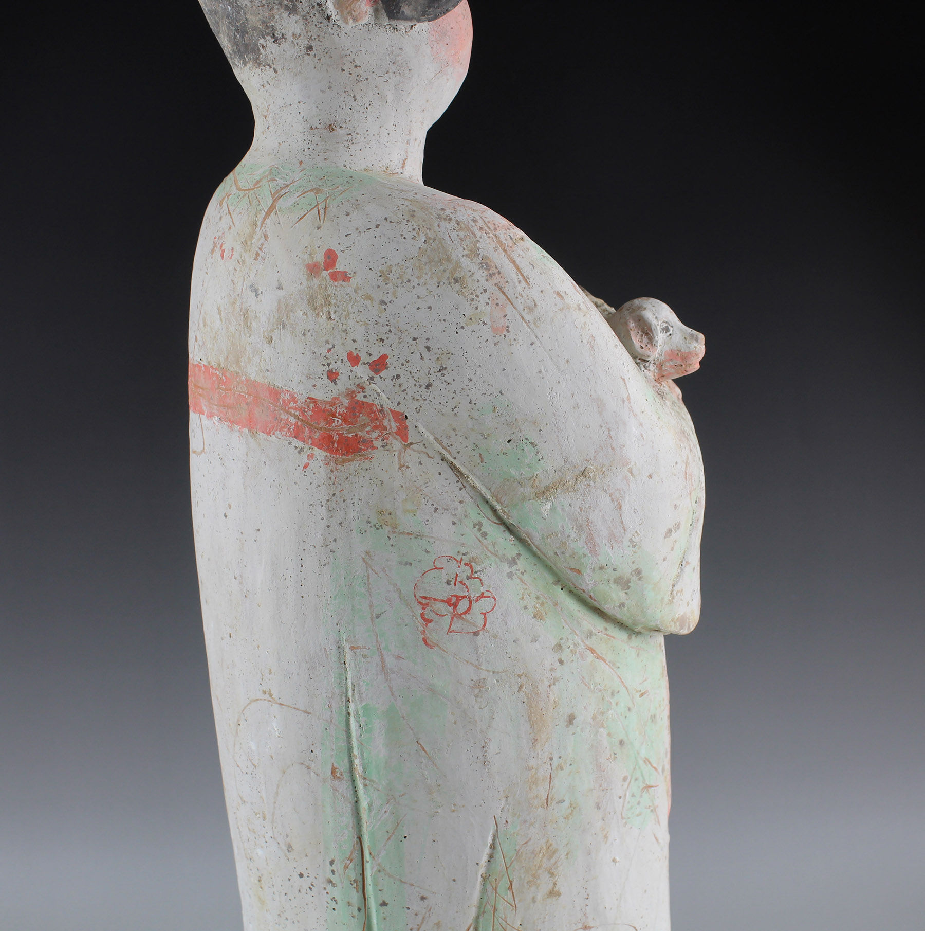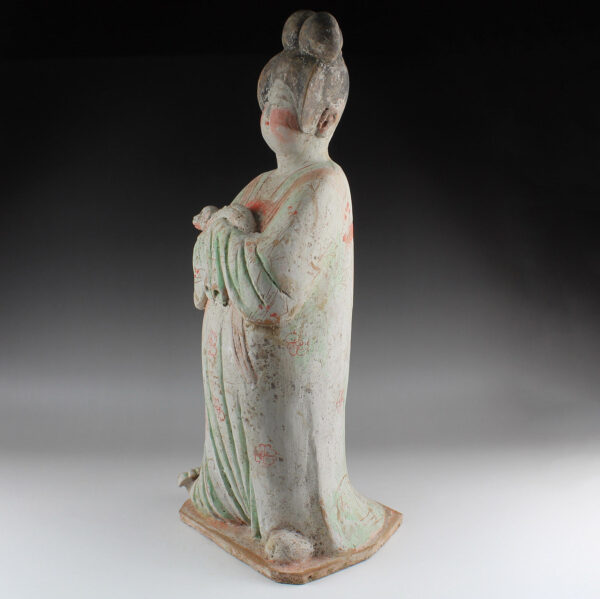 This beautifully-finished ceramic attendant was made during what many consider to be China’s Golden Age, the Tang Dynasty. It was at this point that China’s outstanding technological and aesthetic achievements opened to external influences, resulting in the introduction of numerous new forms of self-expression, coupled with internal innovation and considerable social freedom. The Tang dynasty also saw the birth of the printed novel, significant musical and theatrical heritage and many of China’s best- known painters and artists.