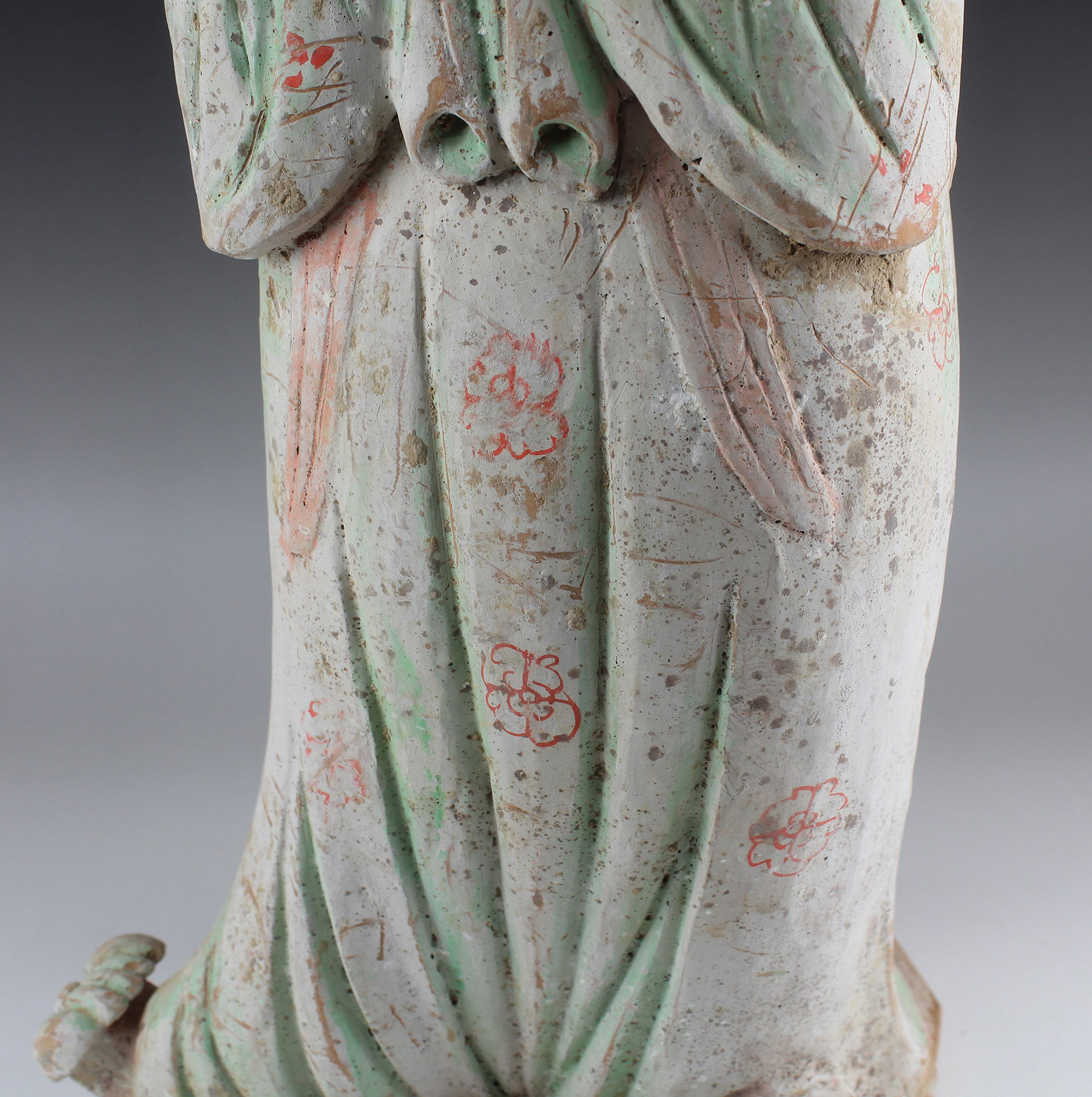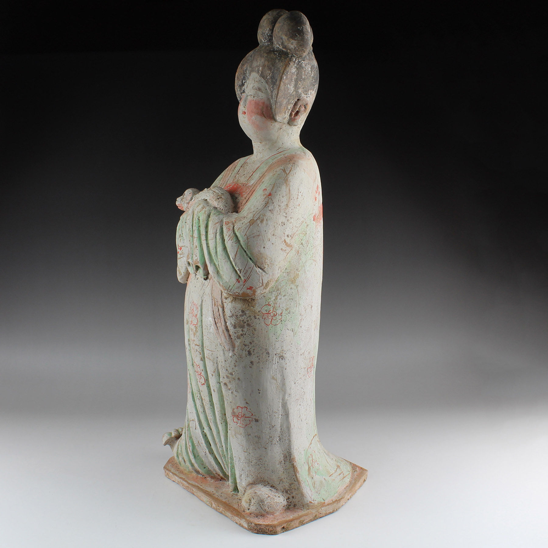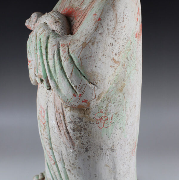 It is likely that the original purpose of the figure was that of a mingqi, terracotta figures designed to be included in a burial in order to accompany the deceased in the afterlife for protection, service and companionship.
