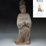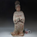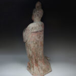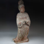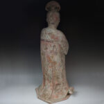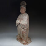 During the Tang Dynasty, restrictions were placed on the number of objects that could be included in tombs, an amount determined by an individual’s social rank. In spite of the limitations, a striking variety of tomb furnishings – known as mingqi – have been excavated. Entire retinues of ceramic figures – representing warriors, animals, entertainers, musicians, guardians and every other necessary category of assistant – were buried with the dead in order to provide for the afterlife. Warriors (lokapala) were put in place to defend the dead, while horses/ camels were provided for transport, and officials to run his estate in the hereafter. Of all the various types of mingqi, however, there are none more elegant or charming than the sculptures of sophisticated female courtiers, known – rather unfairly – as “fat ladies”. These wonderfully expressionistic sculptures represent the idealised beauty of Tang Dynasty China, while also demonstrating sculptural mastery in exaggerating characteristics for effect, and for sheer elegance of execution.