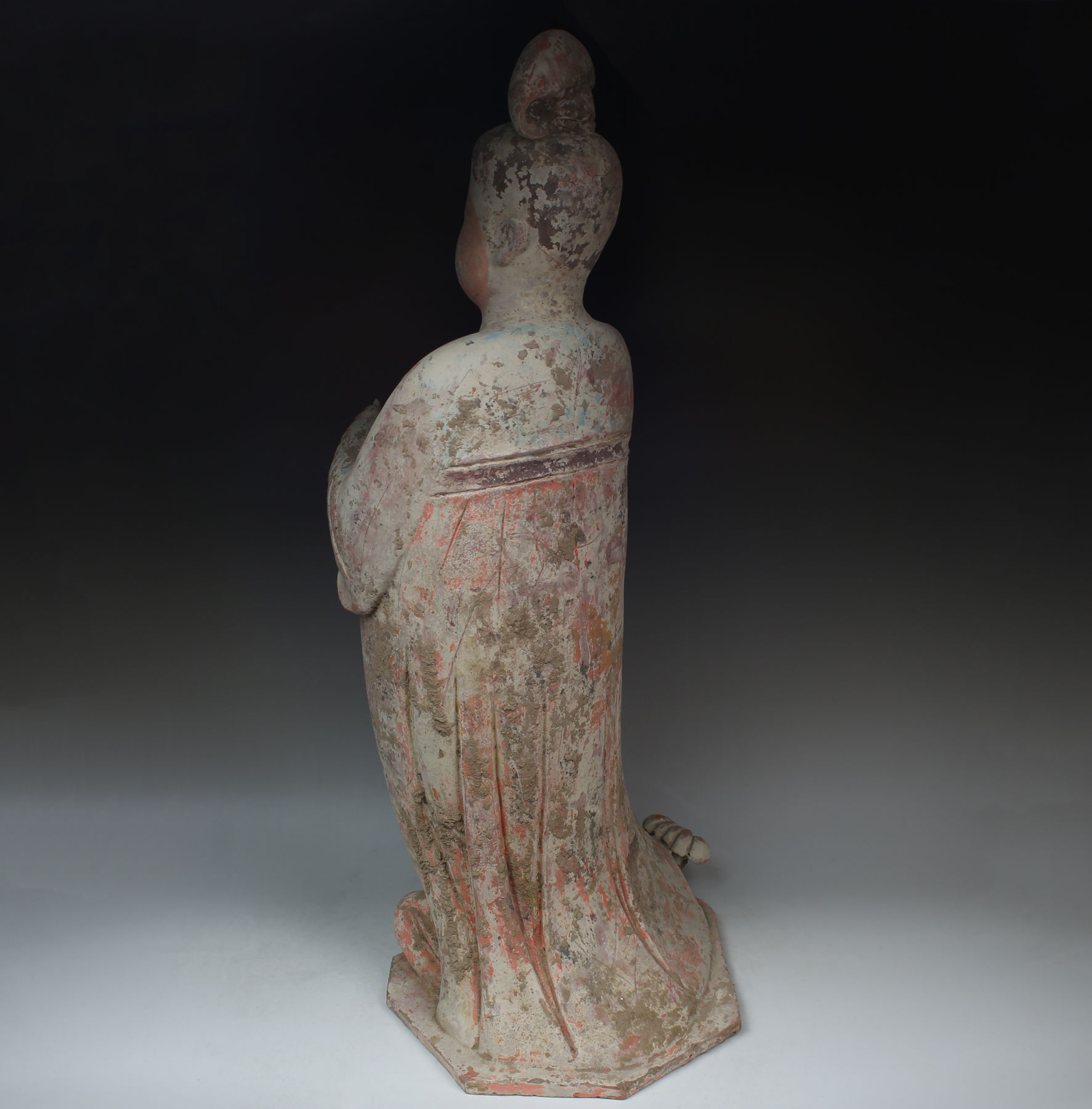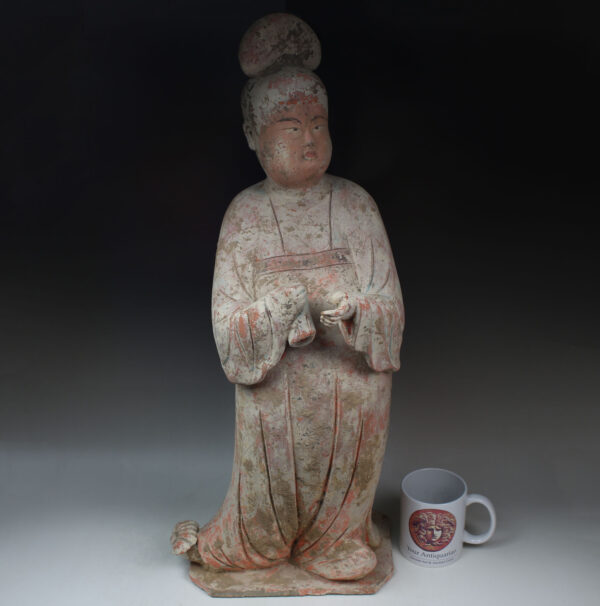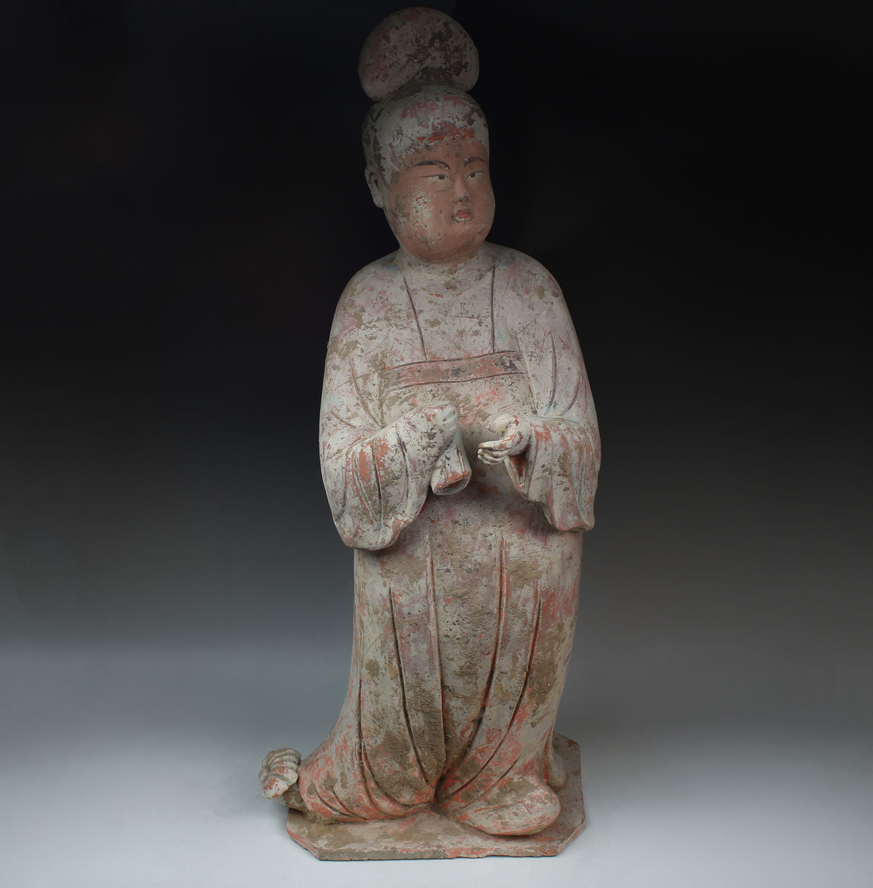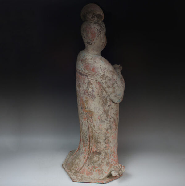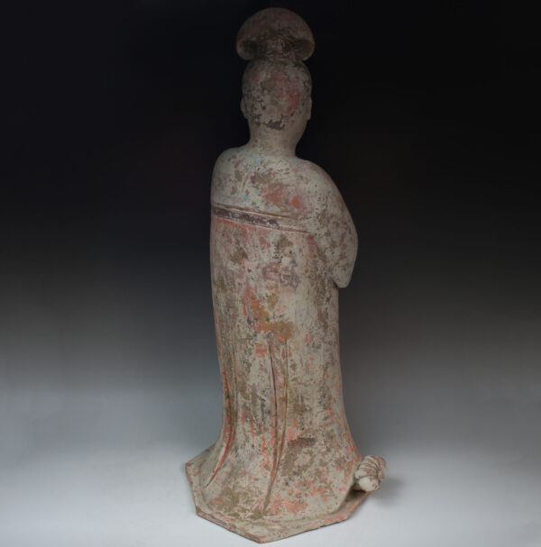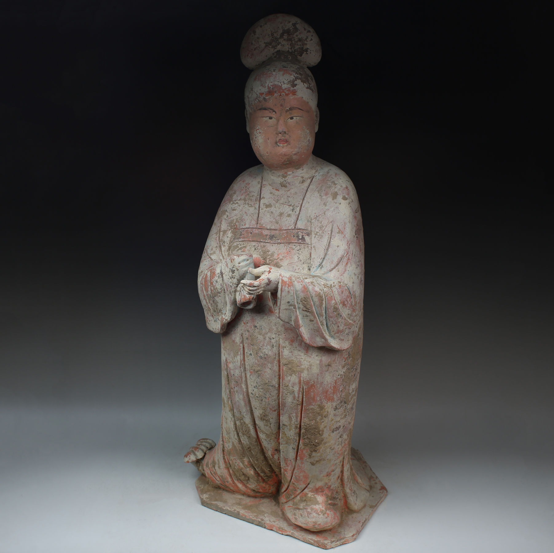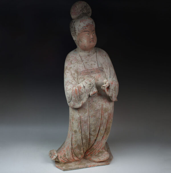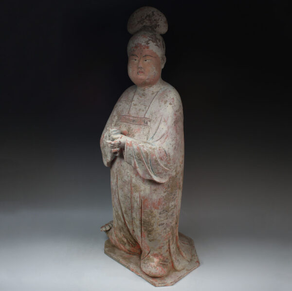 This beautifully-finished ceramic attendant was made during what many consider to be China’s Golden Age, the Tang Dynasty. It was at this point that China’s outstanding technological and aesthetic achievements opened to external influences, resulting in the introduction of numerous new forms of self-expression, coupled with internal innovation and considerable social freedom. The Tang dynasty also saw the birth of the printed novel, significant musical and theatrical heritage and many of China’s best- known painters and artists.
