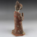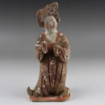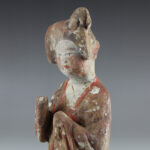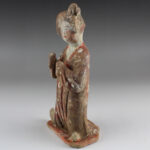 During the Tang Dynasty, restrictions were placed on the number of objects that could be included in tombs, an amount determined by an individual’s social rank. In spite of the limitations, a striking variety of tomb furnishings – known as mingqi – have been excavated. Entire retinues of ceramic figures – representing warriors, animals, entertainers, musicians, guardians and every other necessary category of assistant – were buried with the dead in order to provide for the afterlife. Warriors (lokapala) were put in place to defend the dead, while horses/ camels were provided for transport, and officials to run his estate in the hereafter. Of all the various types of mingqi, however, there are none more elegant or charming than the sculptures of sophisticated female courtiers, known – rather unfairly – as “fat ladies”. These wonderfully expressionistic sculptures represent the idealised beauty of Tang Dynasty China, while also demonstrating sculptural mastery in exaggerating characteristics for effect, and for sheer elegance of execution.