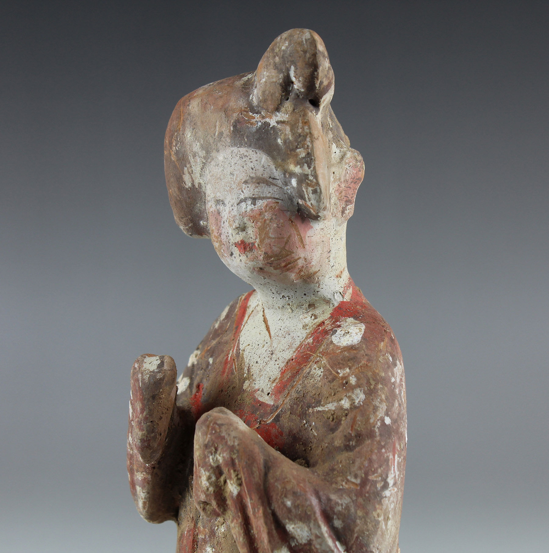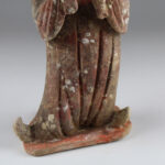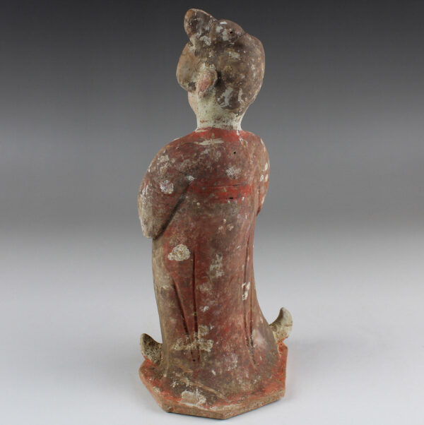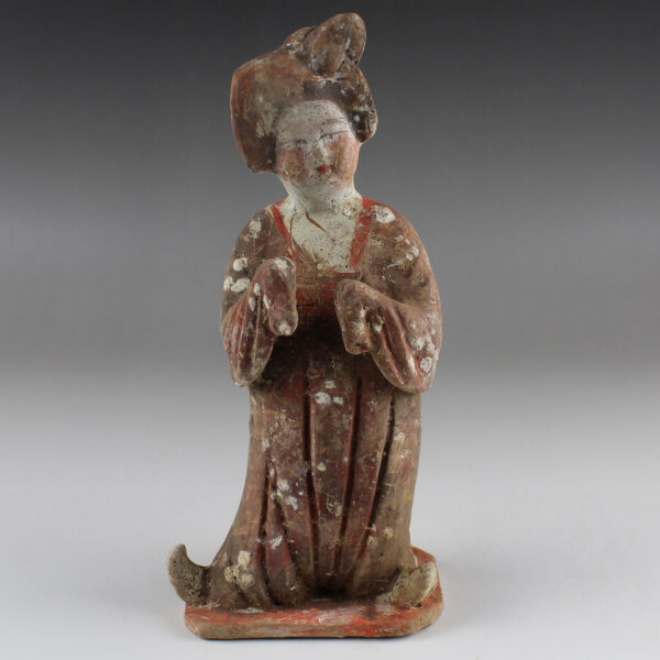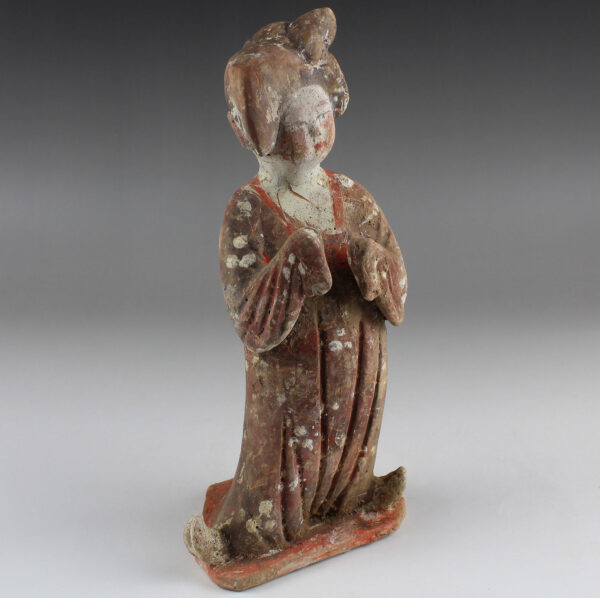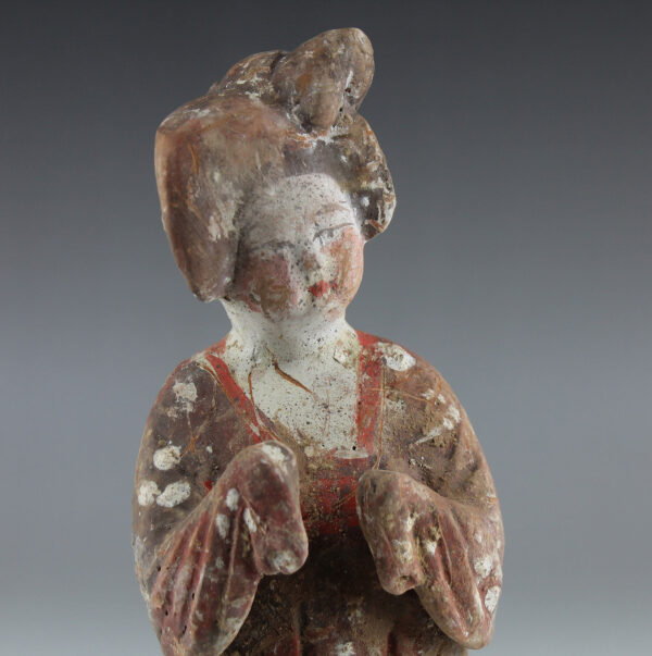 This beautifully-finished ceramic attendant was made during what many consider to be China’s Golden Age, the Tang Dynasty. It was at this point that China’s outstanding technological and aesthetic achievements opened to external influences, resulting in the introduction of numerous new forms of self-expression, coupled with internal innovation and considerable social freedom. The Tang dynasty also saw the birth of the printed novel, significant musical and theatrical heritage and many of China’s best- known painters and artists.