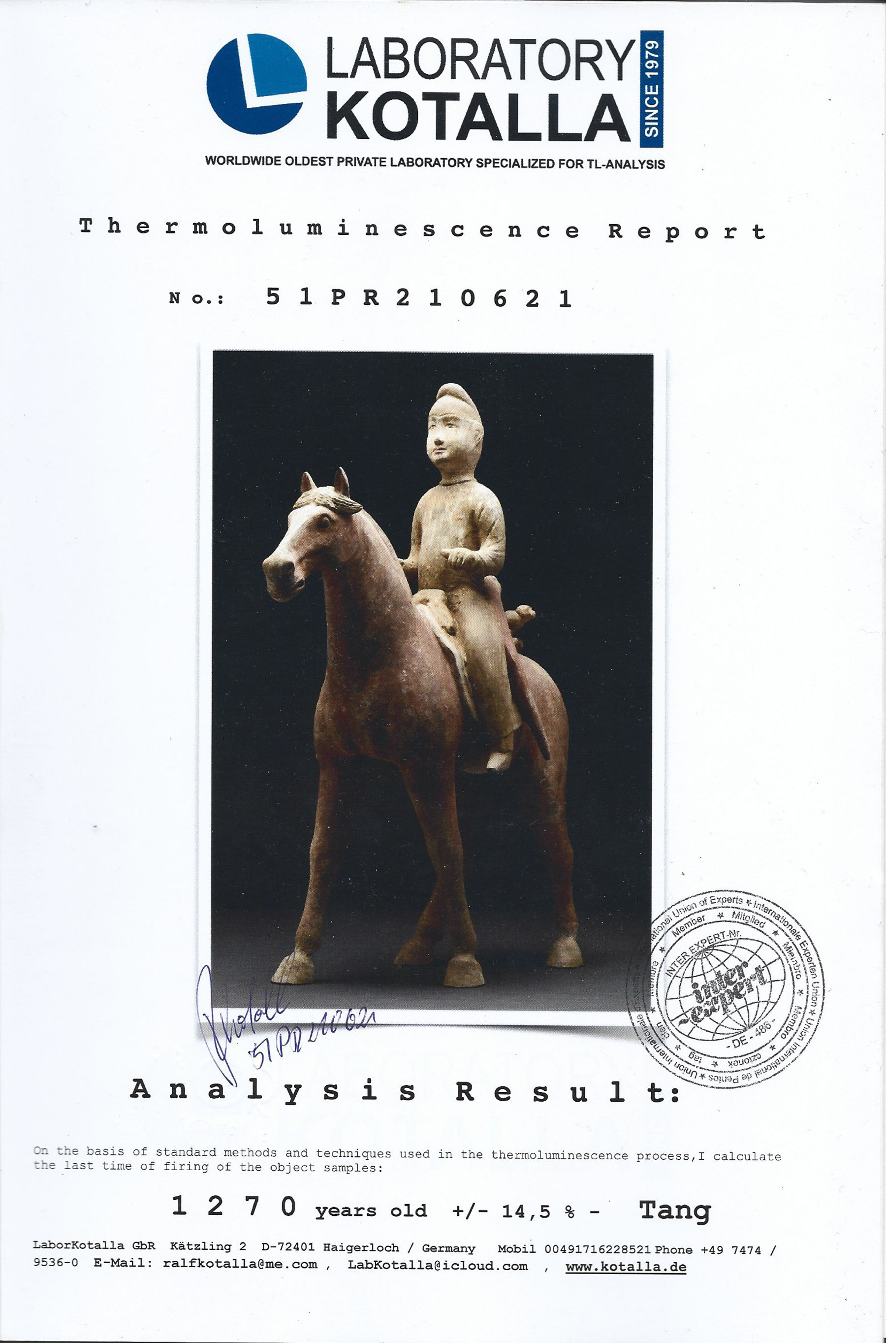 | CONDITION | Good condition. Includes Thermoluminescence test by Laboratory Kotalla (Reference 51PR210621) |