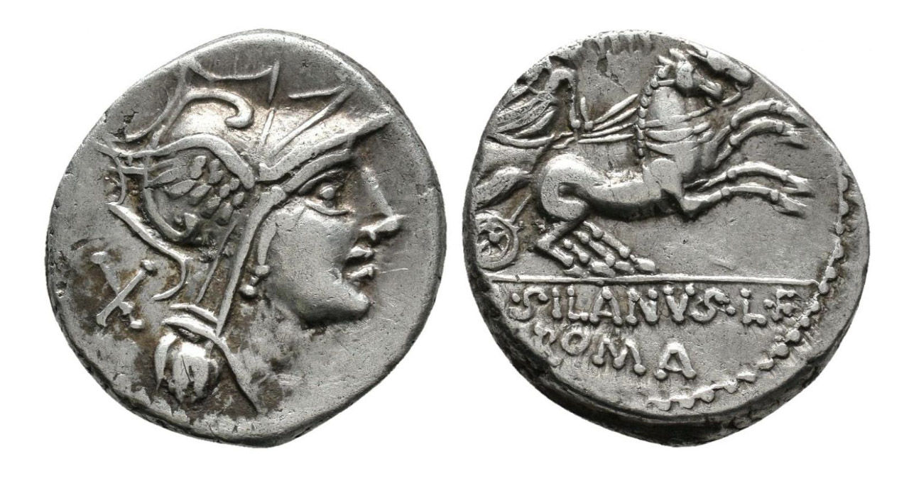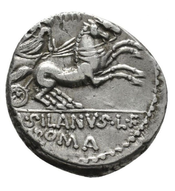 | REVERSE | Victory in biga right, holding reins in both hands, number above, D SILANVS L F below, ROMA in ex. |