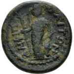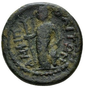 | REVERSE | MΦIΠOΛITΩN, Artemis standing left, holding long torch and branch, shield at her feet |