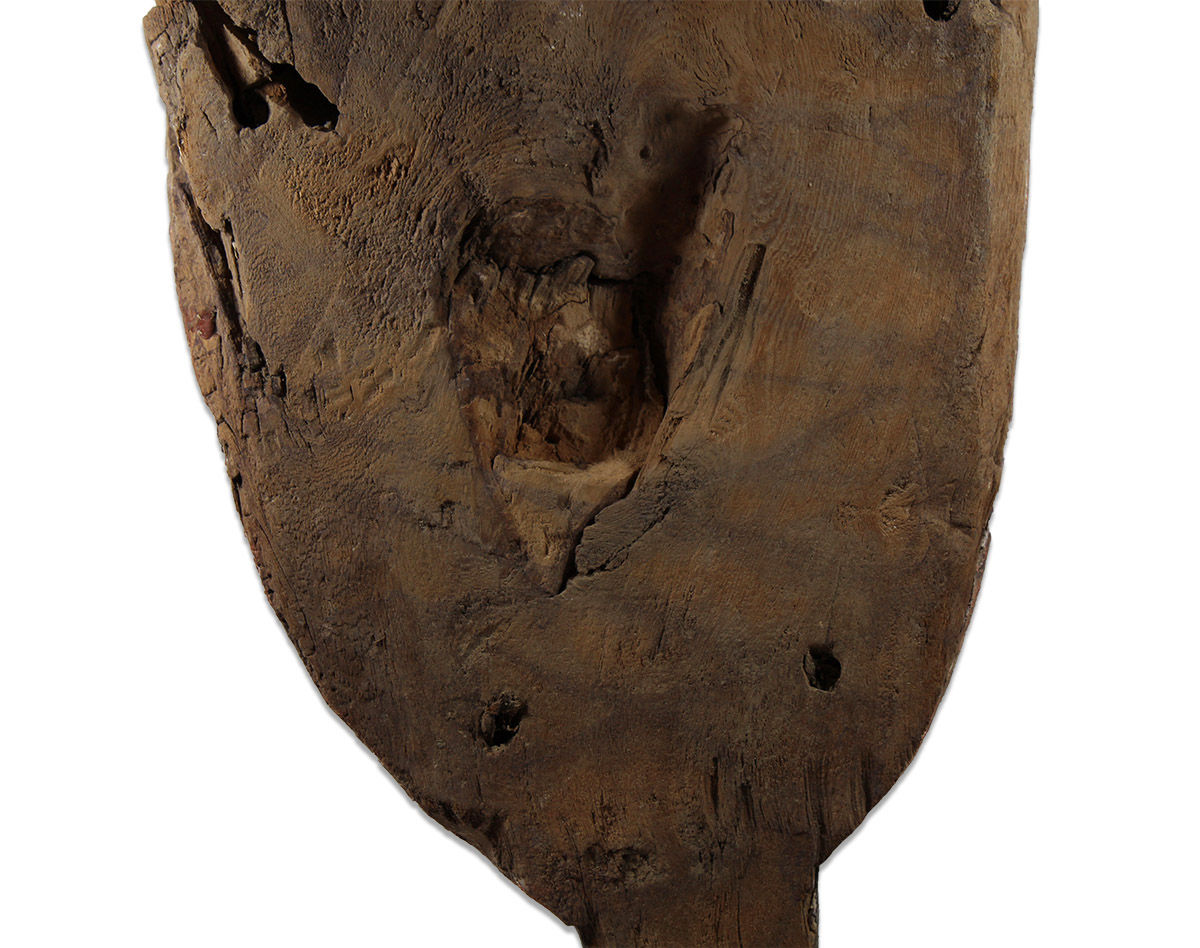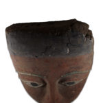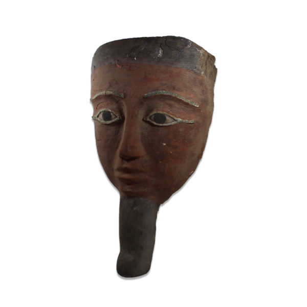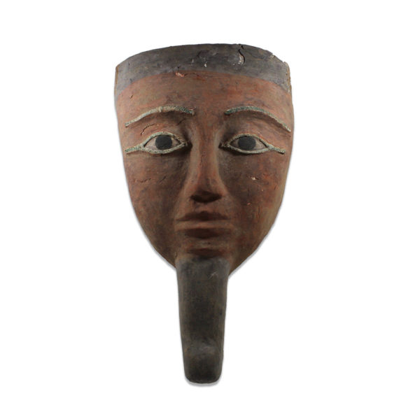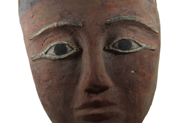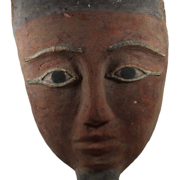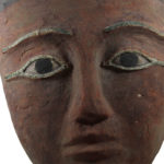 | DESCRIPTION | Large carved sarcophagus mummy wood mask, waring a black painted headdress and royal beard with bronze eyes |