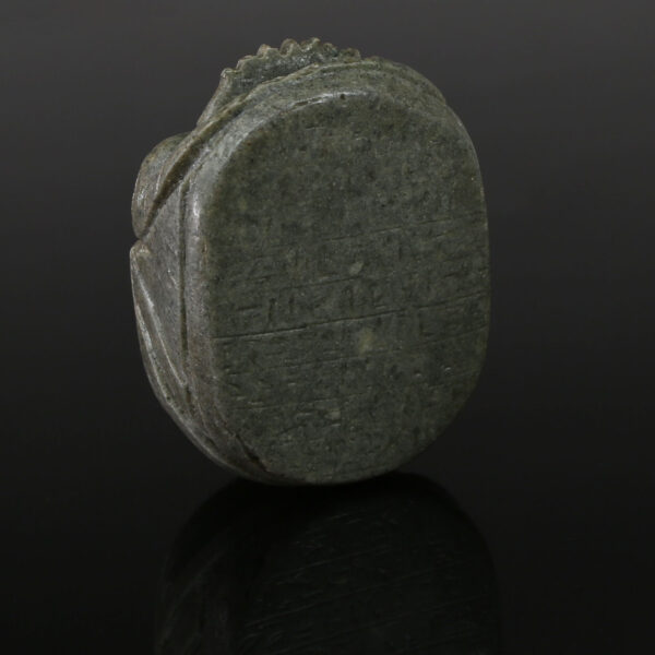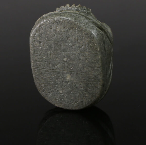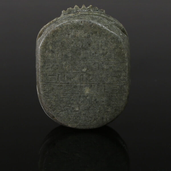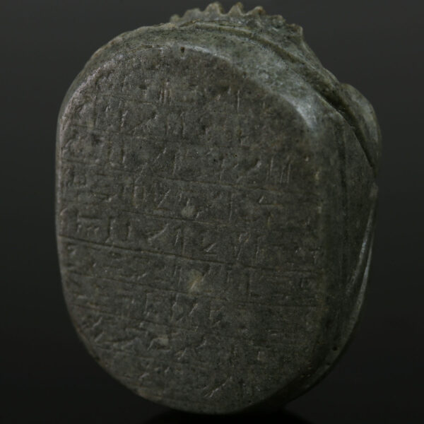 Many heart scarabs bear an inscription of Chapter 30B of the Book of the Dead, a spell that addresses the deceased’s heart directly, imploring it not to testify against them during the “Weighing of the Heart” ceremony before Osiris. The spell includes lines such as: “O my heart which I had from my mother! O my heart which I had upon earth! Do not stand against me as a witness!” This plea reflects the deep anxiety surrounding the judgment process, where the heart would be weighed against the feather of Maat (truth and justice). If found heavier, the deceased would face annihilation; if balanced, they could enter the afterlife.