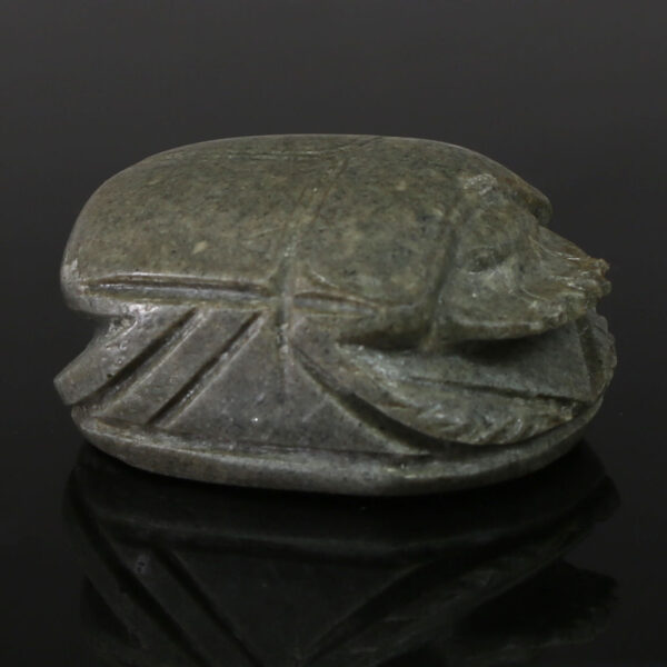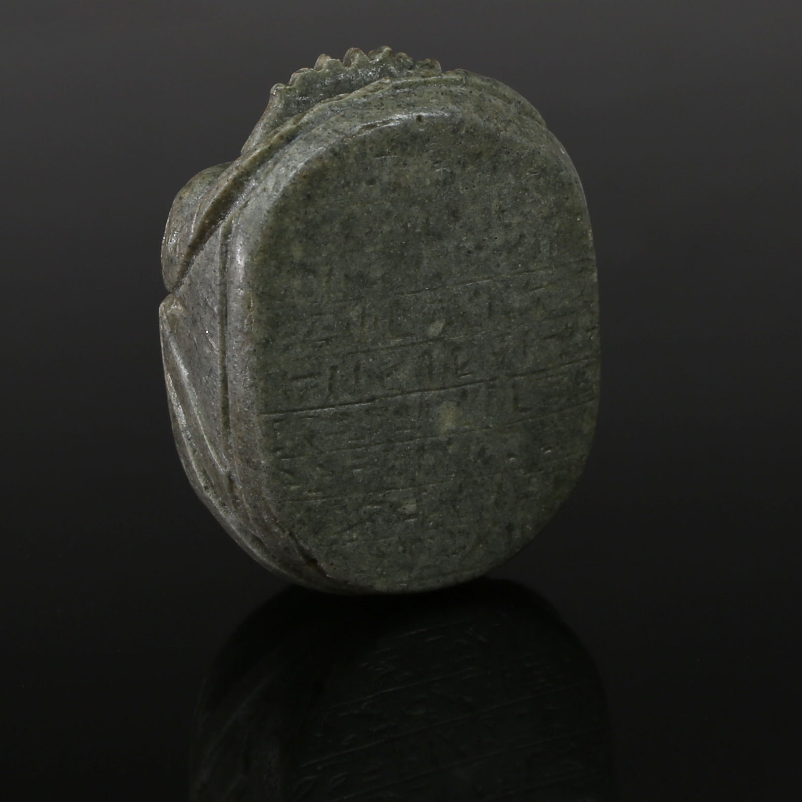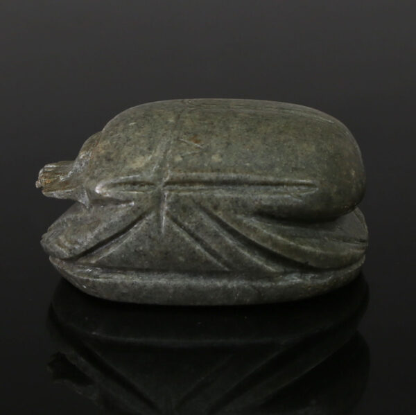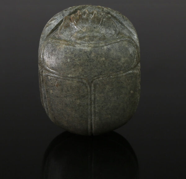 The Egyptian heart scarab was a powerful amulet used in funerary contexts, especially from the New Kingdom onward, and often inscribed with texts from the Book of the Dead. Typically made of green stone such as jasper, serpentine, or glazed steatite, the heart scarab was placed over the chest of the deceased during burial. It symbolized the heart—considered the seat of thought, emotion, and moral judgment in ancient Egyptian belief—and was meant to ensure a favorable outcome in the afterlife judgment.