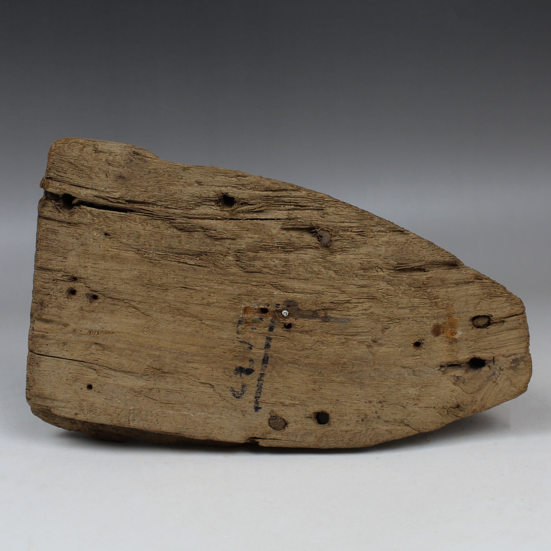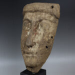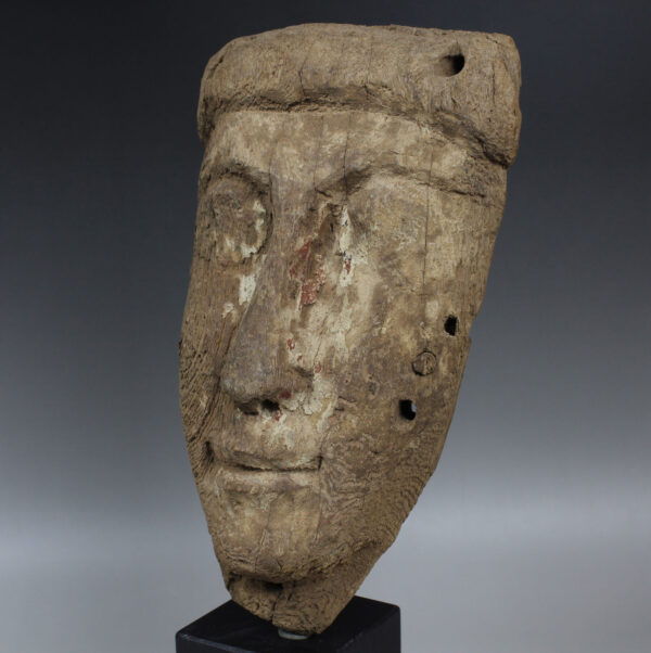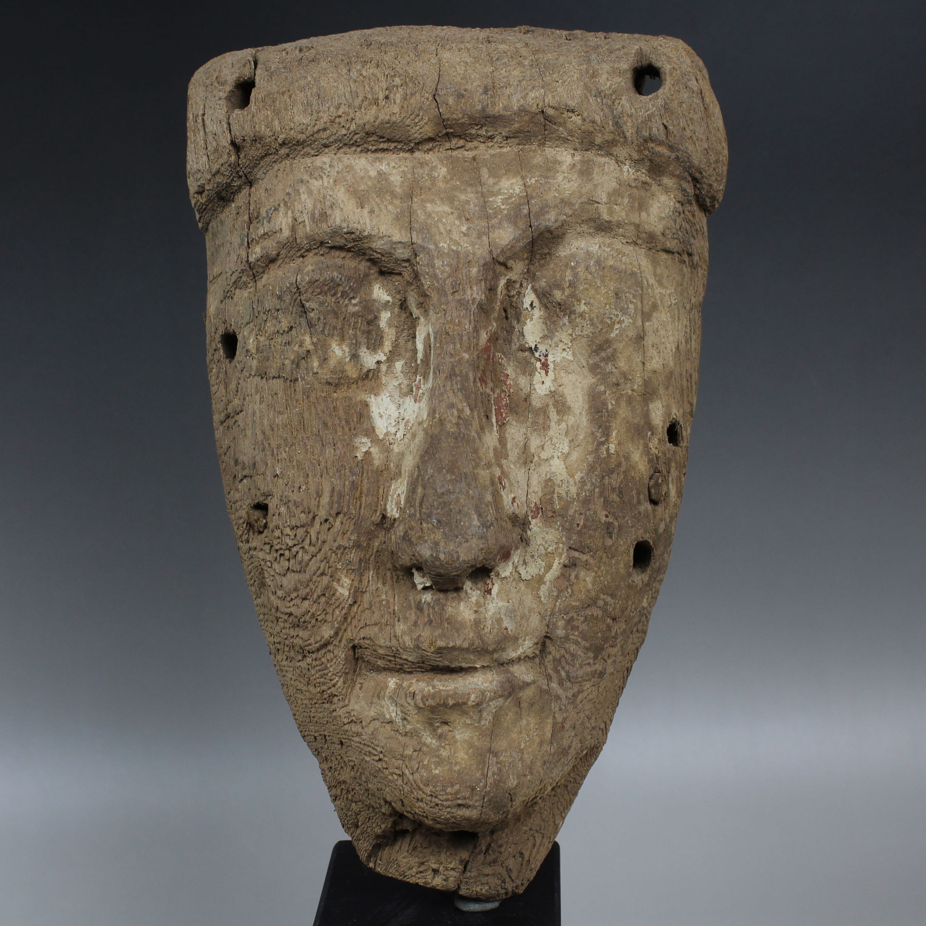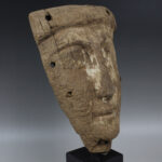 During the Egyptian Late Period, particularly from the 7th century BCE onward, the use of wooden sarcophagus masks became a distinctive feature in Egyptian funerary practices. These masks were crafted to cover the face of the deceased as an integral part of the outer coffin. The wooden sarcophagus mask served a dual purpose: it not only provided a lifelike visage for the deceased to facilitate the journey to the afterlife but also acted as a protective element, with the belief that the spirit of the deceased could recognize and inhabit the representation of their own face. The attention to detail in these masks was remarkable, with artisans carving intricate features, including eyes, nose, and mouth, often reflecting an idealized and serene expression.