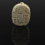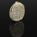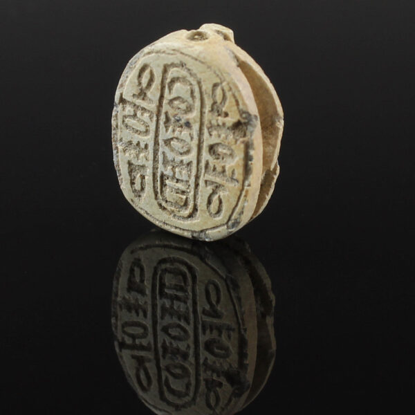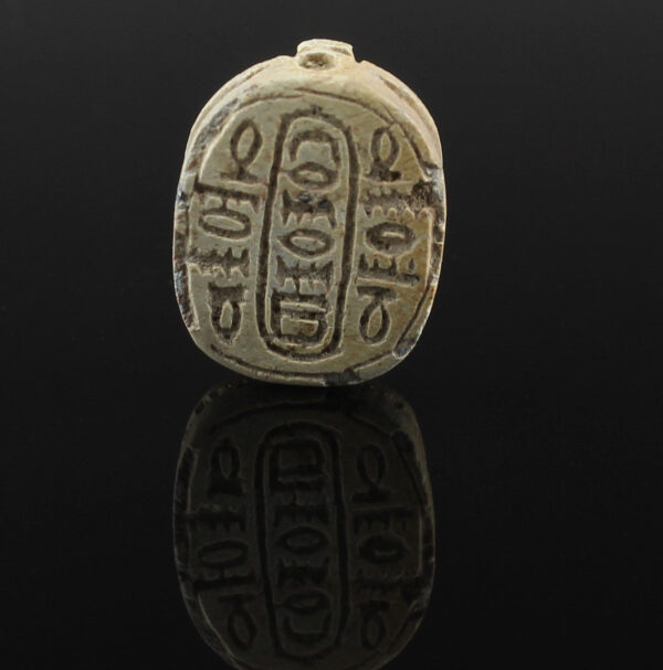 Scarab amulets were used for their magical rejuvenating properties by both the living and the dead. Scarabs were used by living individuals as seals from the start of the Middle Kingdom (ca. 2055 BCE) onwards. The most common inscription for these scarabs was the owner’s name. The incised design was often a schematic combination of hieroglyphs and geometric patterning. Patterns could often denote the specific administrative office held by the wearer.