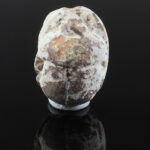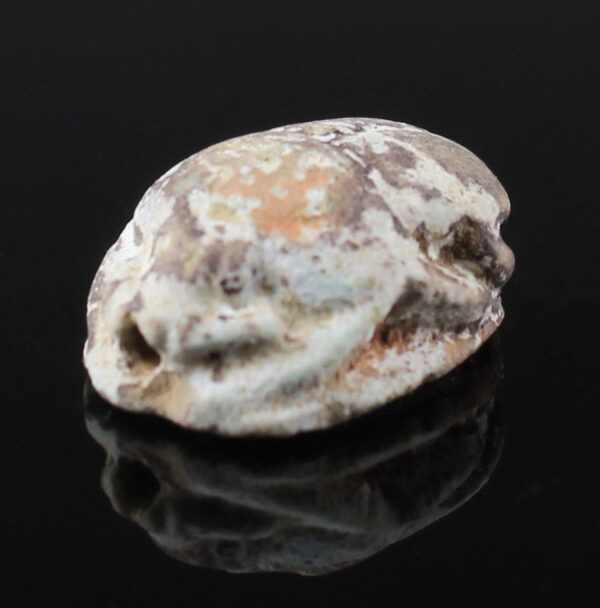 Scarabs were also often rendered naturalistically in the round. The regenerative powers of scarabs of this nature could be used by either the living or the dead for healing and protection during quotidian activities or during a deceased person’s passage into the afterlife. The striking red/orange color of this amulet’s carnelian strengthens its solar associations.