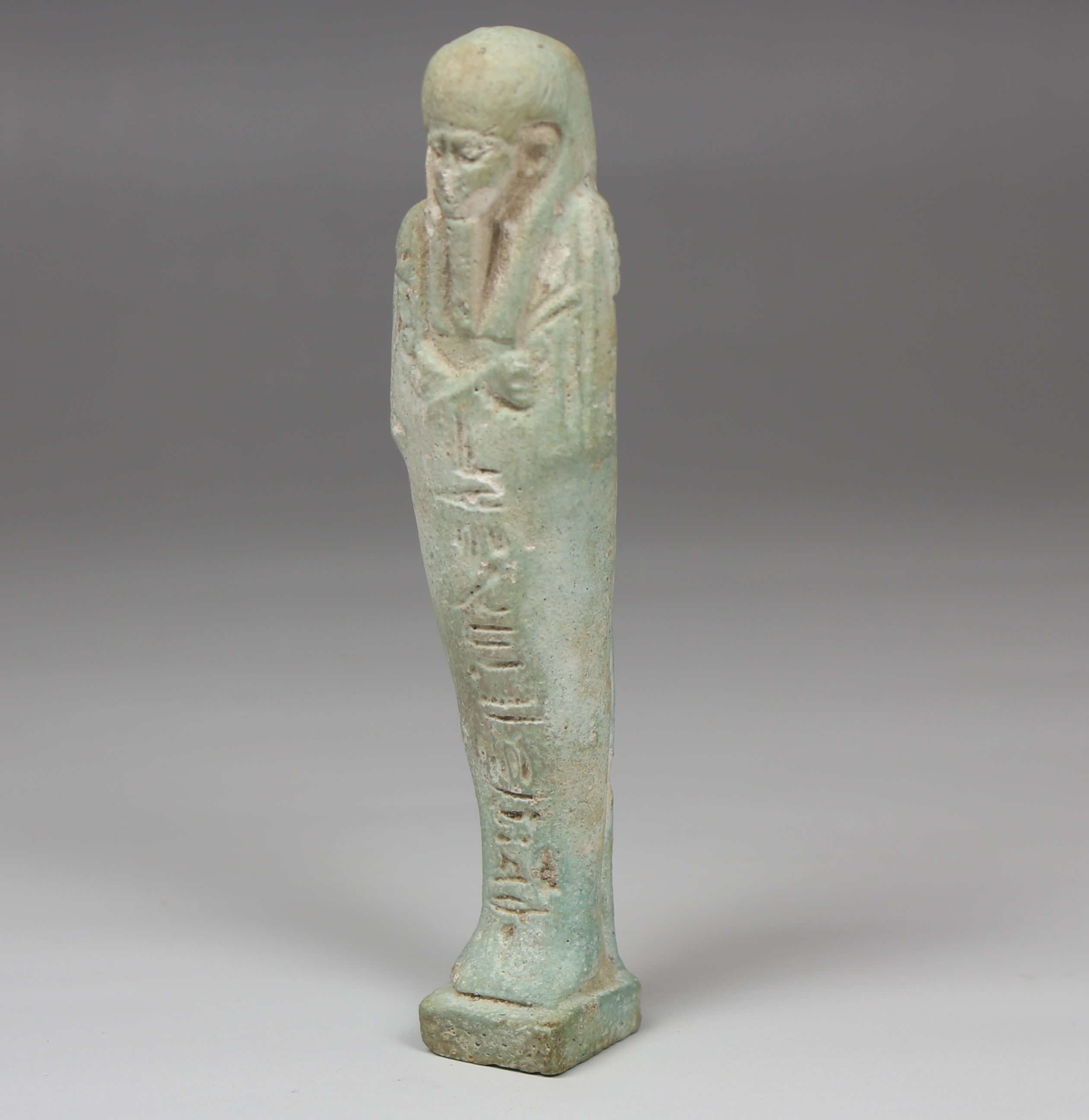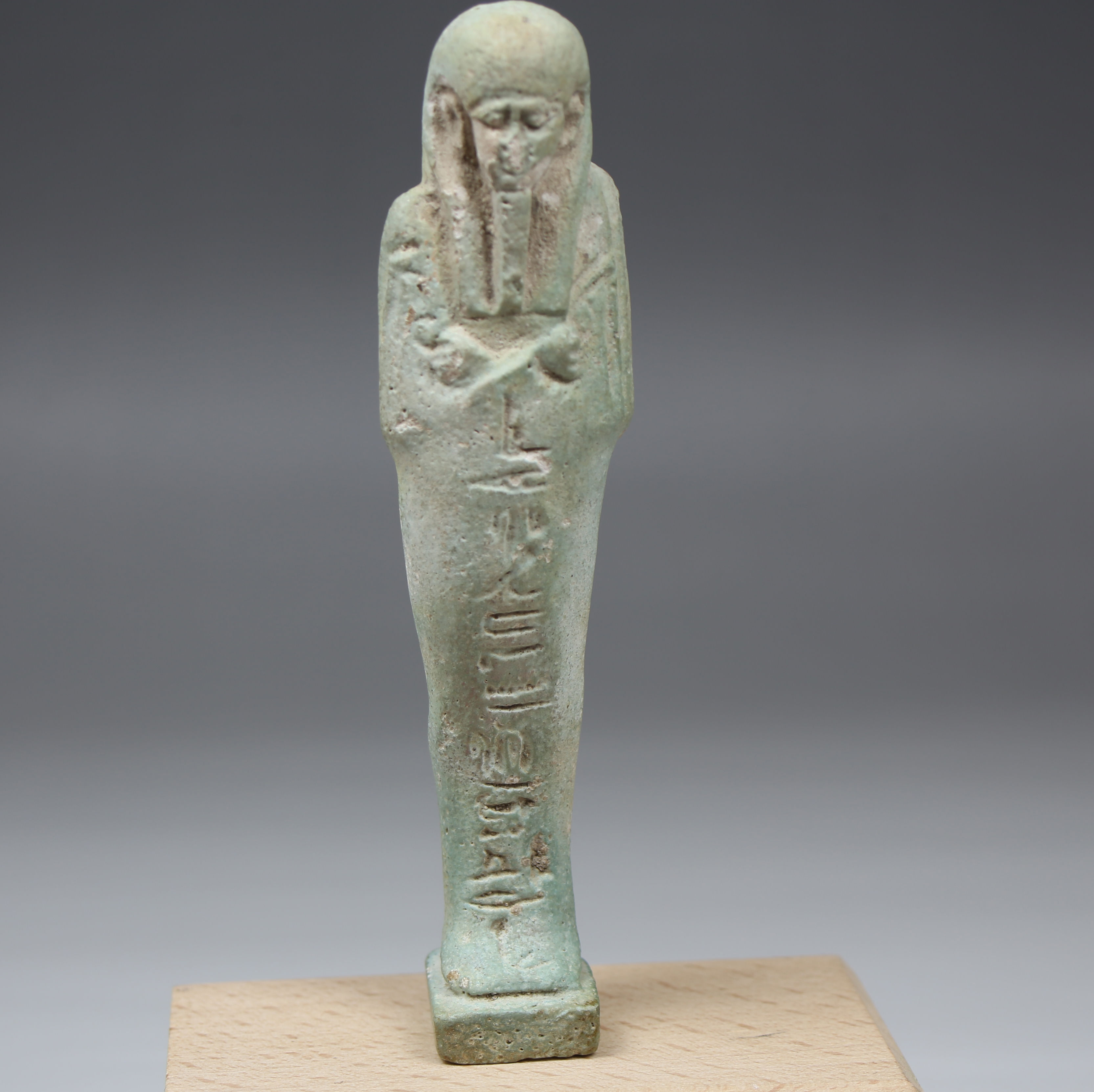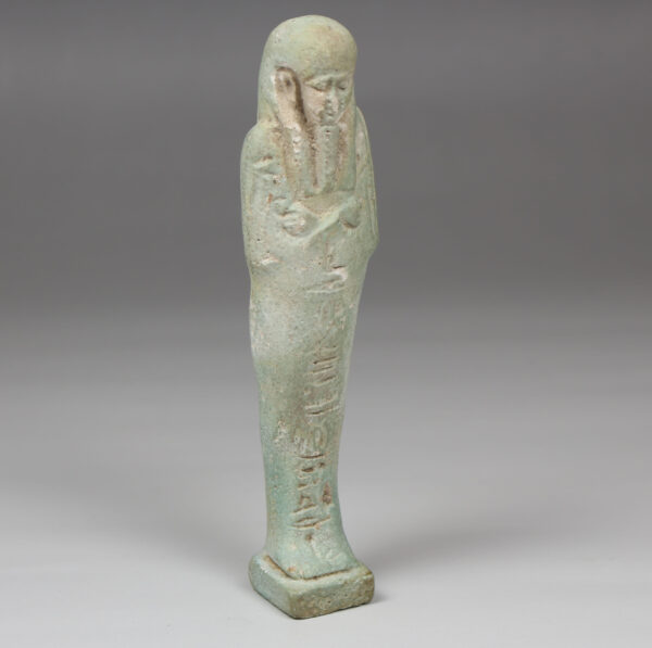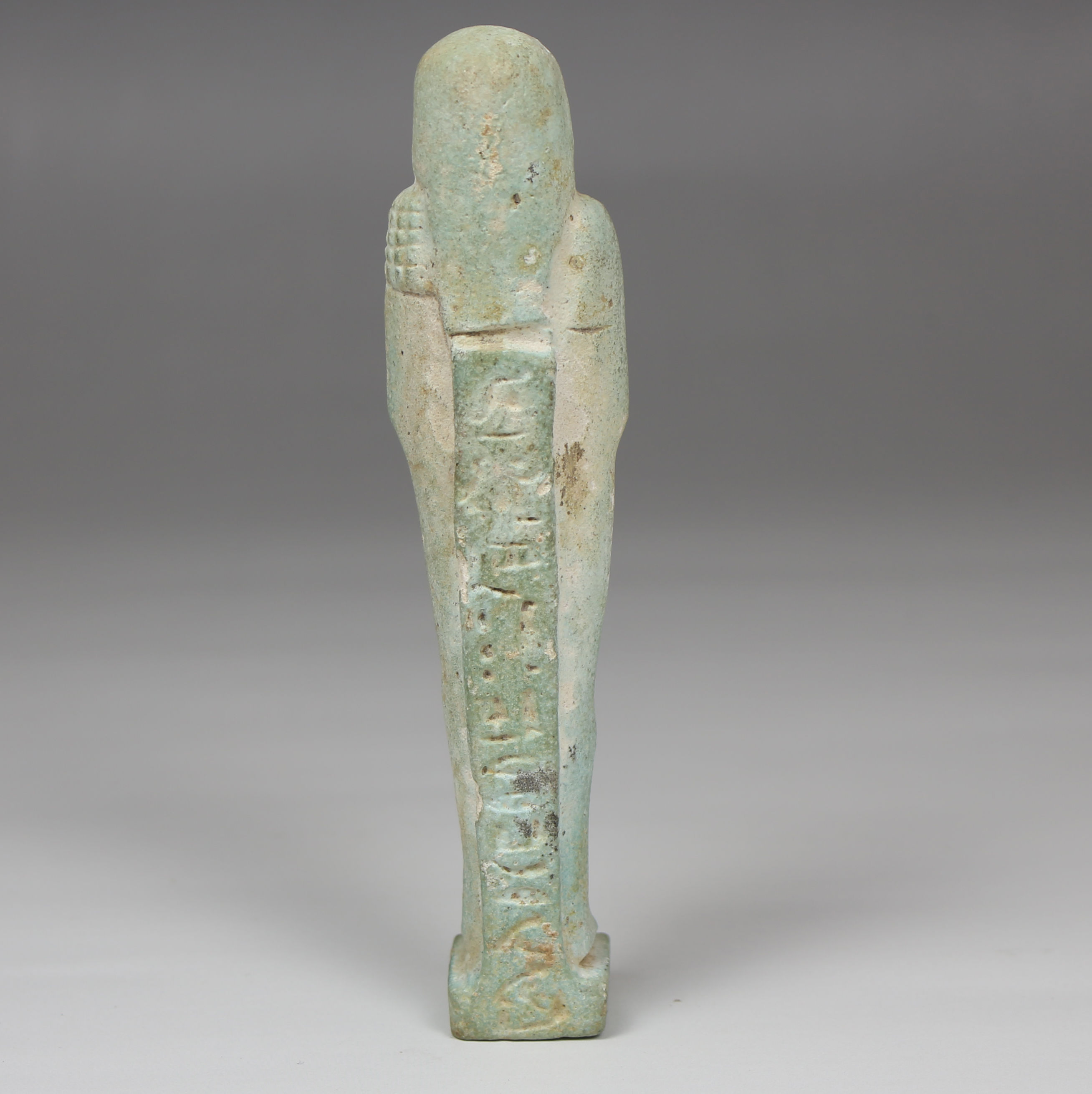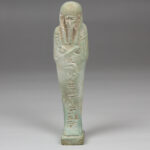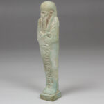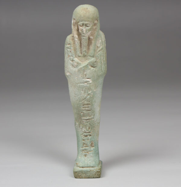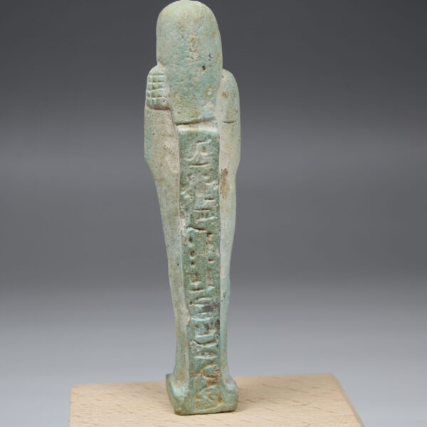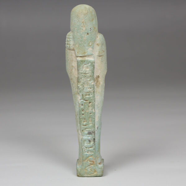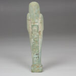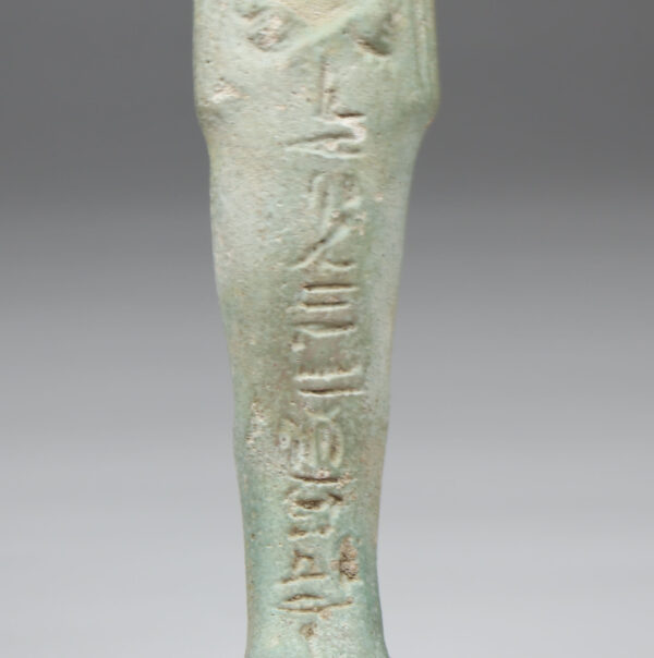 The Shabti for Psamtekhen is inscribed with a formula on its backside, which invokes the Shabti to perform any necessary work on behalf of the deceased in the afterlife. This formula is a variant of the commonly found “Shabti spell” or “Shabti formula,” which was intended to activate the Shabti’s duties. It reflects the ancient Egyptian belief in an afterlife where the deceased would continue to perform labor similar to their earthly responsibilities, and the Shabti was tasked with carrying out these duties on behalf of the deceased.