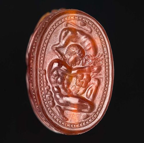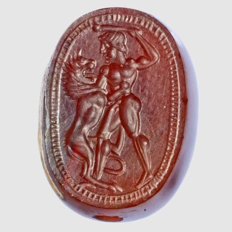 Etruscan scarabs such as this reflect the cosmopolitan nature of Etruscan society, which absorbed and reinterpreted artistic elements from Egyptian, Greek, and Near Eastern traditions. The presence of Herakles on Etruscan gems and jewelry also suggests a deep appreciation for Greek mythology and its heroic ideals, which resonated within Etruscan aristocracy. These artifacts, often discovered in tombs, indicate their importance in both life and death, serving as protective charms for the afterlife.