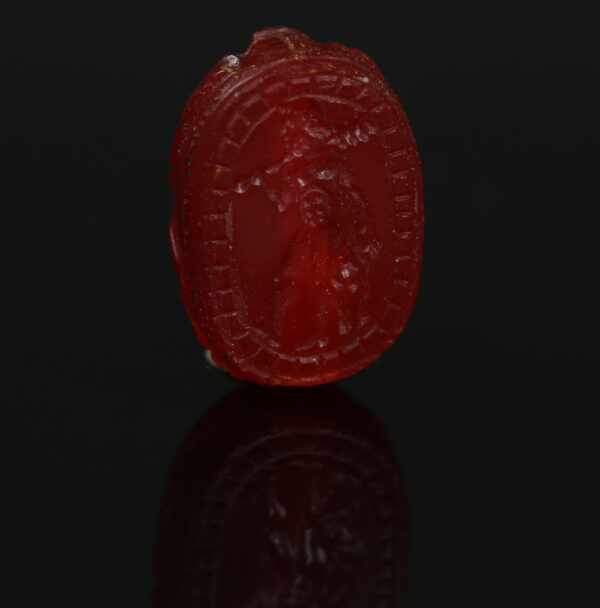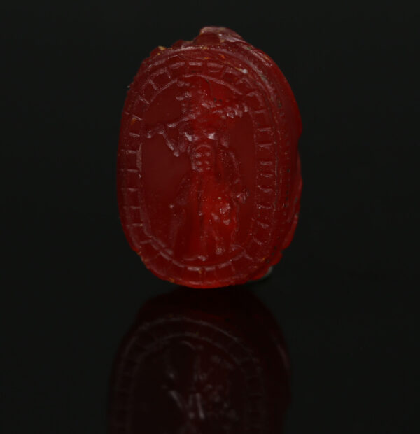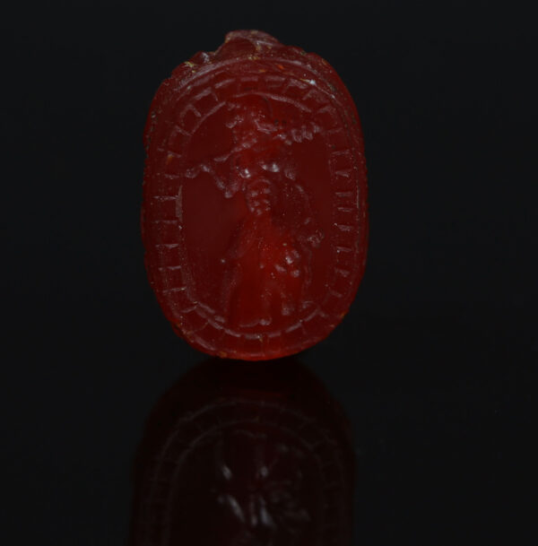 The engraving of Herakles on such a scarab typically depicted the hero in one of his labors or heroic exploits, often in a dynamic pose that emphasized his muscular form and determination. The Etruscans were skilled in intaglio carving, a technique where the design was engraved into the surface of the stone, allowing it to be used as a seal when pressed into wax or clay. These scarabs were not only worn as protective talismans but also functioned as personal seals for the elite, indicating ownership or authenticity. The Herakles motif may have served as a symbol of strength, endurance, and divine favor, reinforcing the owner’s connection to heroic virtues and possibly even their social status.