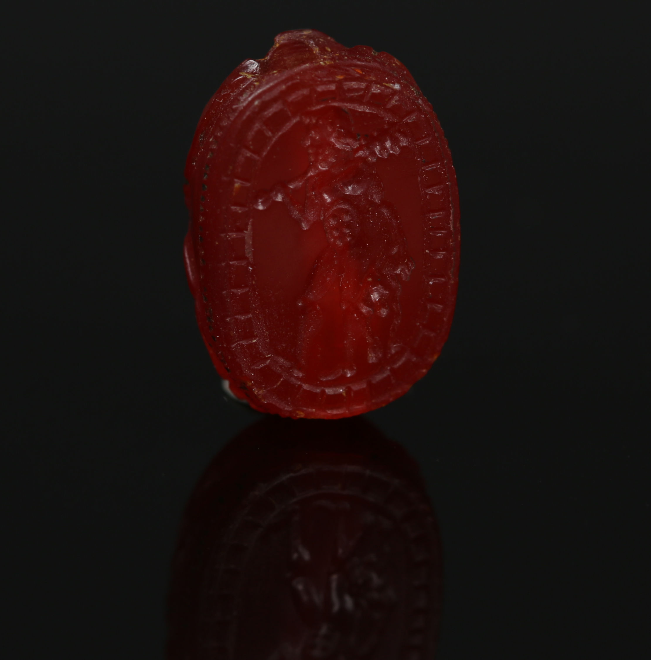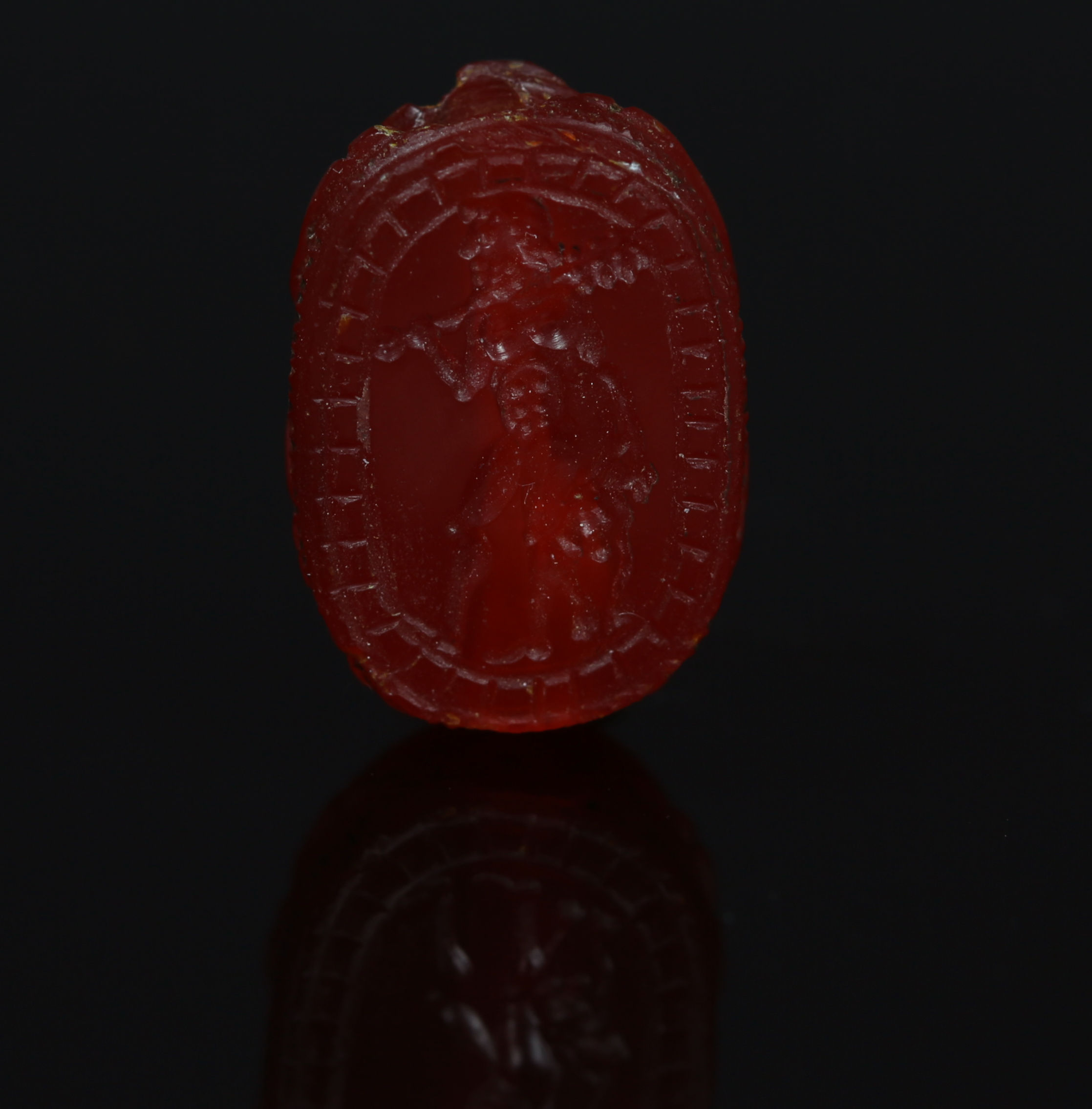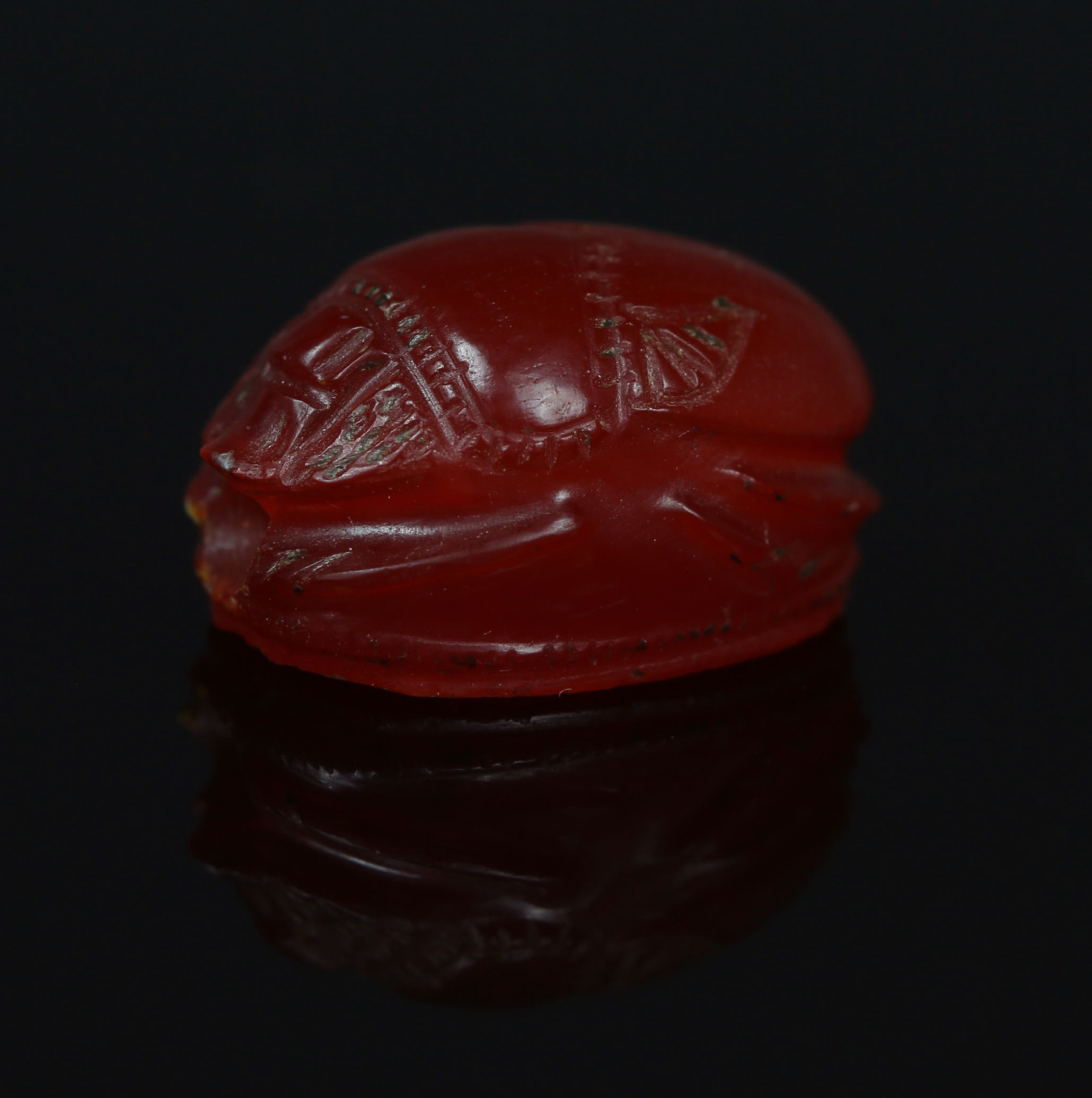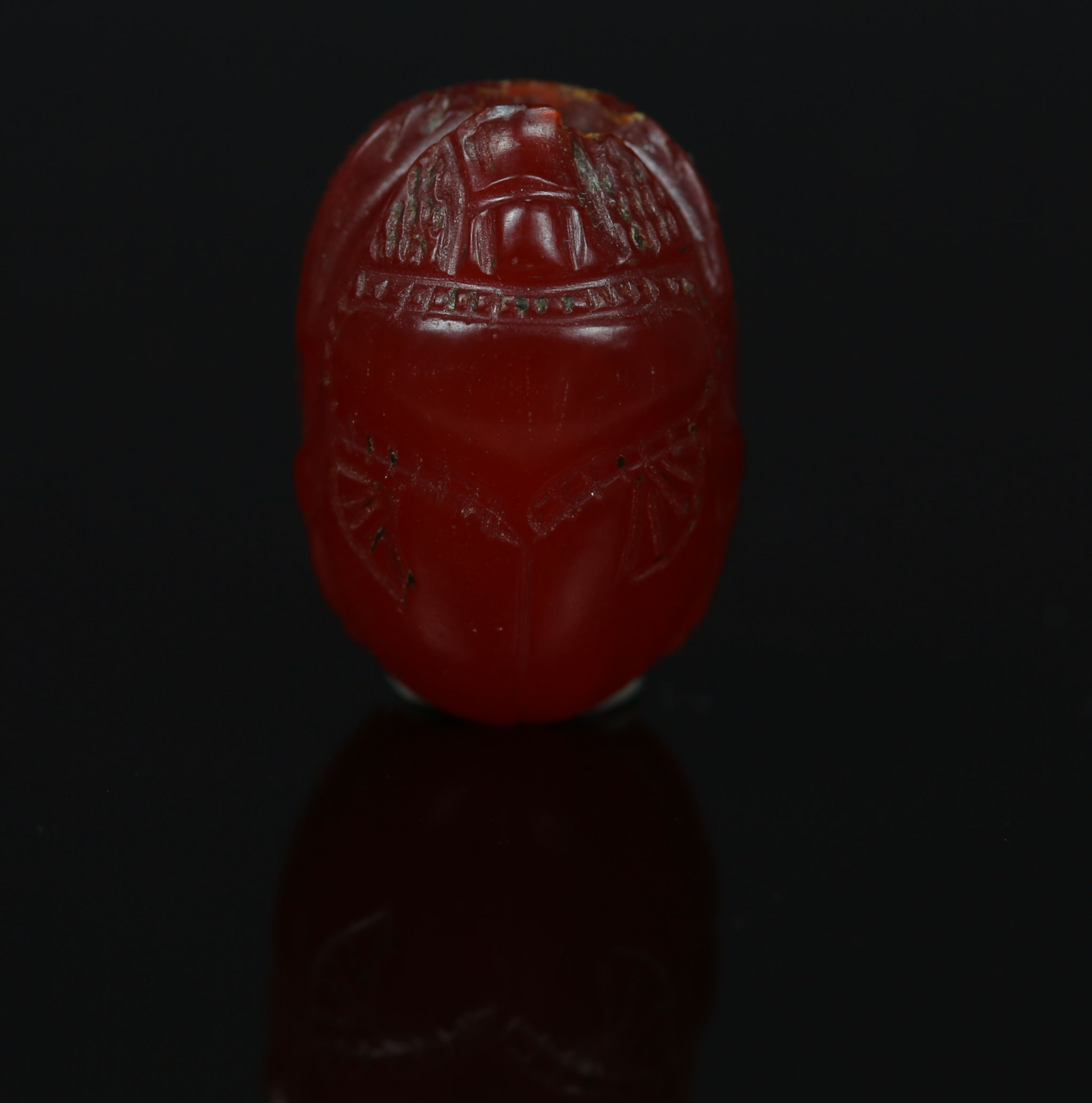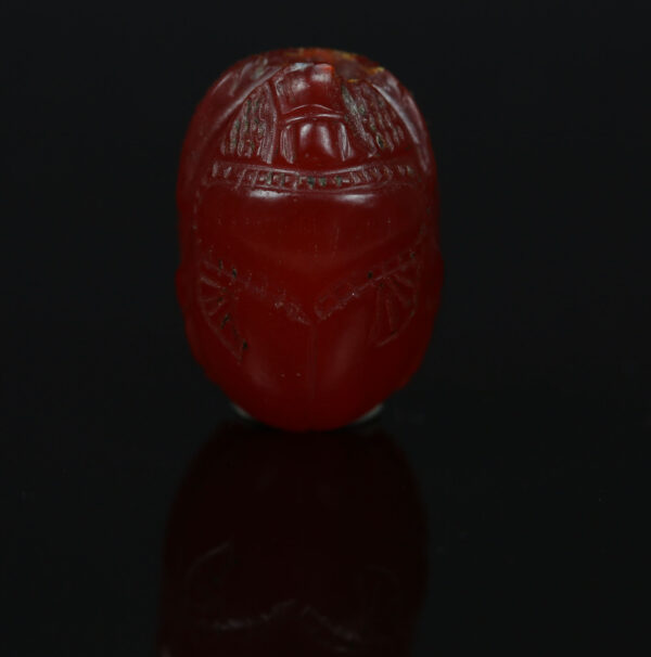 The scarab shape, originally an Egyptian motif, was adopted by the Etruscans through their interactions with the Mediterranean world, particularly the Greeks and Phoenicians. These scarabs, often carved from semi-precious stones like carnelian, were used as amulets, seals, or personal adornments, symbolizing both status and protection. The choice of carnelian, a deep red-orange gemstone, was significant as it was believed to have protective and energizing properties. The depiction of Herakles, a hero from Greek mythology, highlights the strong Greek influence on Etruscan art and the admiration for his strength, courage, and heroic deeds.