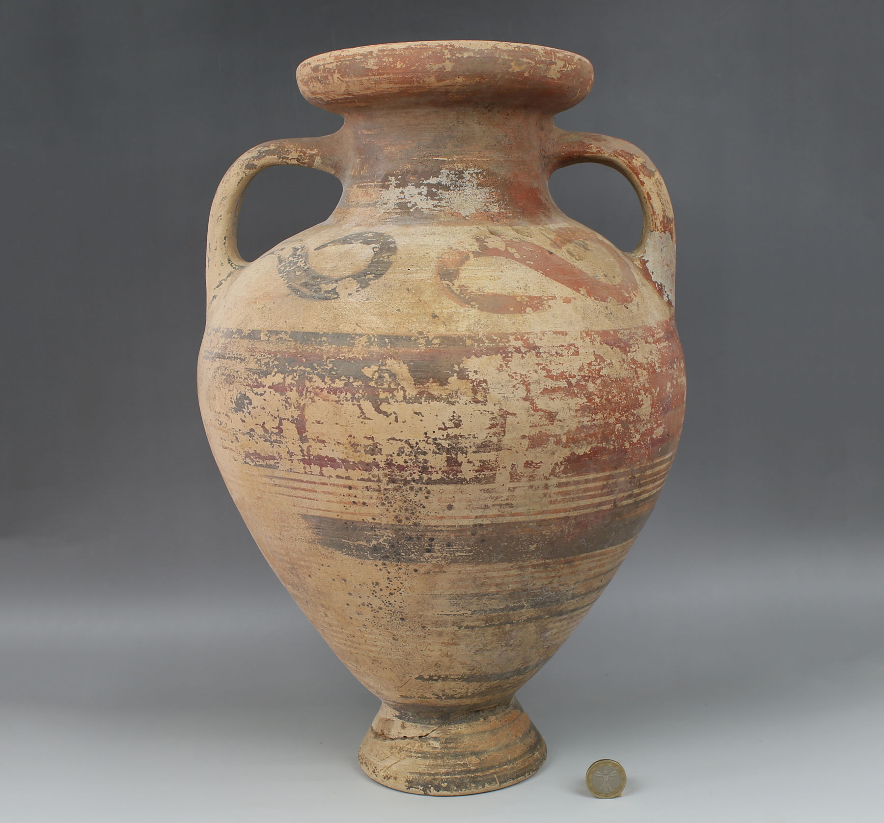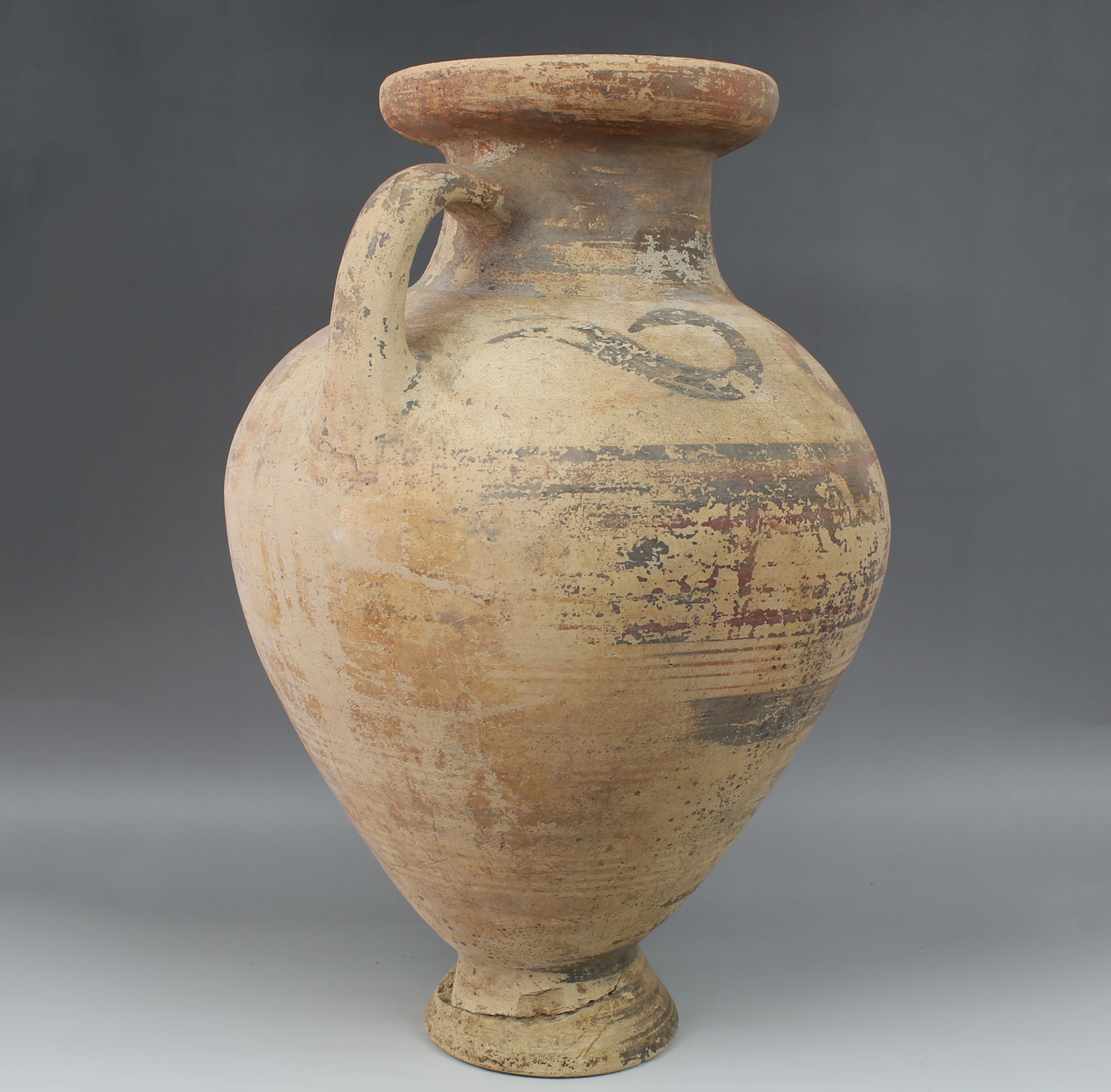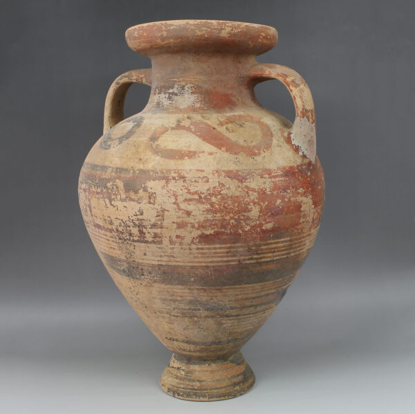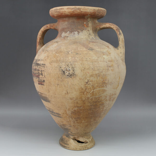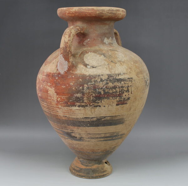 The Etrusco-Corinthian amphora is a ceramic vessel that reflects the cultural exchange between the Etruscans of central Italy and the Greek world, particularly Corinth, during the Orientalizing period (circa 720–575 BCE). These amphorae were heavily influenced by imported Corinthian pottery, both in form and decoration, but produced locally by Etruscan artisans. They typically feature a bulbous body, narrow neck, and twin vertical handles, designed to store and transport liquids such as wine or oil.