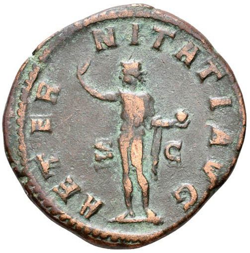 | REVERSE | AETERNITATI AVG, Sol standing left, raising hand and holding globe; S-C across fields |