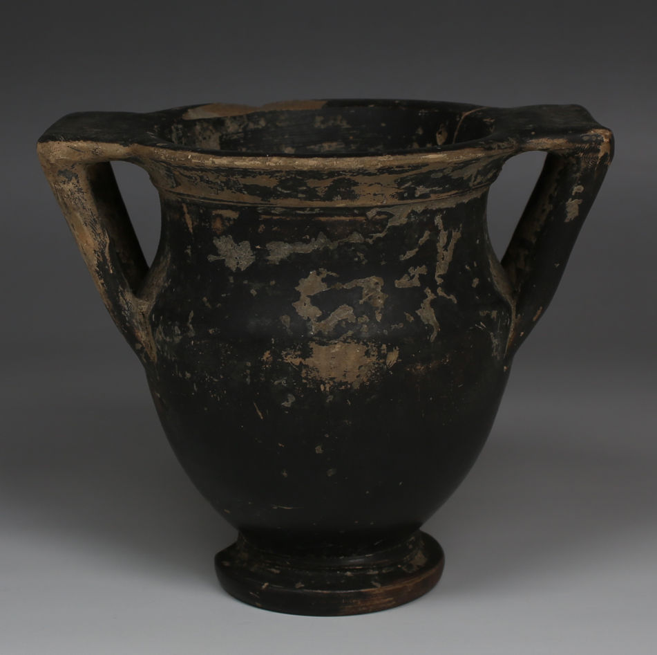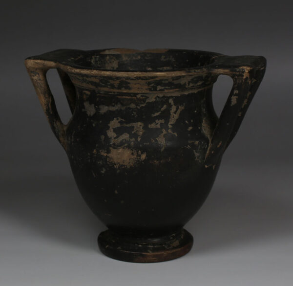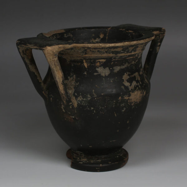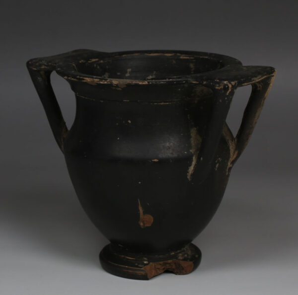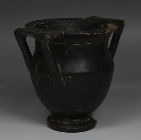 The column krater is a distinctive type of ancient Greek pottery used primarily for mixing wine and water during symposia, or drinking parties. Characterized by its large size and wide mouth, the column krater often features a tall, cylindrical body with handles on either side, which made it easier to pour and mix liquids. The name “column krater” derives from its column-like shape, a feature that differentiates it from other types of kraters, such as the bell krater and the calyx krater. The form of the column krater made it an ideal vessel for communal drinking, reflecting the importance of social gatherings in Greek culture.