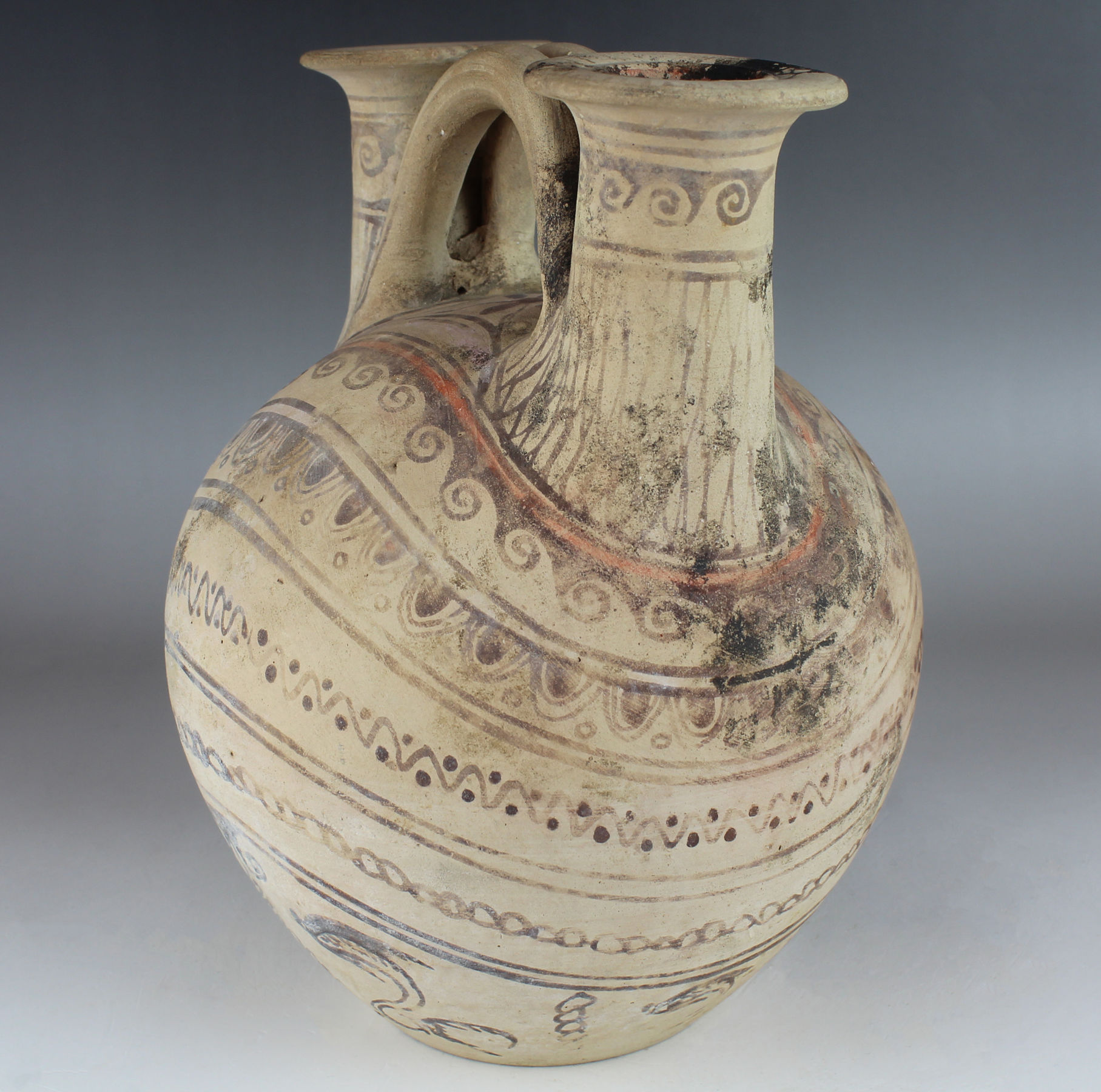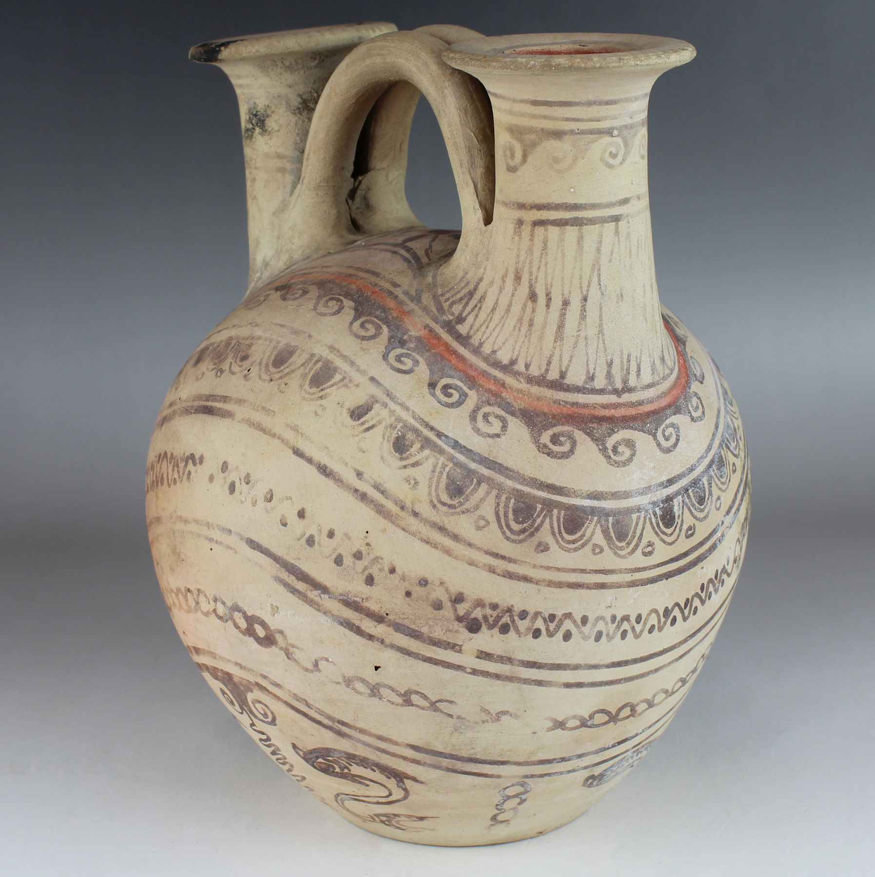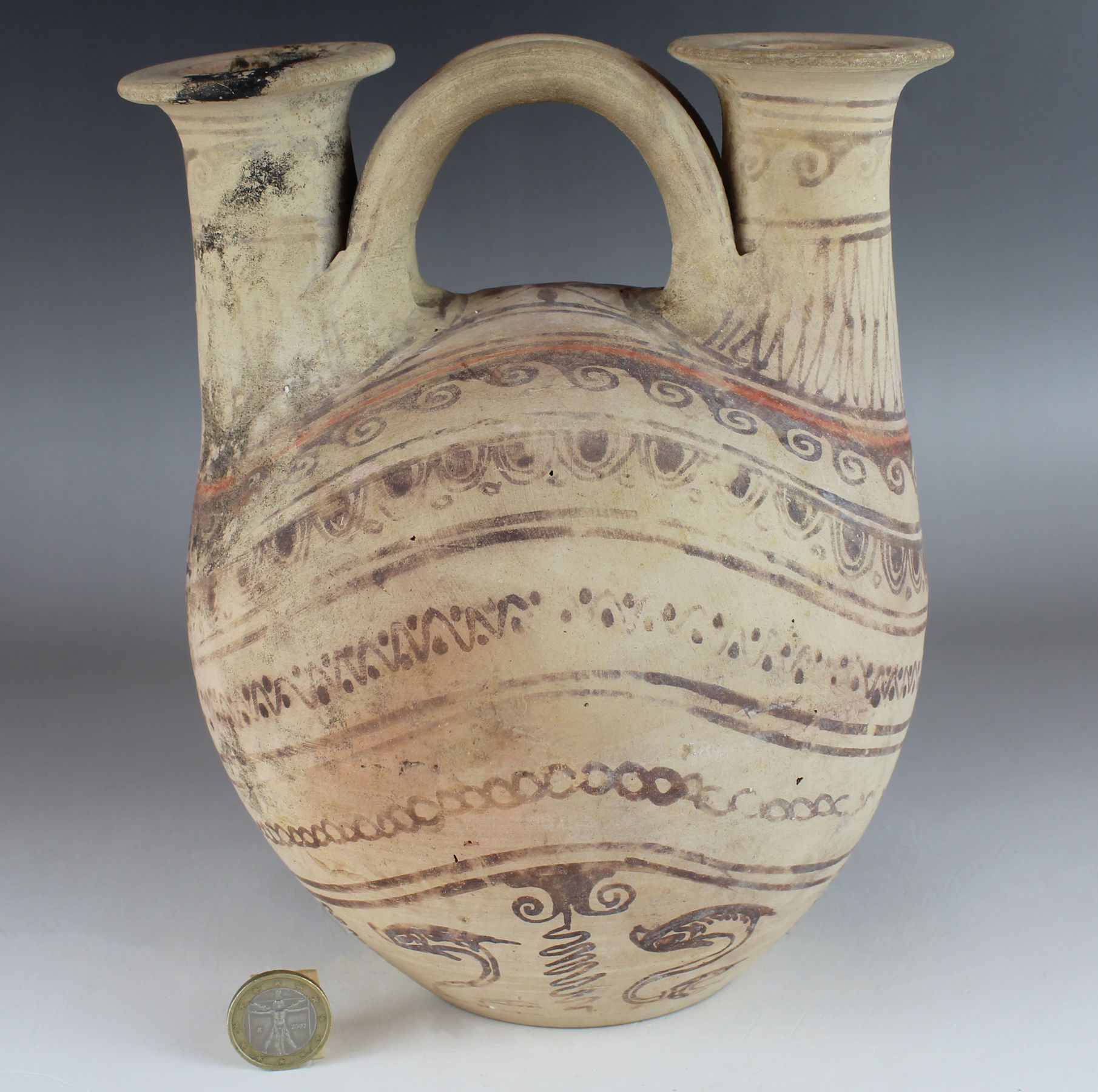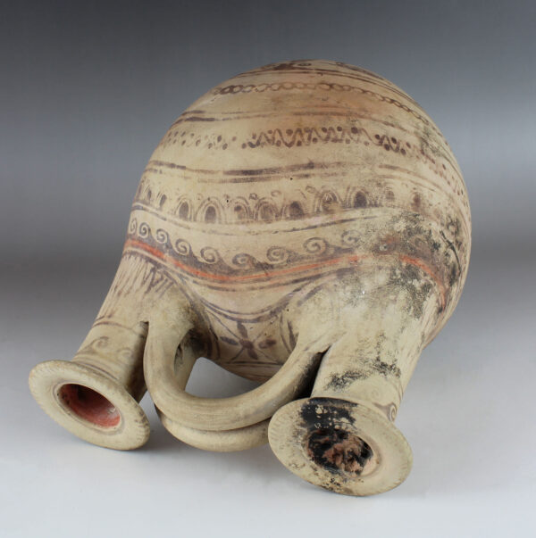 Daunian askoi are small ceramic vessels originating from the ancient Daunian culture of Southern Italy, primarily found in the region of Apulia during the 1st millennium BCE. These vessels are characterized by their unique form, featuring a spherical body with a spout and a single handle, resembling a miniature pitcher. What sets them apart is the decorative attachment of ceramic dolphins, typically encircling the spout.