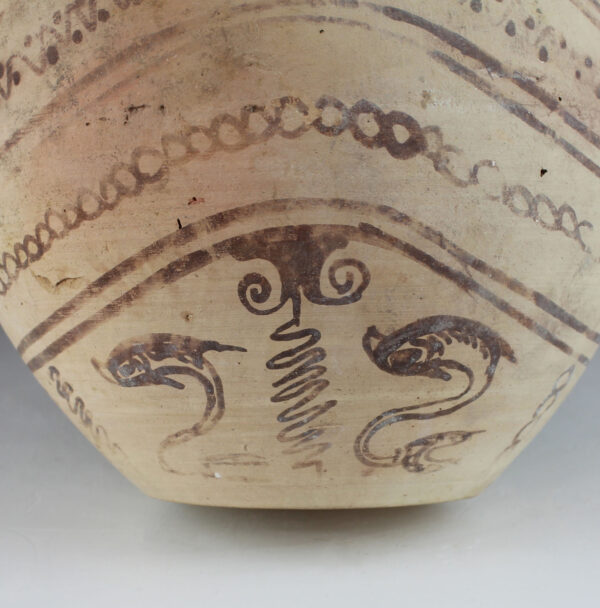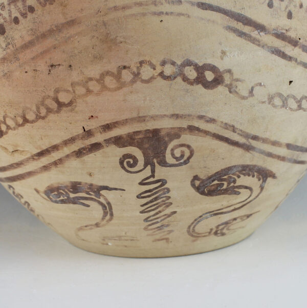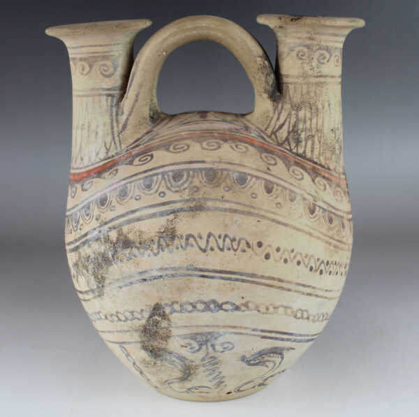 Dolphins held significant symbolism in Daunian art and culture, often associated with themes of water, fertility, and the sea. The presence of dolphins on these askoi suggests a connection to maritime life or possibly religious significance related to water and fertility. These vessels showcase the artistic skill of the Daunian people, with the dolphins rendered in a stylized manner to emphasize their graceful and sinuous forms.