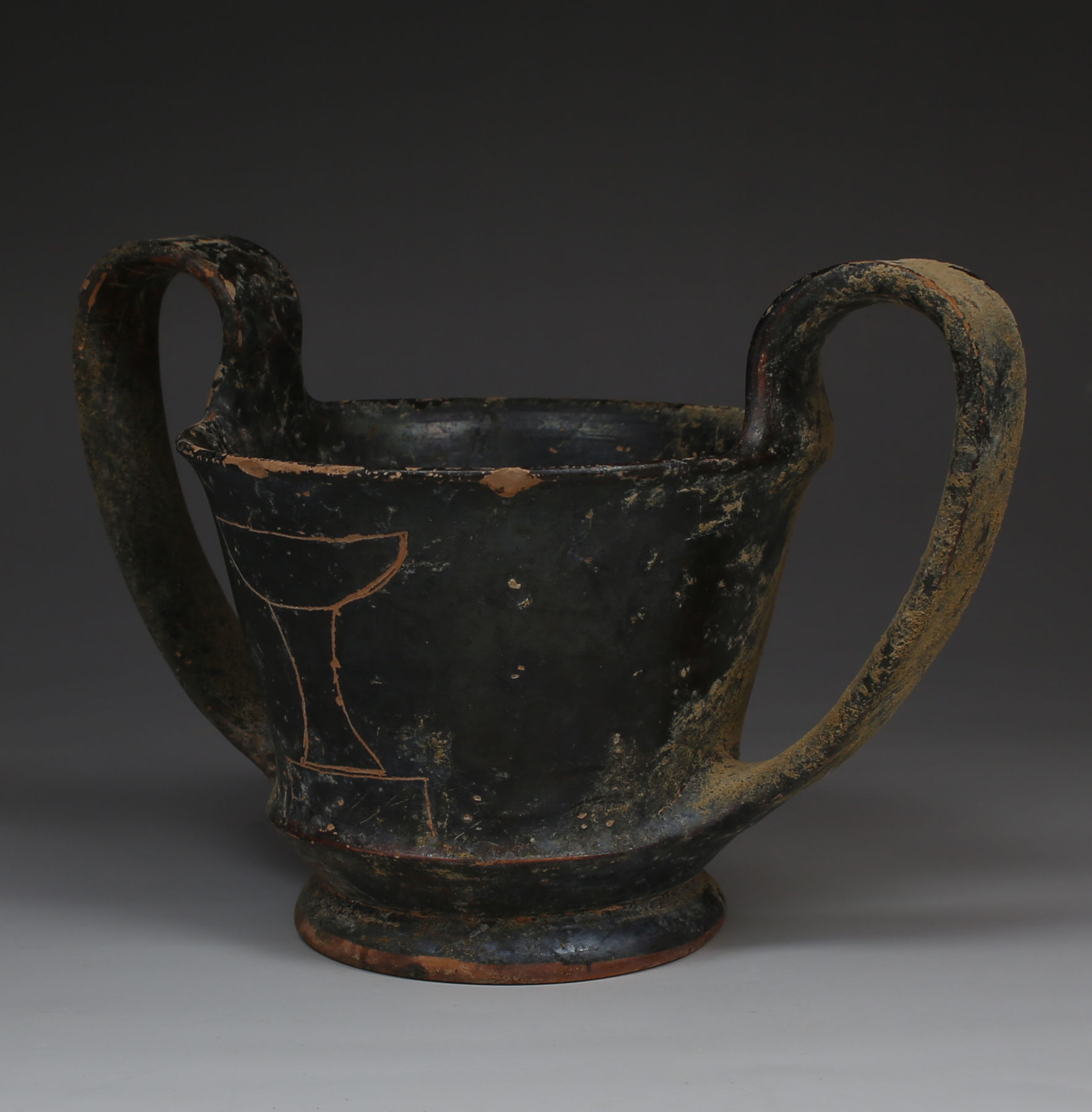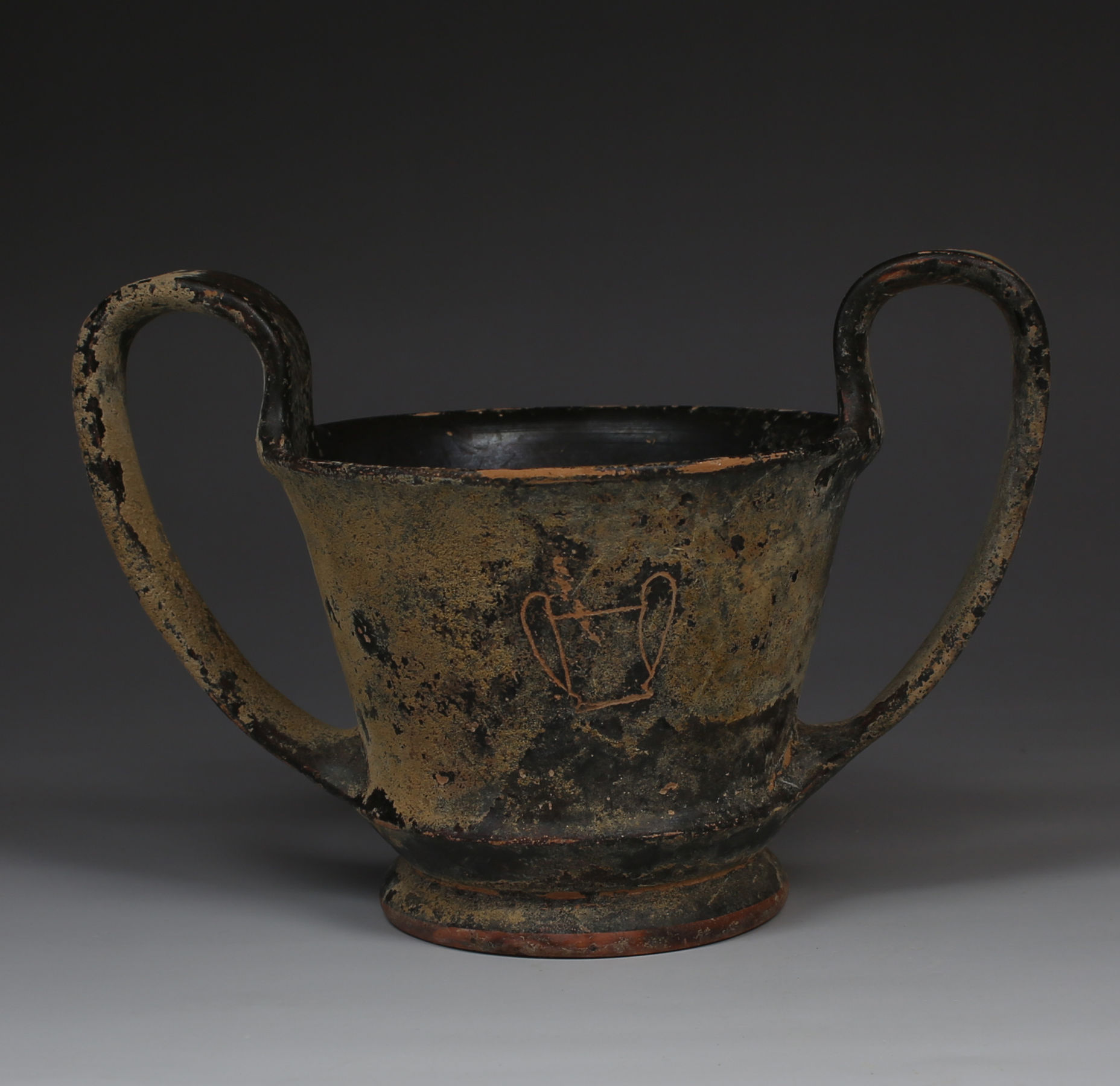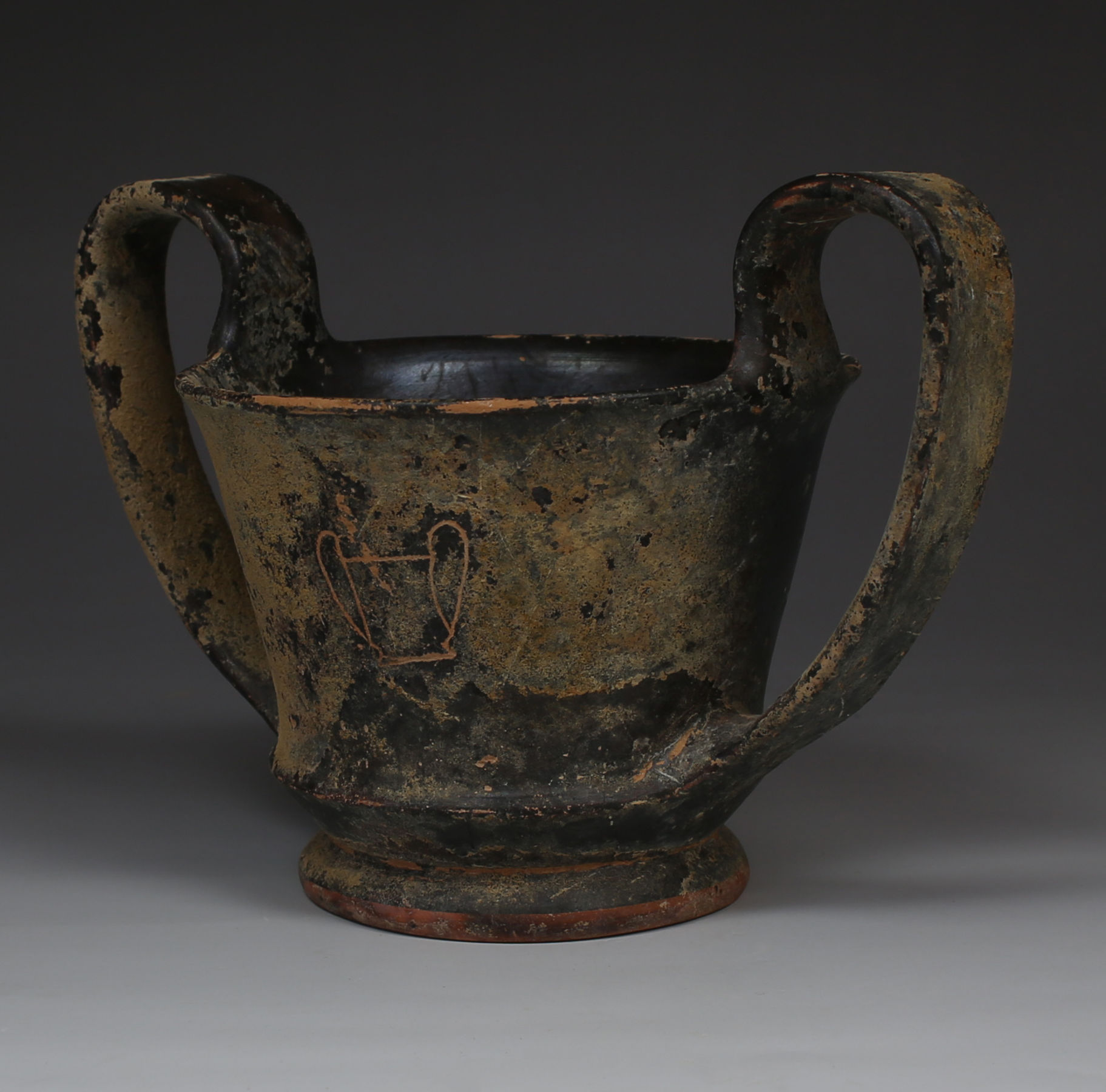 | ITEM | Kantharos (karchesion) with graffiti, perirrhanterion and karchesion, underneath a curved sword (harpa) |