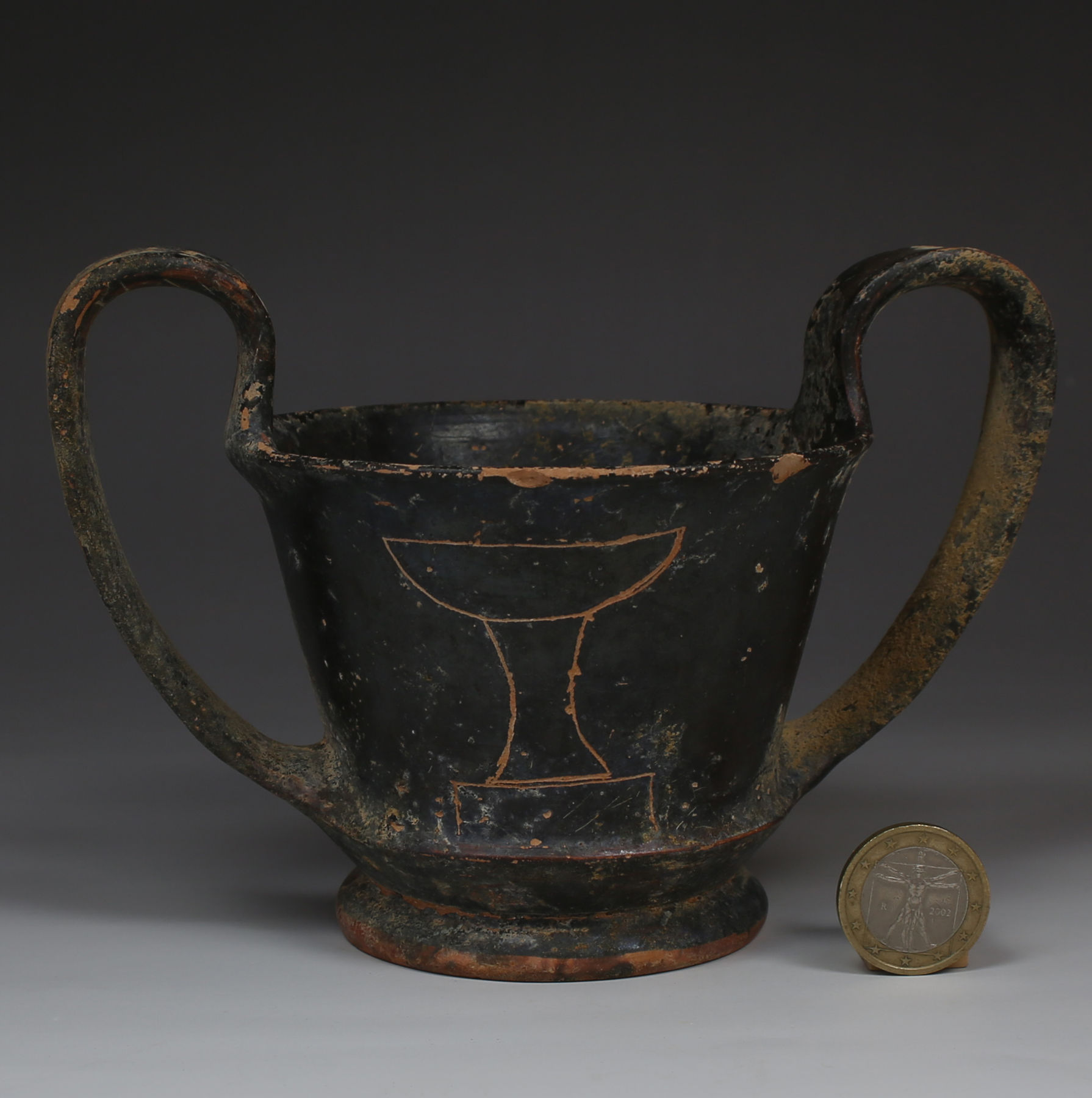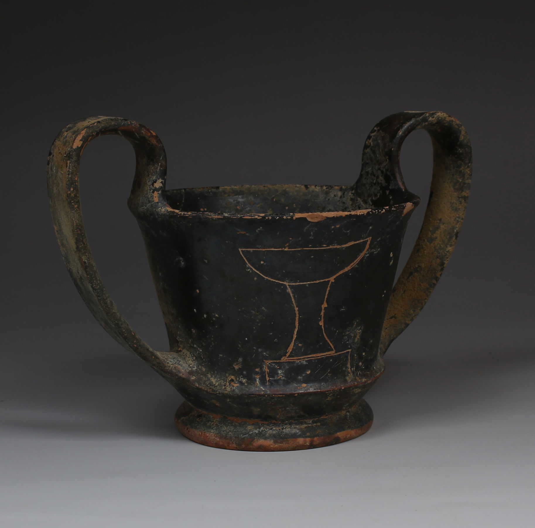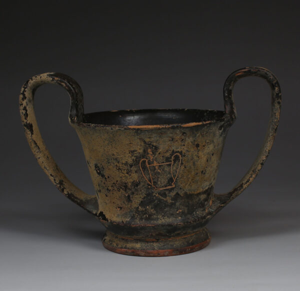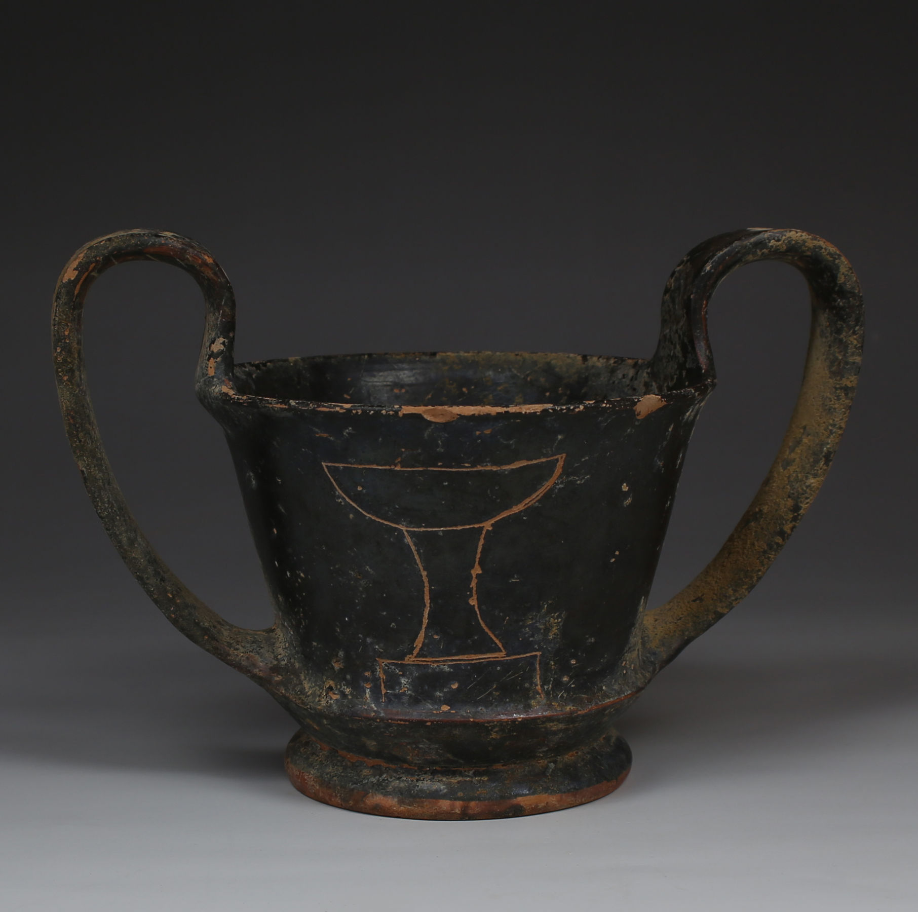 | ITEM | Kantharos (karchesion) with graffiti, perirrhanterion and karchesion, underneath a curved sword (harpa) |