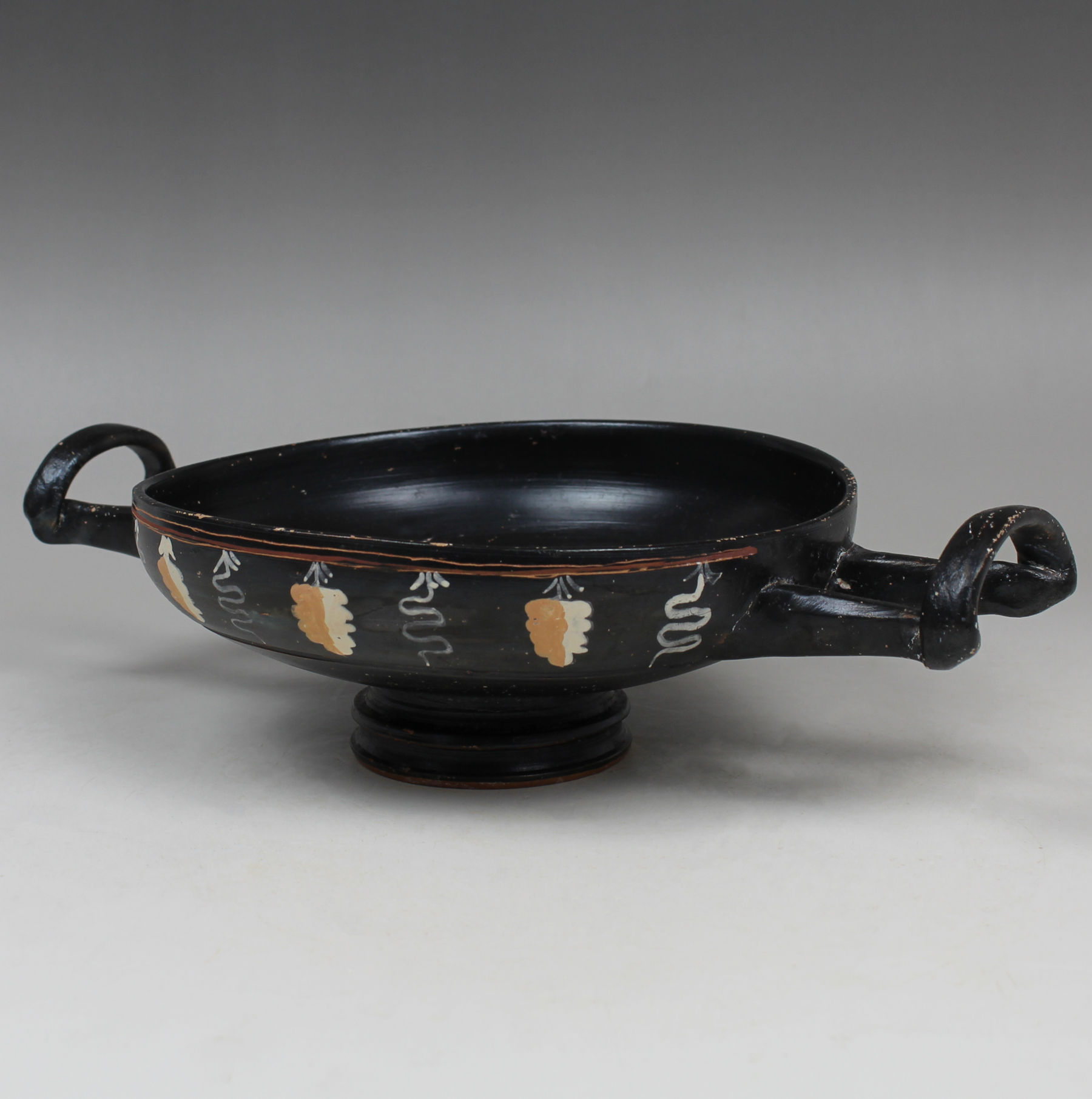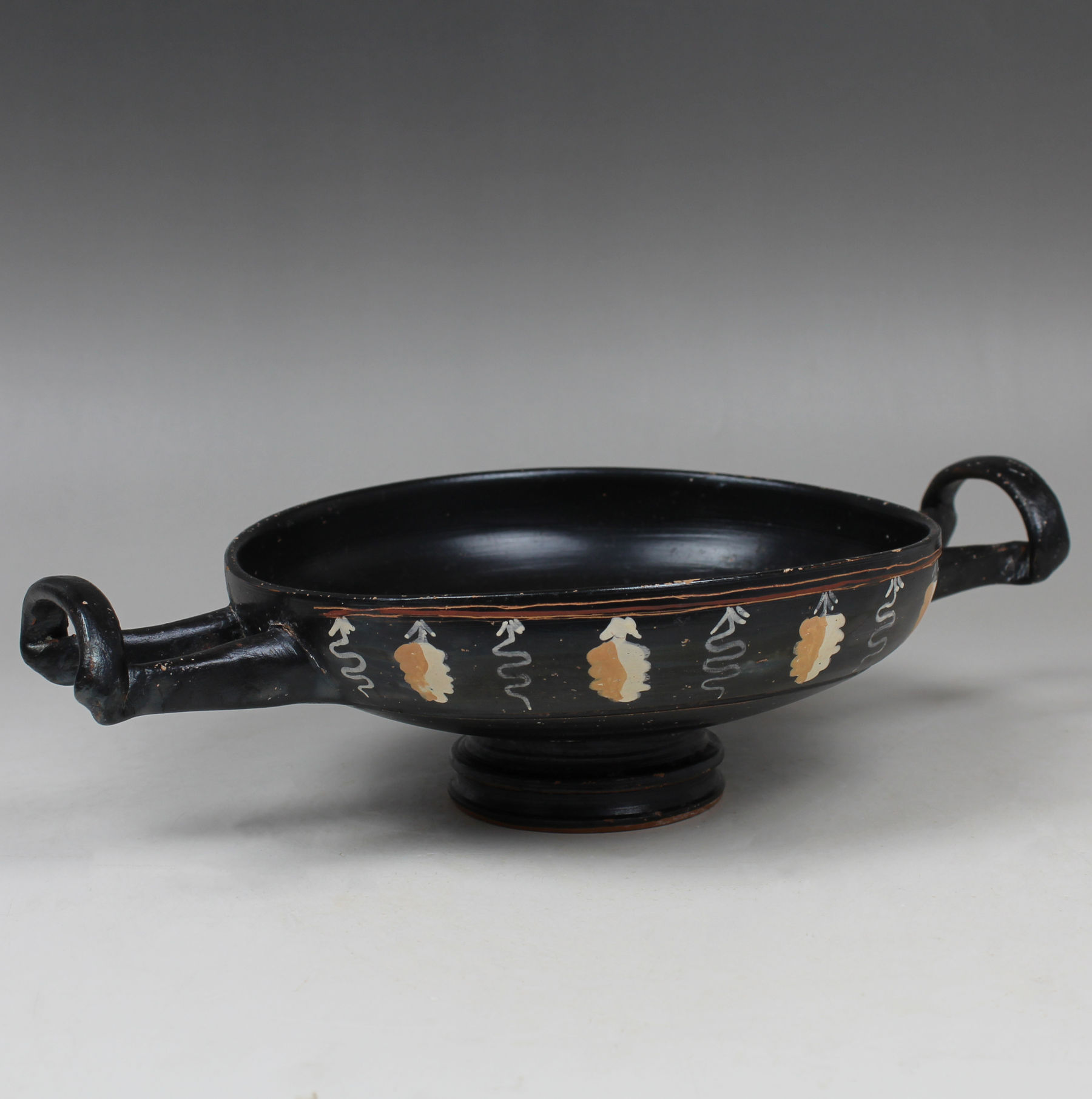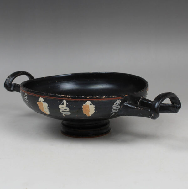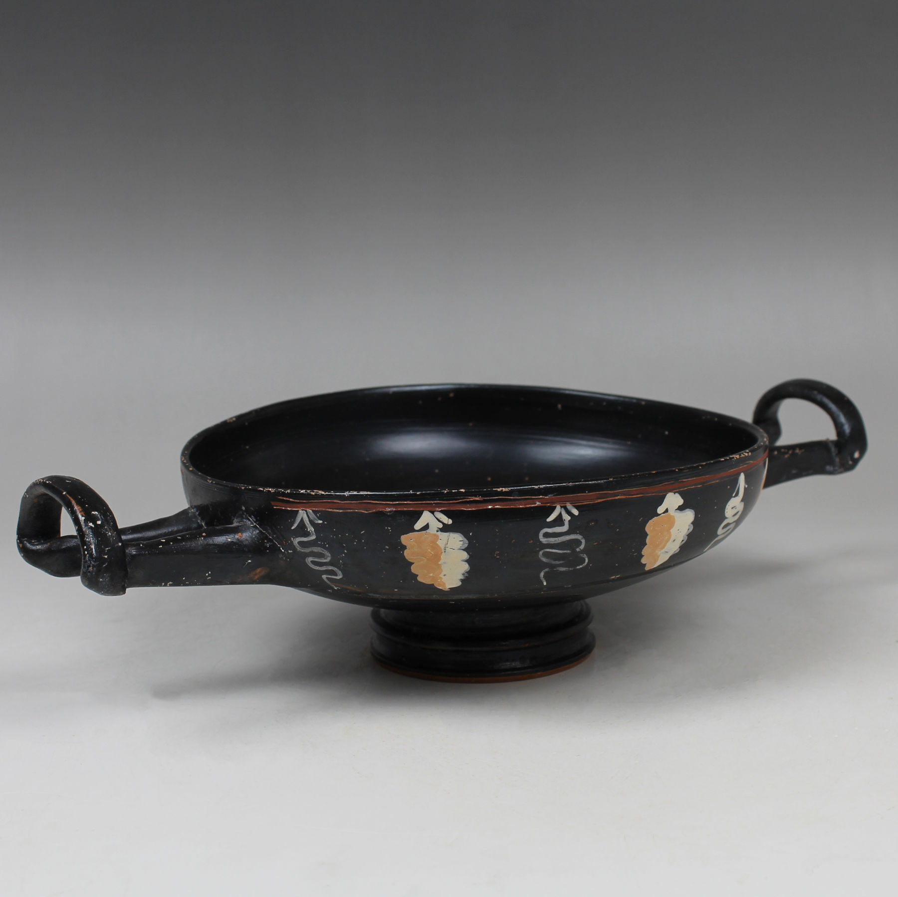 The kylix is a type of ancient Greek drinking cup with a shallow, broad bowl and a pair of horizontal handles attached to the sides. Popular from the 6th to the 4th centuries BCE, kylixes were commonly used in symposia, social gatherings where men would come together to drink wine, converse, and partake in various entertainments. The distinctive shape of the kylix allowed for easy handling and drinking while reclining on couches, which was the customary posture during these gatherings. The interior of the bowl often featured red-figure or black-figure decoration, showcasing scenes from daily life, mythology, or symposium-related activities. Some kylixes also had inscriptions or dedications that provided additional context.