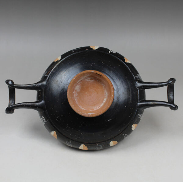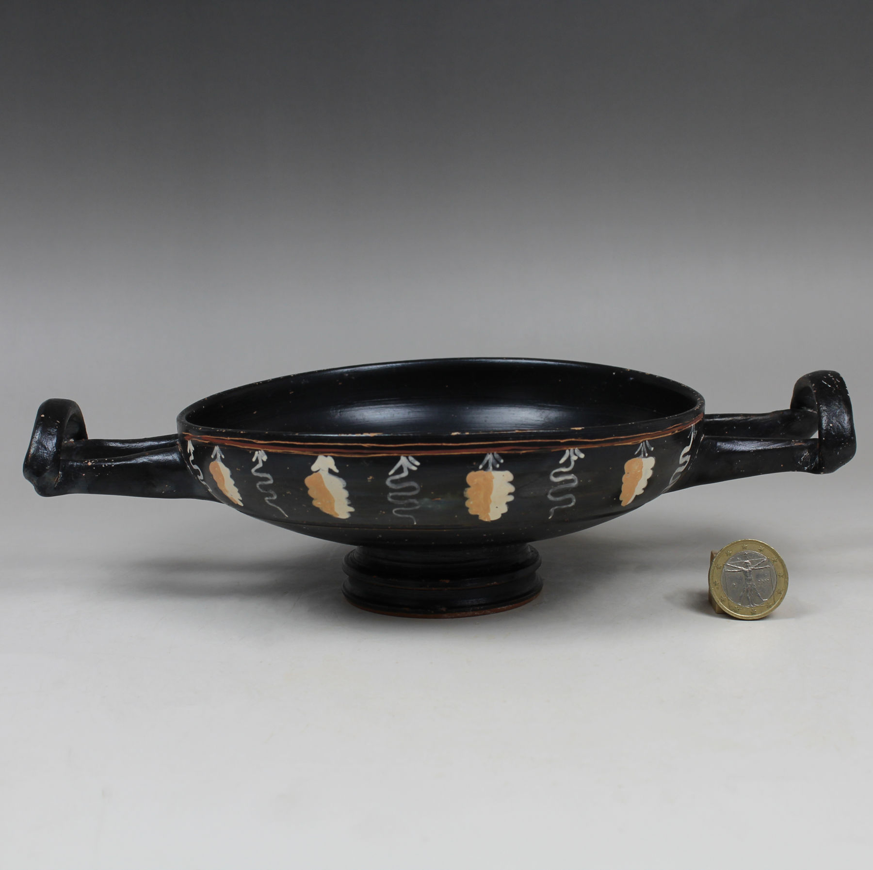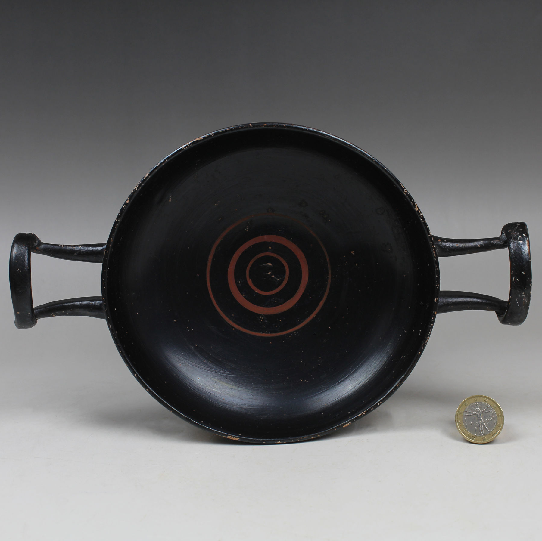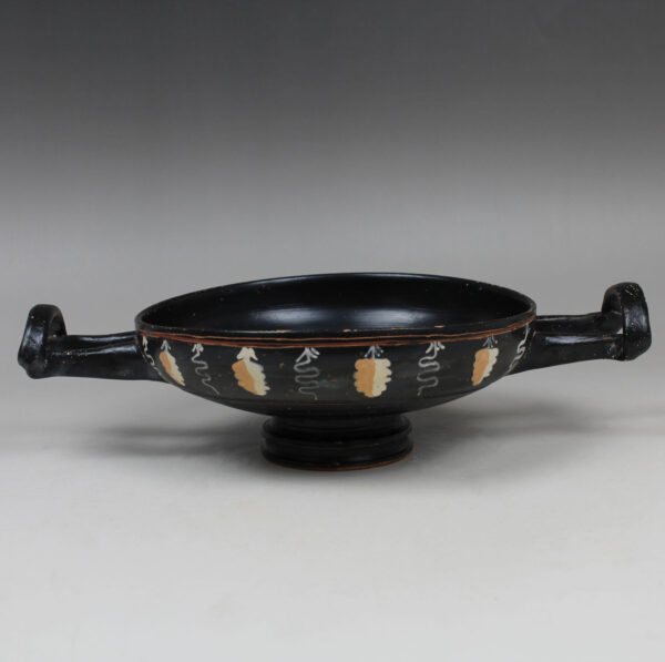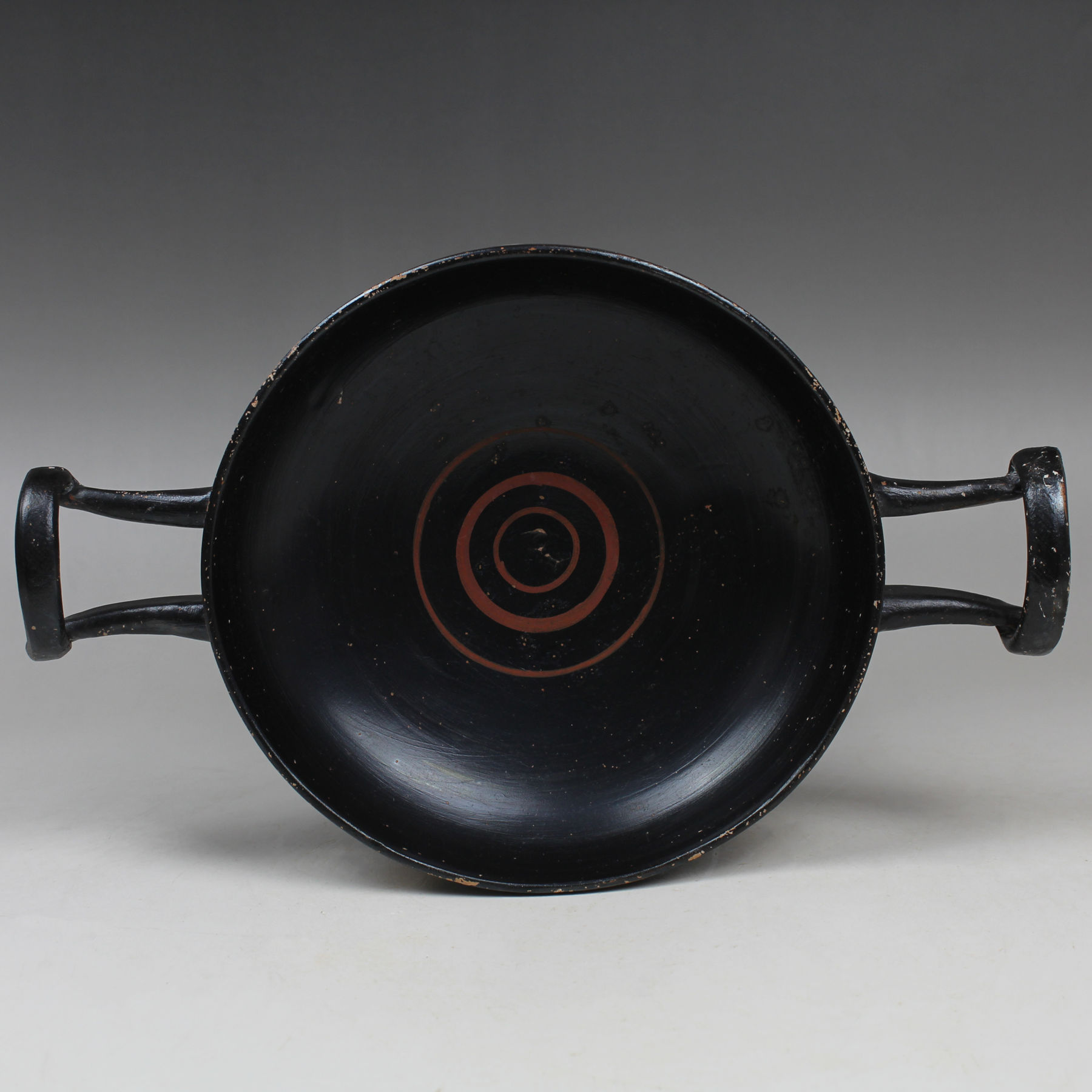 The kylix is a type of ancient Greek drinking cup with a shallow, broad bowl and a pair of horizontal handles attached to the sides. Popular from the 6th to the 4th centuries BCE, kylixes were commonly used in symposia, social gatherings where men would come together to drink wine, converse, and partake in various entertainments. The distinctive shape of the kylix allowed for easy handling and drinking while reclining on couches, which was the customary posture during these gatherings. The interior of the bowl often featured red-figure or black-figure decoration, showcasing scenes from daily life, mythology, or symposium-related activities. Some kylixes also had inscriptions or dedications that provided additional context.