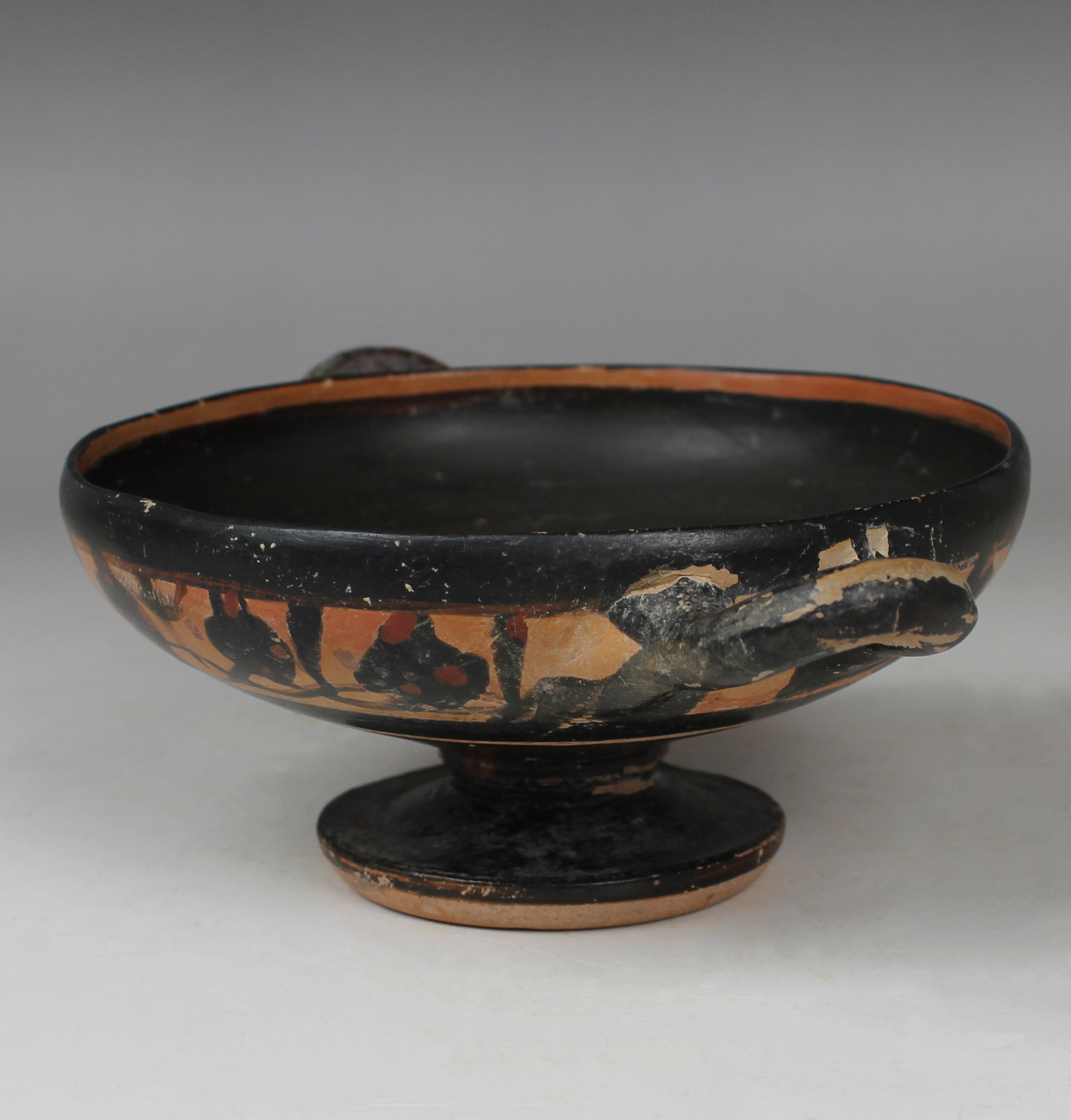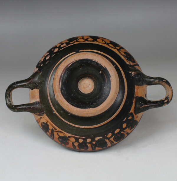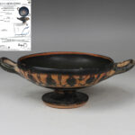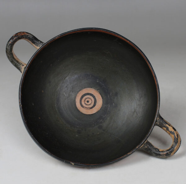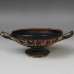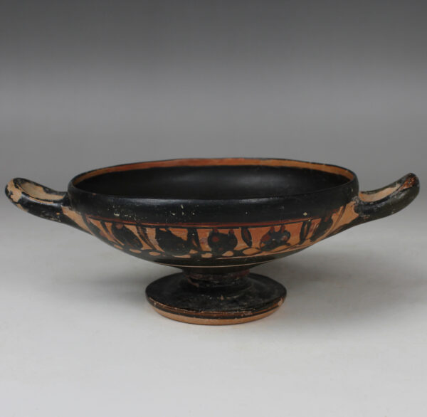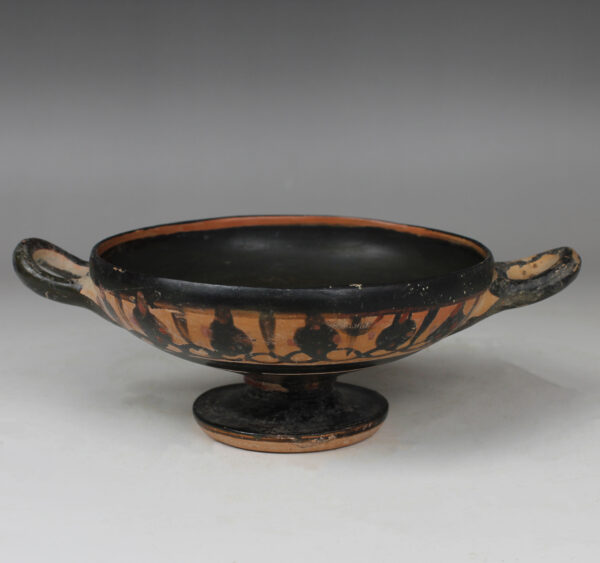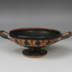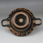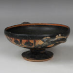 The Greek kylix is a type of shallow drinking cup that was popular during the Archaic and Classical periods of ancient Greece, from the 6th to the 4th centuries BCE. Kylikes were typically made from clay and featured a wide, shallow bowl with two horizontal handles known as “”ear”” handles. These handles allowed the cup to be easily lifted and shared among drinkers during symposia, social gatherings where men would drink wine, converse, and engage in intellectual and recreational activities.