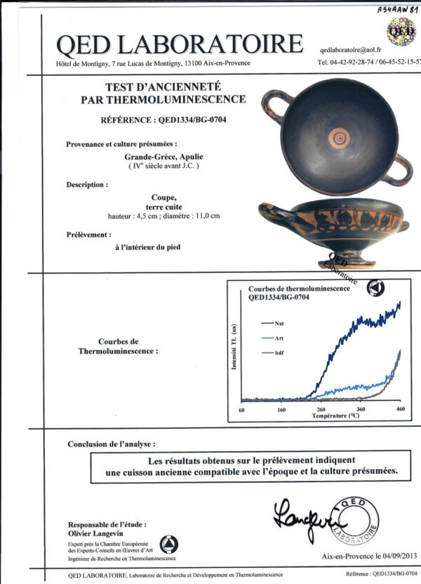 | CONDITION | Good condition, repaired. Includes Thermoluminescence test by QED Laboratoire (Reference QED1334/BG-0704) |