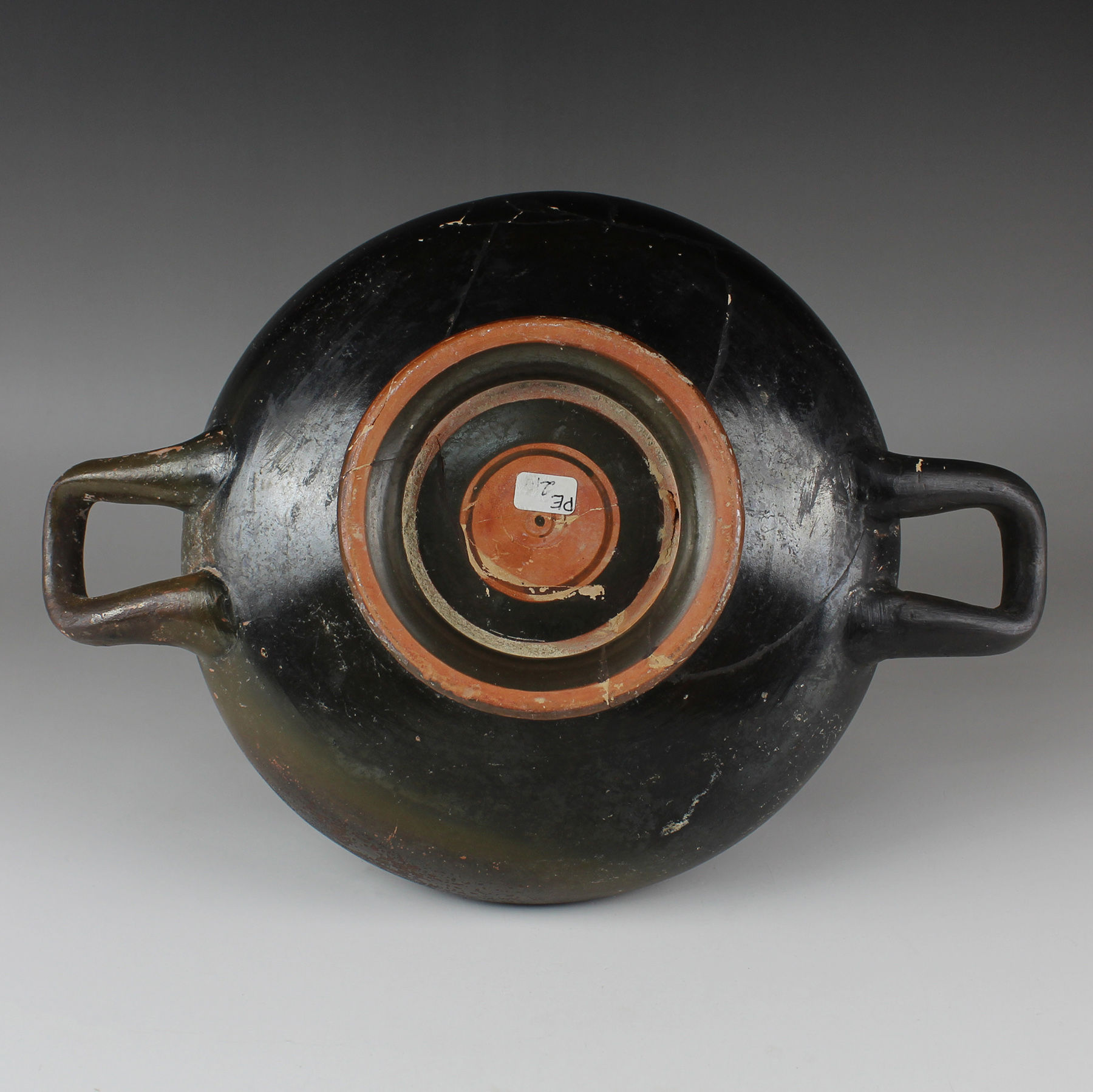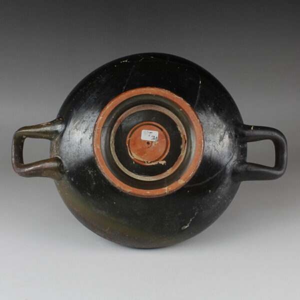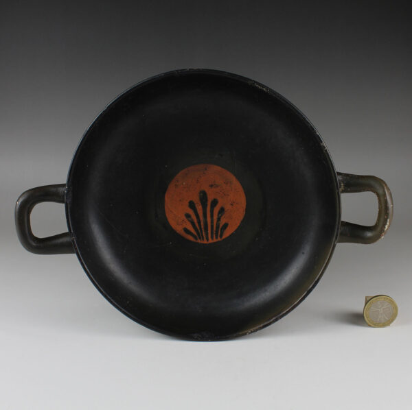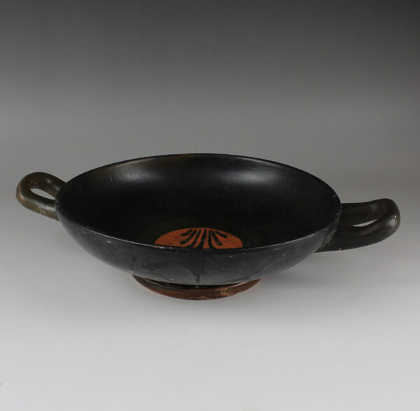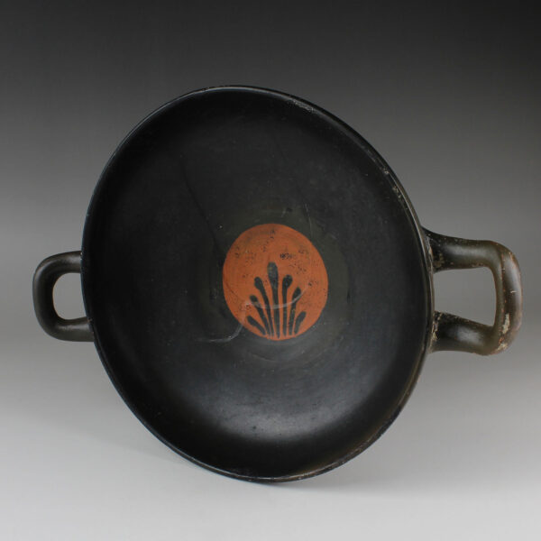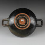 The almost flat interior circle of the base of the cup, called the tondo, was generally the primary surface for painted decoration in the black-figure or red-figure pottery styles of the 6th and 5th century BC, and the outside was also often painted. As the representations would be covered with wine, the scenes would only be revealed in stages as the wine was drained. They were often designed with this in mind, with scenes created so that they would surprise or titillate the drinker as they were revealed.