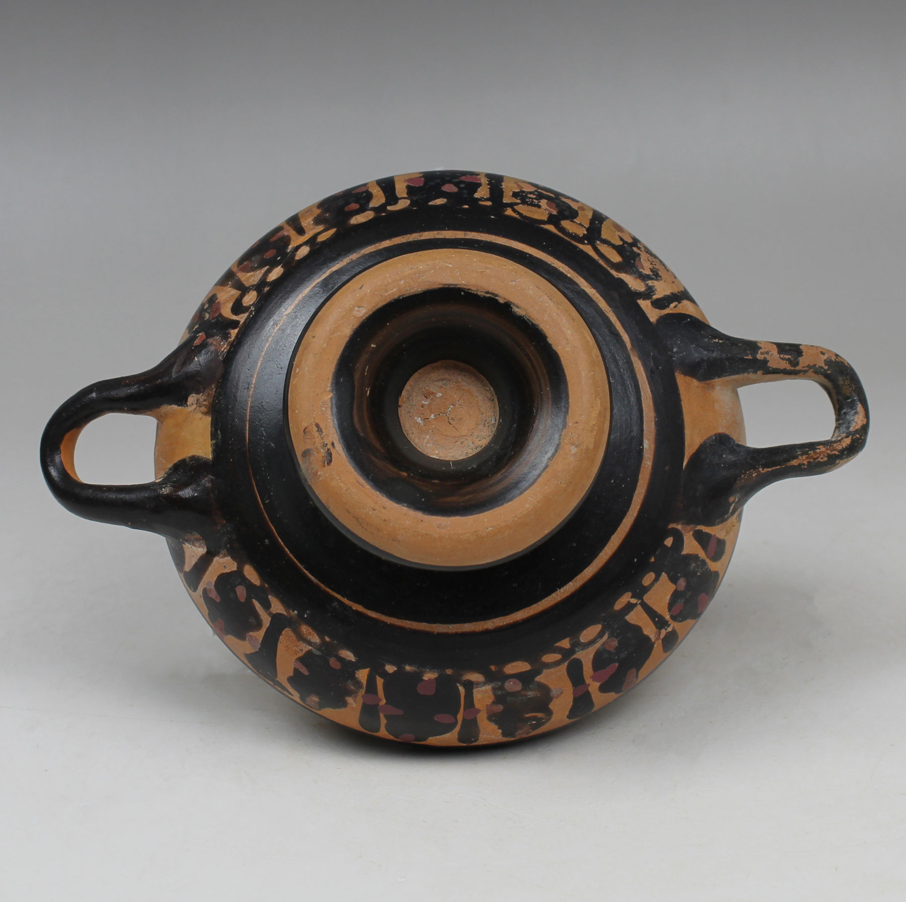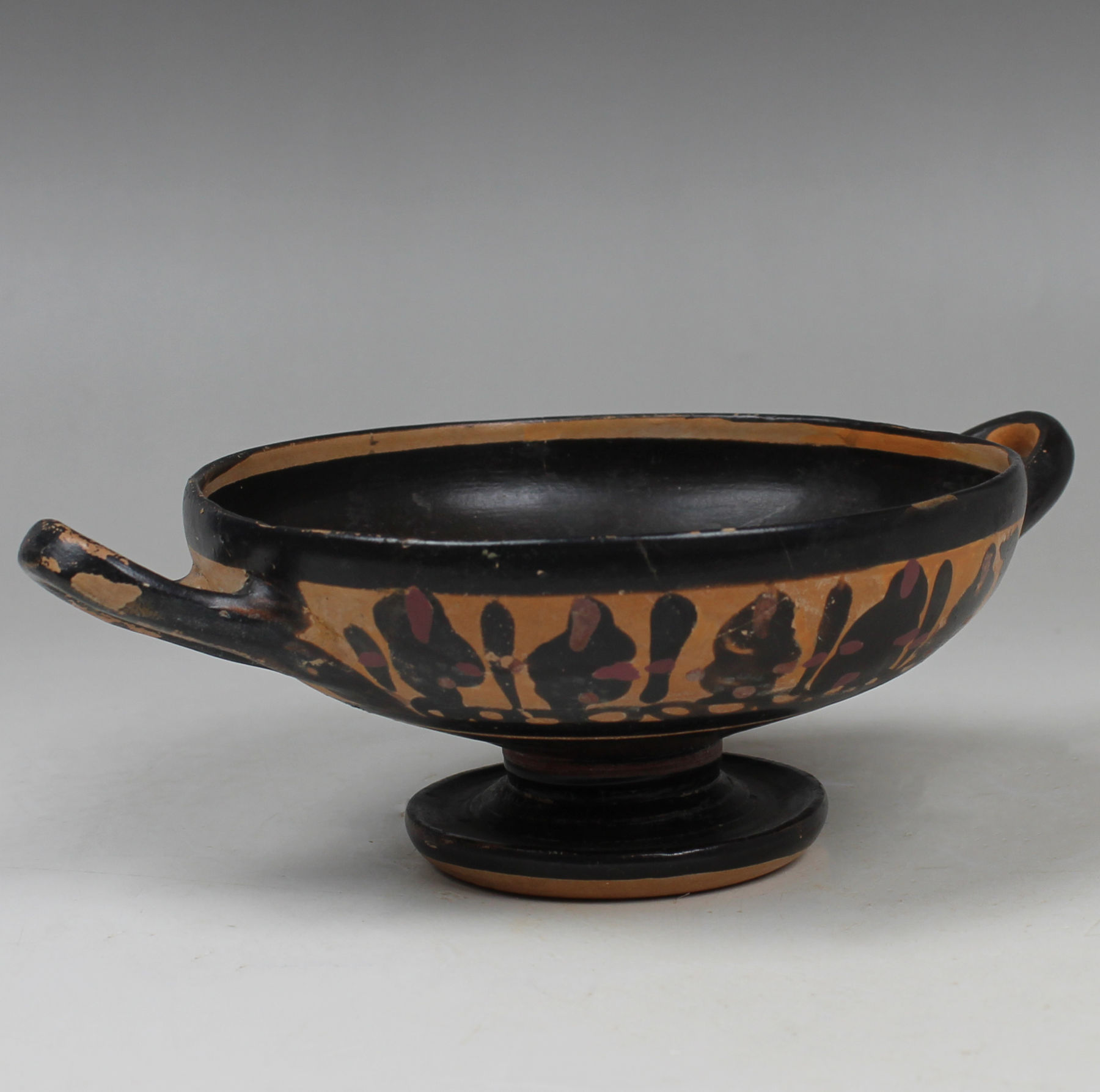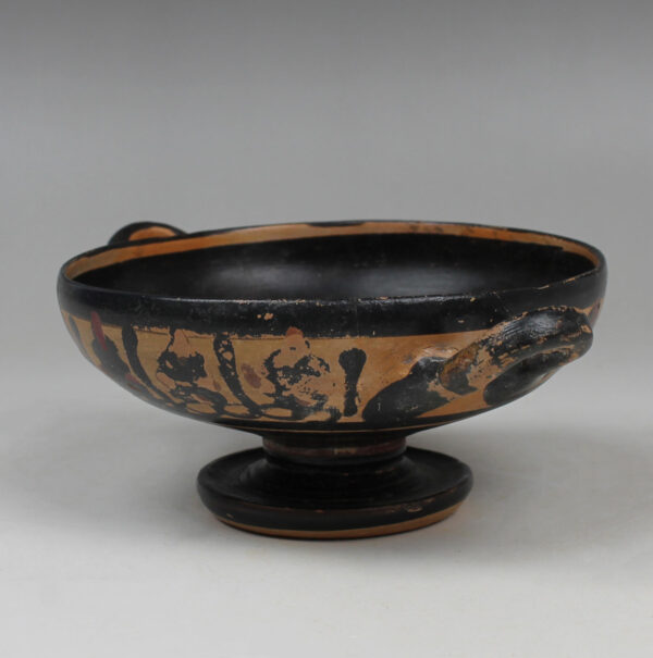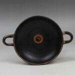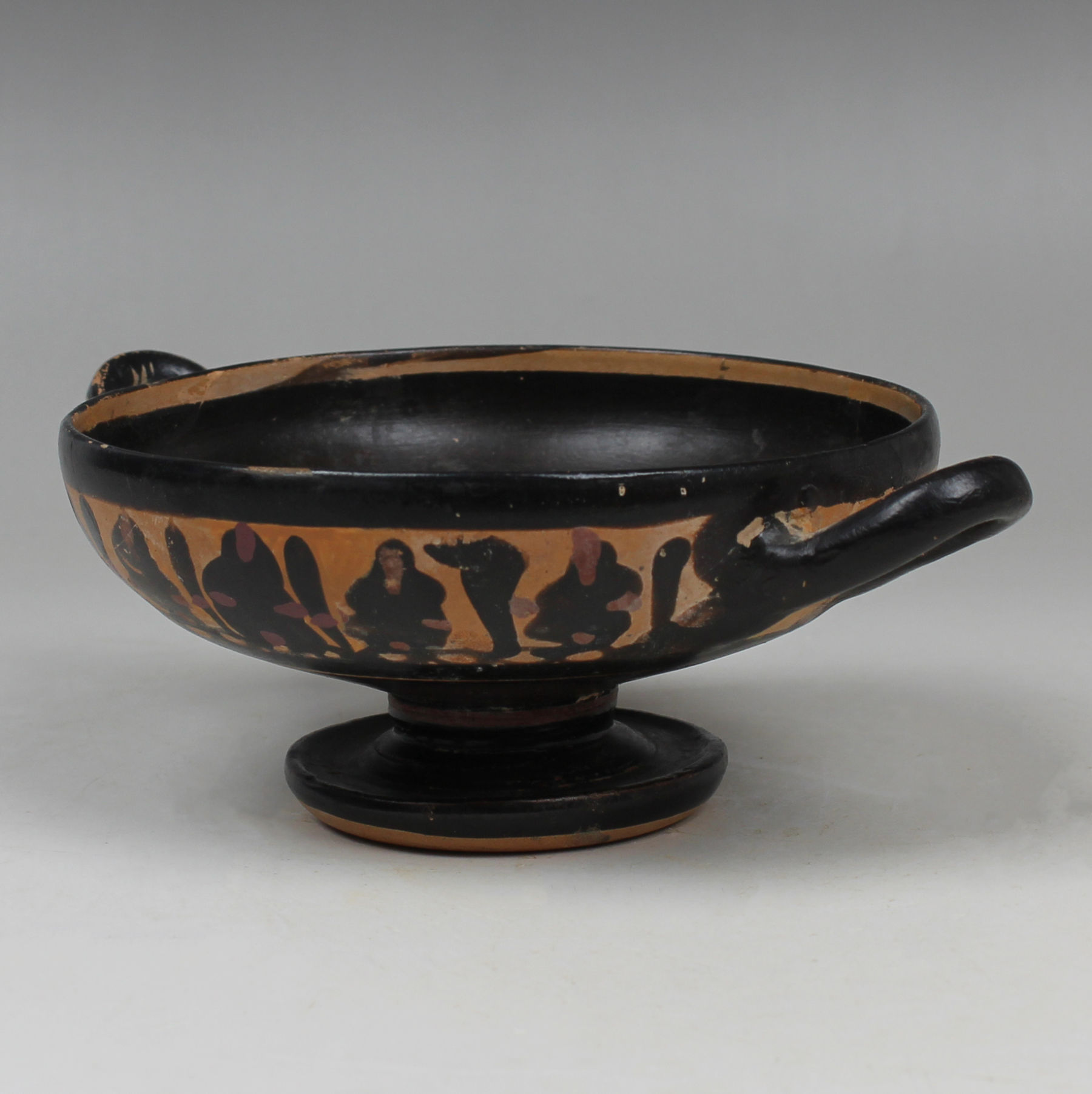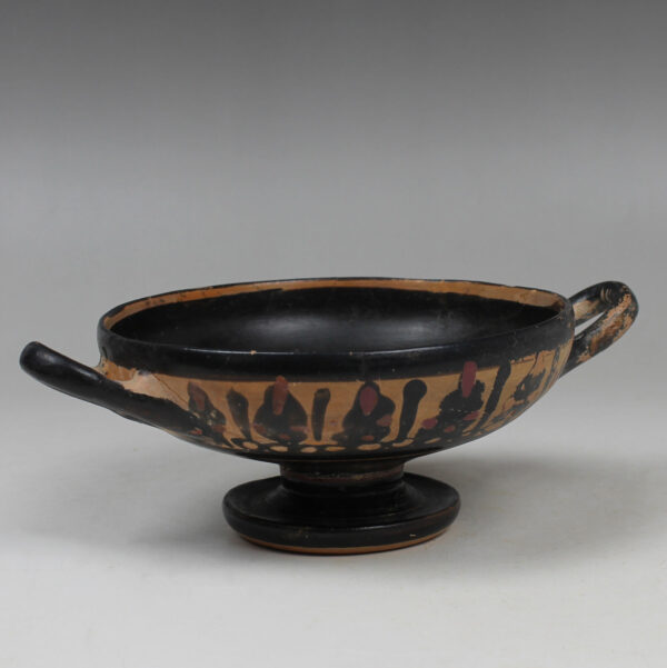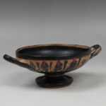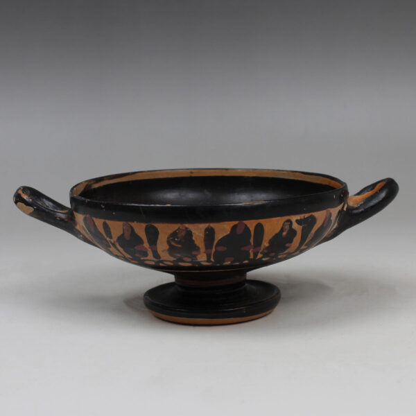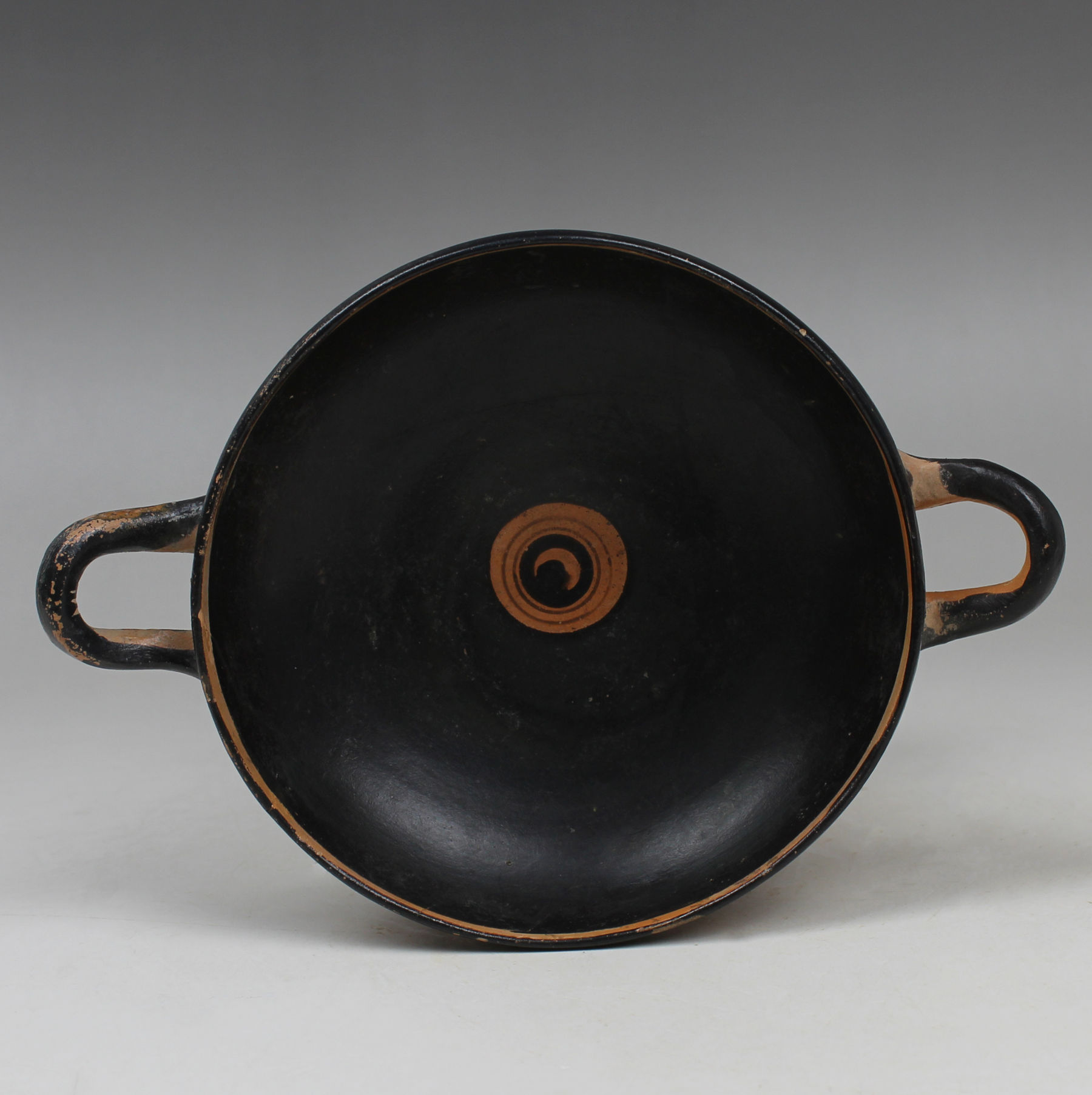 The kylix is a distinctive ancient Greek drinking cup that gained popularity from the 6th to the 4th centuries BCE. Characterized by a shallow, broad bowl and horizontal handles on either side, the kylix was a staple in symposia, social gatherings where men reclined on couches, enjoying wine, conversation, and entertainment. The form of the kylix allowed for easy handling and sipping while reclining. Often decorated with red-figure or black-figure scenes on the interior, these depictions ranged from everyday life to mythological narratives, providing visual interest and topics for discussion during the symposium. The kylix was not only a functional vessel but also a canvas for artistic expression and cultural representation in ancient Greece.