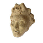 | DESCRIPTION | Large lidded eyes, exaggerated arching brows, open mouth, hollow to the interior, and rounded dimpled chin, the curly hair bound by fillet, with two short curving horns emerging, and attachment hole either side of central berry |