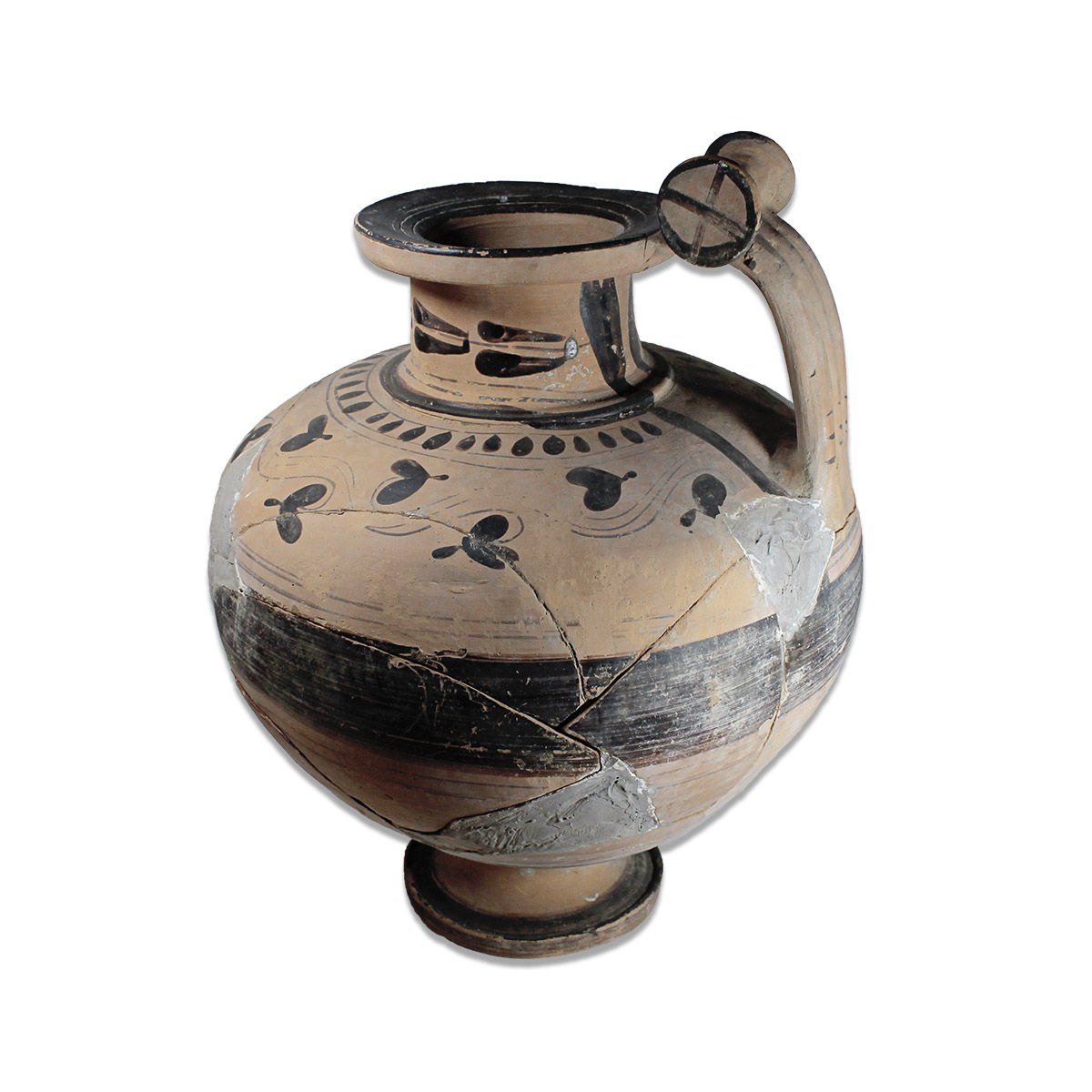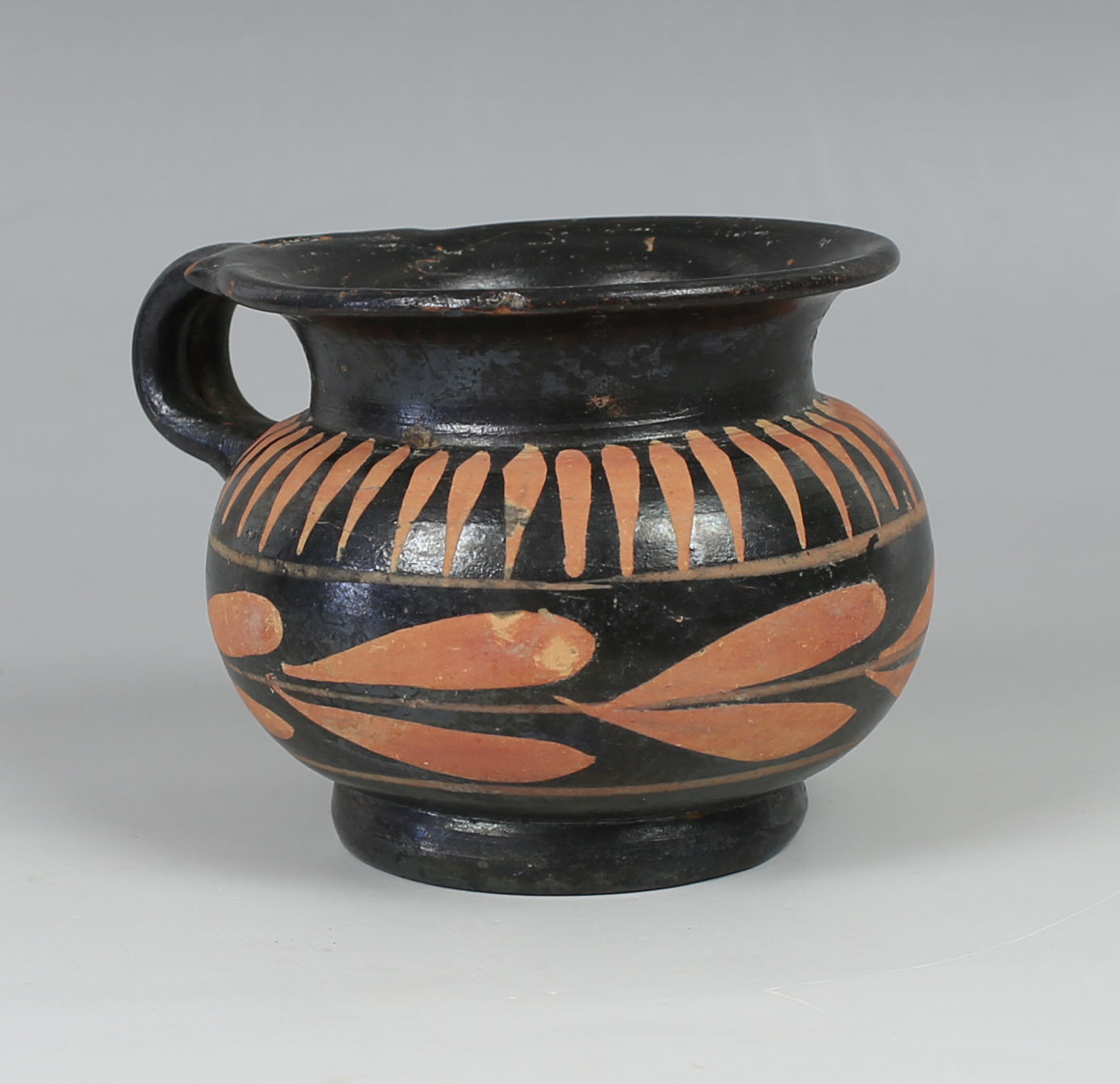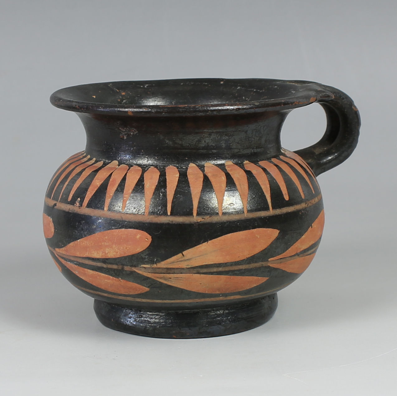Xenon ware olpai were typically decorated with simple yet elegant motifs in added white, yellow, or red over the black-glaze surface. Common decorations included wreaths, laurel branches, rosettes, or geometric borders, often carefully placed around the shoulder or neck of the vessel. Unlike the highly narrative red-figure pottery, Xenon ware was more restrained, focusing on refinement and balance rather than complex mythological scenes. The result was a vessel that emphasized elegance and function, suitable for both everyday use and as a fine banquet piece for the elite.