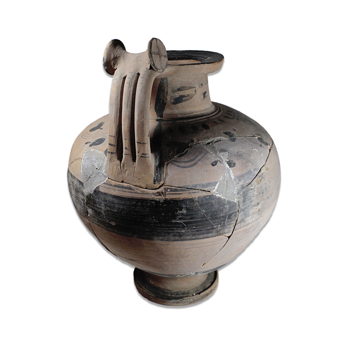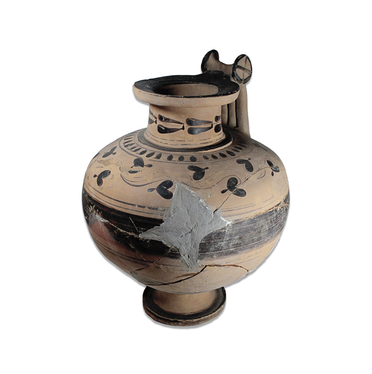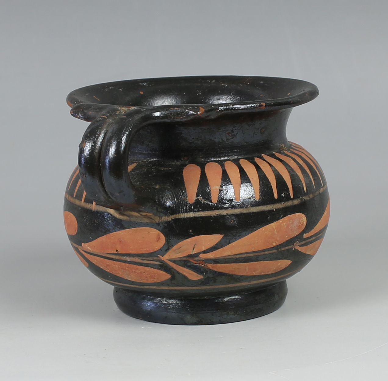 Xenon ware olpai were typically decorated with simple yet elegant motifs in added white, yellow, or red over the black-glaze surface. Common decorations included wreaths, laurel branches, rosettes, or geometric borders, often carefully placed around the shoulder or neck of the vessel. Unlike the highly narrative red-figure pottery, Xenon ware was more restrained, focusing on refinement and balance rather than complex mythological scenes. The result was a vessel that emphasized elegance and function, suitable for both everyday use and as a fine banquet piece for the elite.
