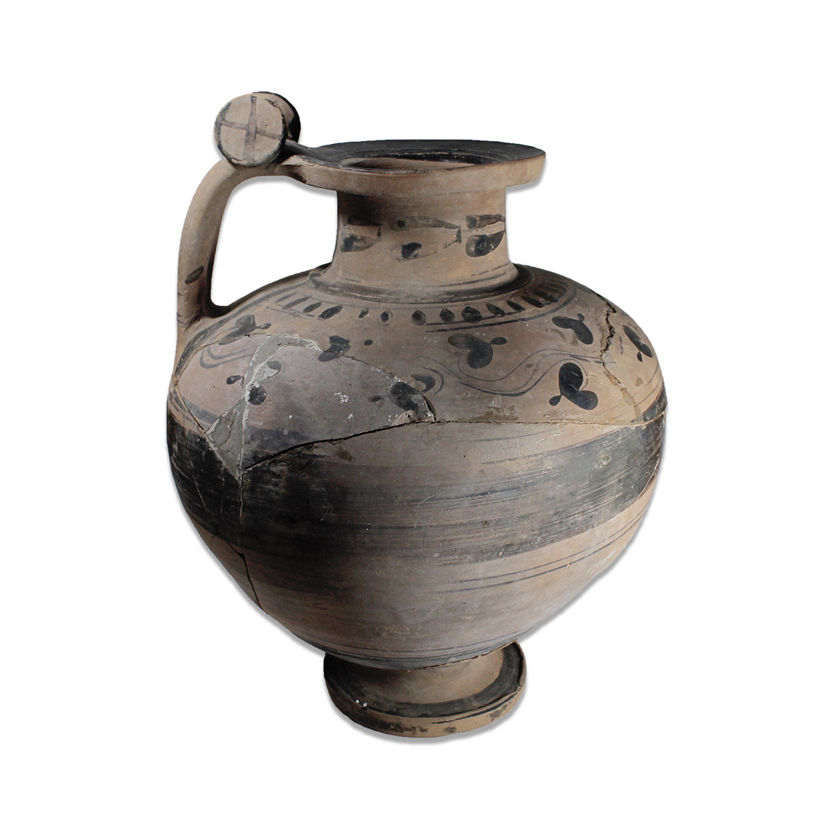 The olpe is a type of Greek jug characterized by its round or slightly elongated body, a continuous profile (without a sharp angle between neck and body), and a single vertical handle rising above the rim. It was primarily used for pouring wine or water, often at symposia, and served a similar function to the oinochoe but with a more cylindrical or smooth, flowing shape. In the 4th century BCE, a distinctive style known as Xenon ware appeared in South Italian workshops, especially in Apulia. This ware is named after a vase in the Berlin Antikensammlung bearing the inscription “XENON” and is recognized by its pale clay and delicate black-glaze decoration.