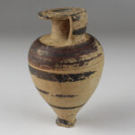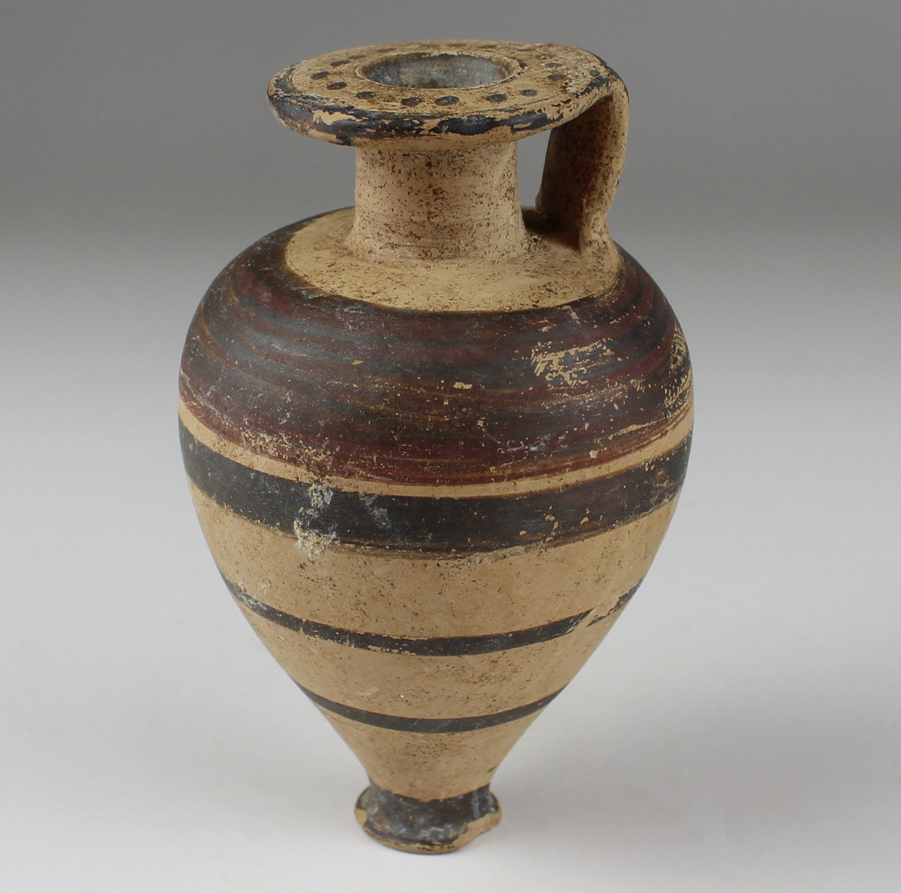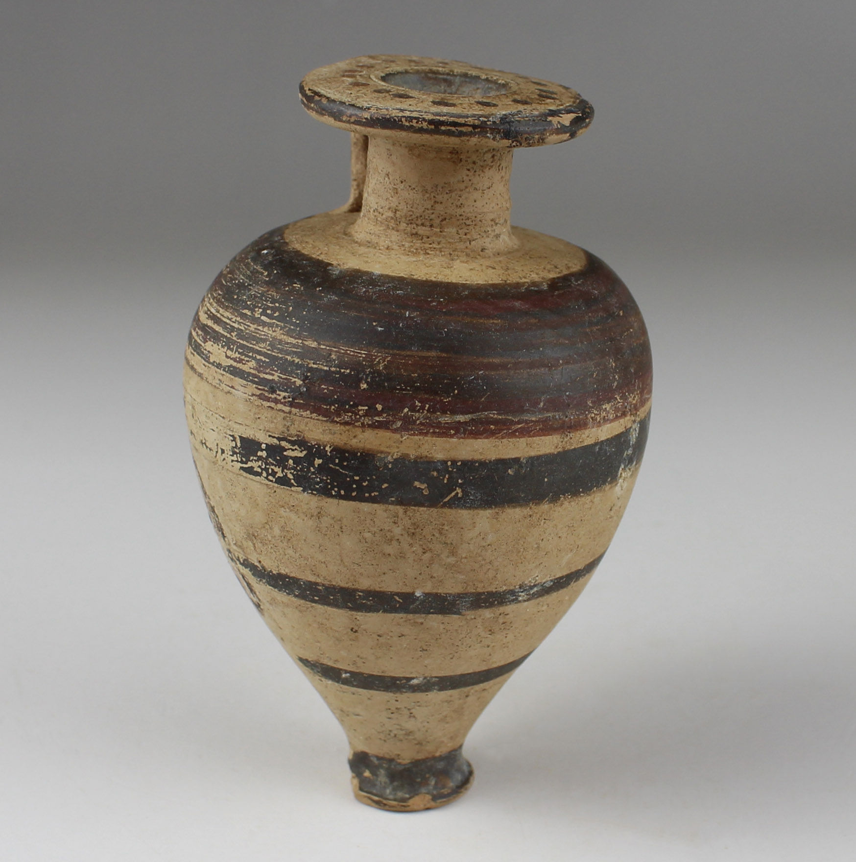 Aryballoi are common in Corinthian ware, some being tiny and meticulously decorated. Examples are less widespread in Athenian, although the shape is depicted on vases or funerary stelai, either hanging up, often with a strigil or sponge in an athletic setting, or being used by the athletes themselves.