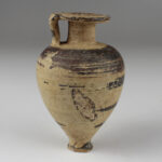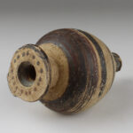 In Corinth and East Greece, warrior’s heads, animals, and other mould-made figures could serve as the body of aryballoi. Athenian potters sustain the habit, and there are examples in the form of female heads, shells, even genitals.