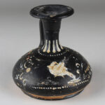 In the early sixth-century, the lekythos has an oval-shaped body, but as with the hydria and neck-amphora, a shouldered-type is developed around the middle of the century. This form, with a tapering body, continues to be decorated by black-figure painters. But it is the cylindrical type, first preserved from the last third of the sixth-century, that will be predominant in the fifth century, and it is this form that is decorated with polychrome figures on white-ground. Fragmentary examples (and X-ray photography) reveal that some had a smaller inner chamber, to limit the volume of oil that could be held.