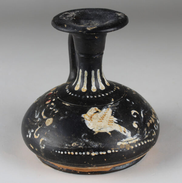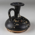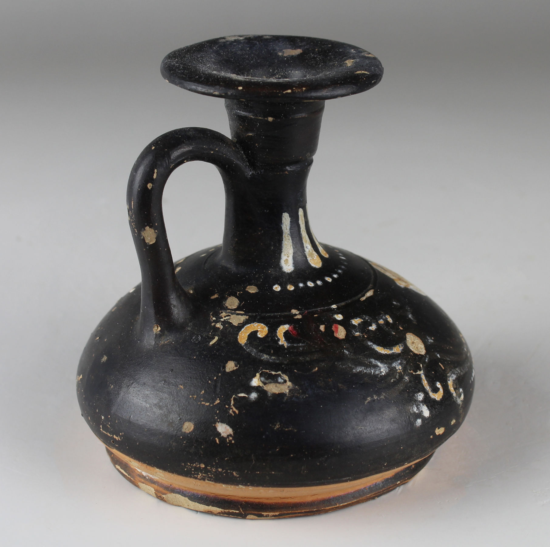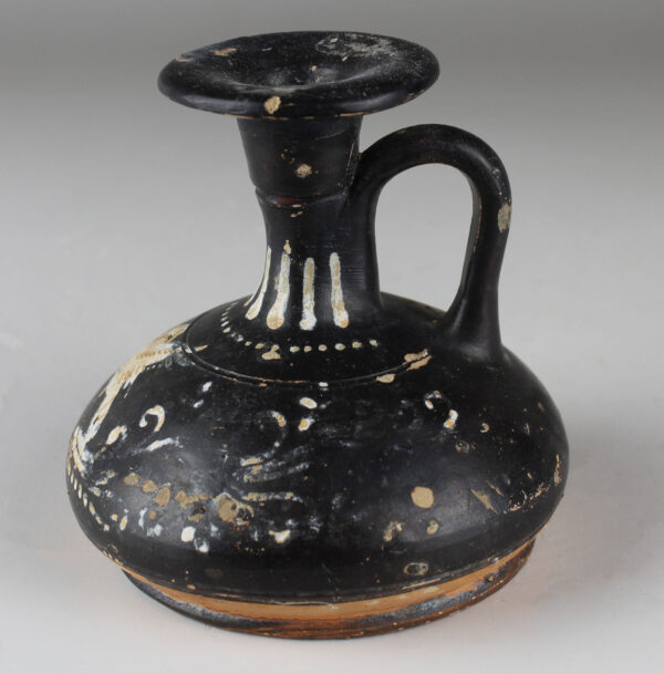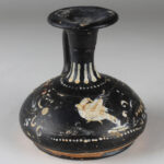 The broad-footed squat lekythos lacks the sharp shoulder of the cylindrical type. It begins to be made late in the fifth century.