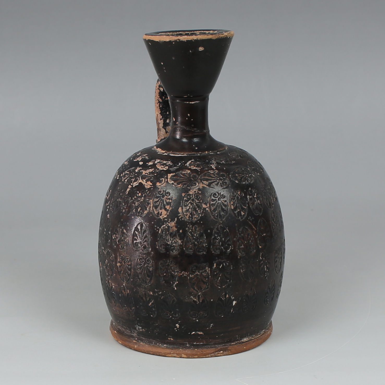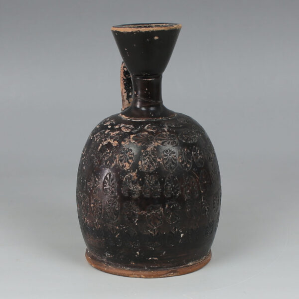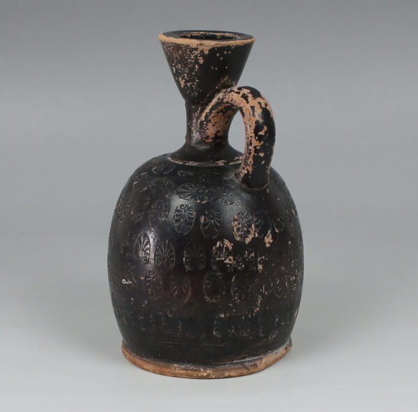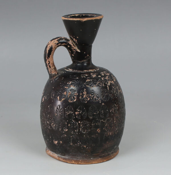 These vessels were typically painted using the black-figure or red-figure techniques, depending on their period and regional origin. The palmette designs were rendered with precision, often accompanied by lotus flowers or scrolls, emphasizing the Greek appreciation for stylized natural forms. The careful placement of such motifs, even on small objects, reflects the high aesthetic standards of ancient Greek pottery workshops and their mastery of pattern and proportion.