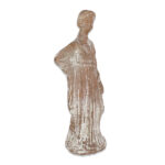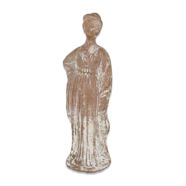 The Tanagra statuettes were a type of casting mould for Greek terracotta figures produced from the end of the 4th century BC, mainly in the town of Tanagra in the region of Boeotia, which has given its name to the whole class. They were coated with a liquid white layer before firing and sometimes painted later with naturalistic dyes such as watercolours, one example being the famous “Lady in Blue” now in the Louvre. They were widely exported around the ancient Greek world. These figures were made in many other places in the Mediterranean, such as Alexandria, Taranto in Magna Graecia, Centuripe in Sicily and Mirina in Mysia.