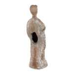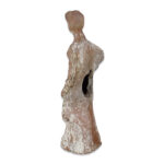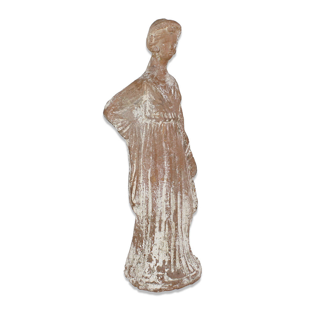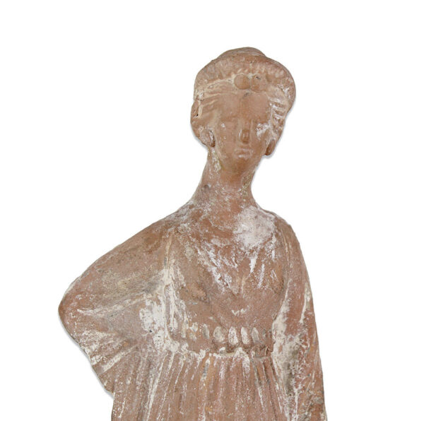 Although they are not portraits, Tanagra’s figures represent real women, and some men and children, in everyday costumes, with family accessories such as hats, crowns or fans. There are some character figures that may represent figures from Menander’s New Comedy and other writers. Other figures continued an earlier tradition of moulded terracotta figures that were used as cult images or votive objects. Typically they are between 10 and 20 centimetres high.